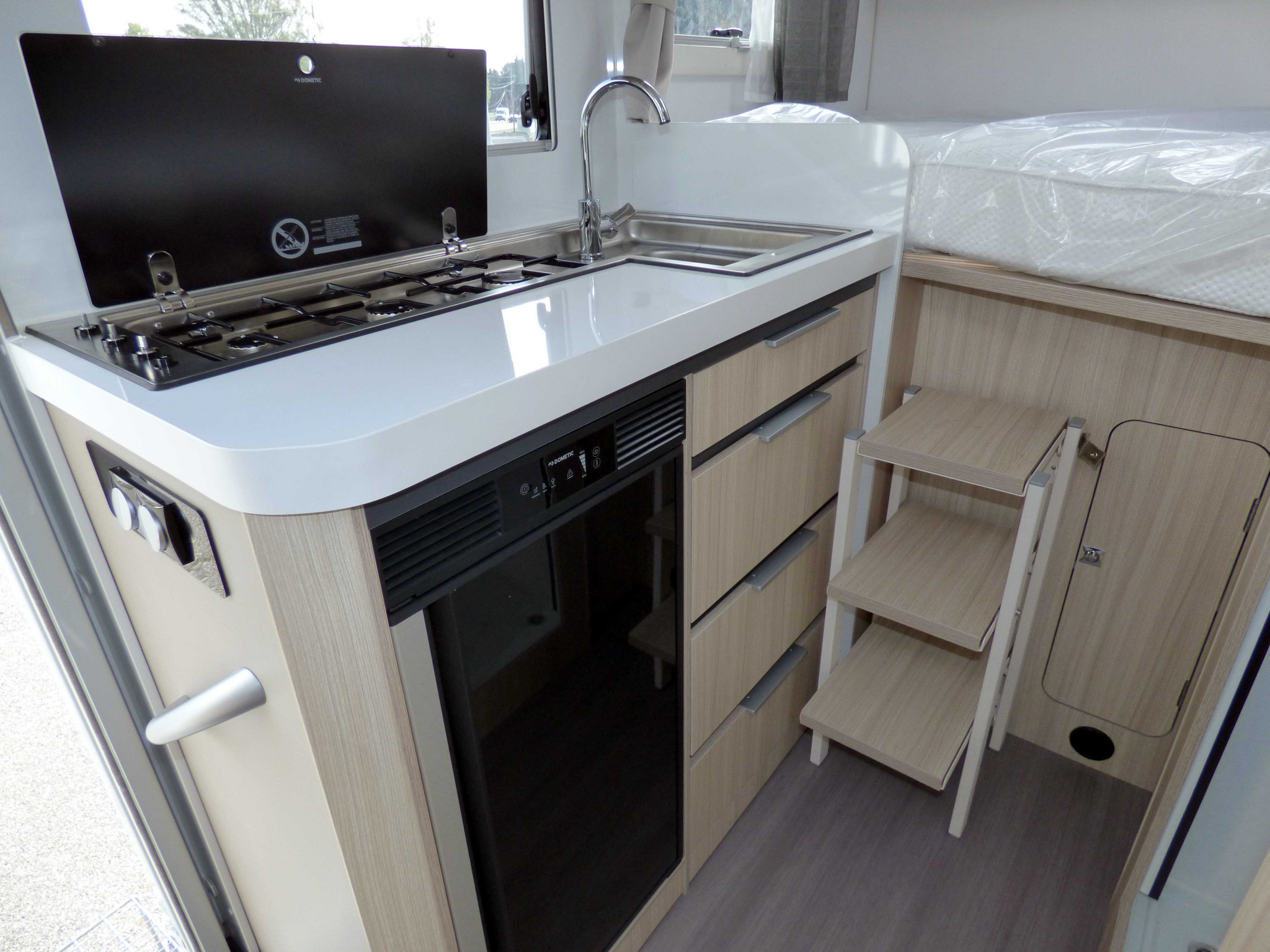 Nouveau bloc cuisine, cabinet de toilette / douche modulable, mobilier aux formes galbées, c''est toute la personnalité de la marque Adria qui s''exprime sur ce COMPACT.