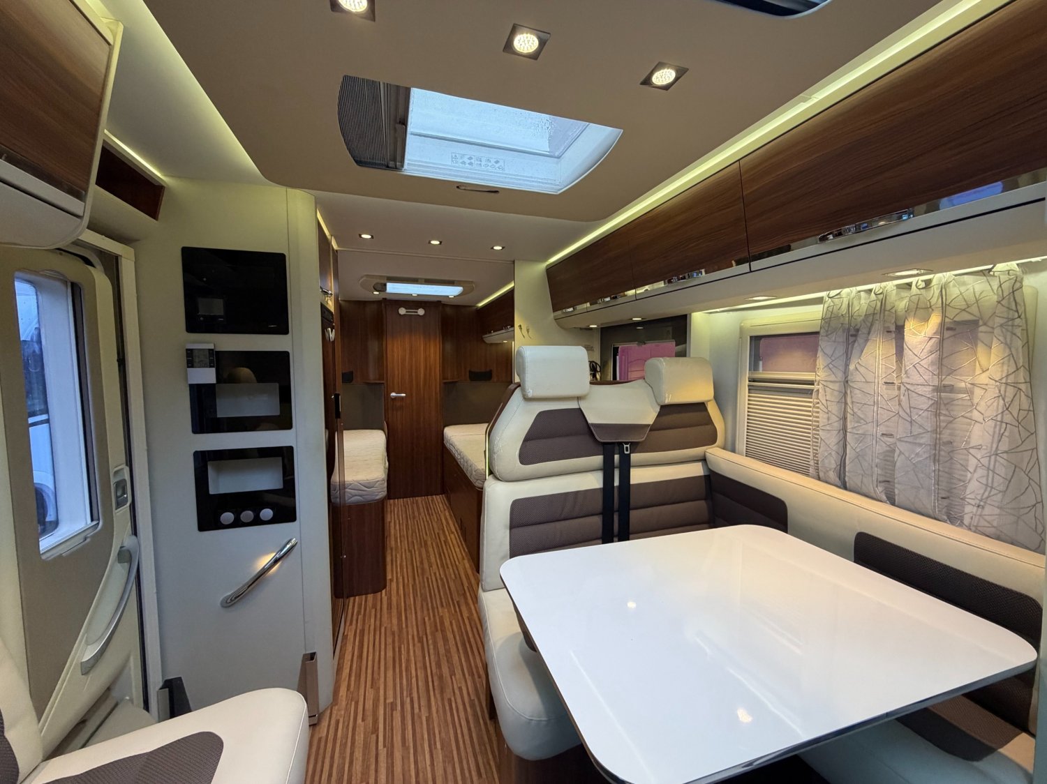 Profilé en vers lits jumeaux, possible 3 couchages, très bien équipé, chauffage Alde, intérieur fonctionnel, beaucoup de rangements.