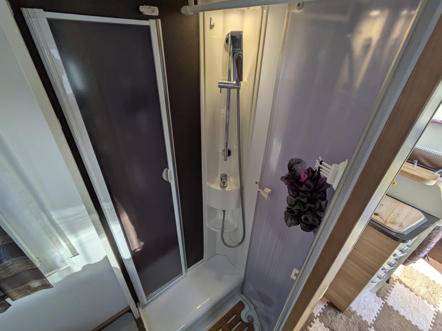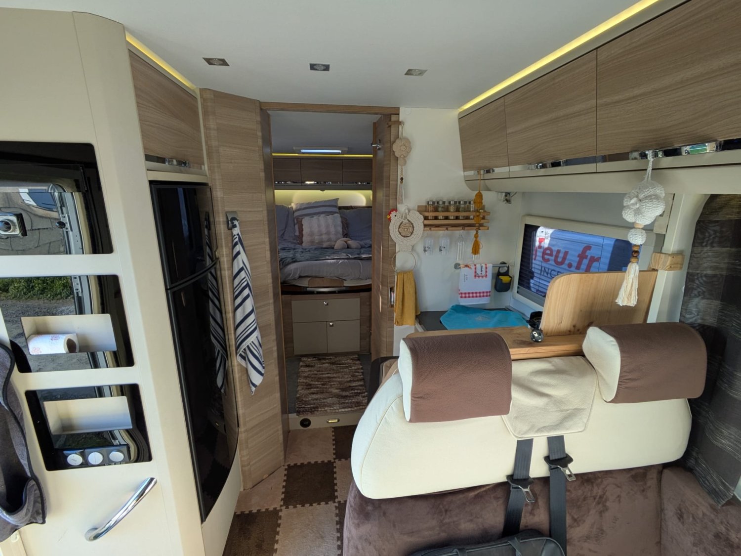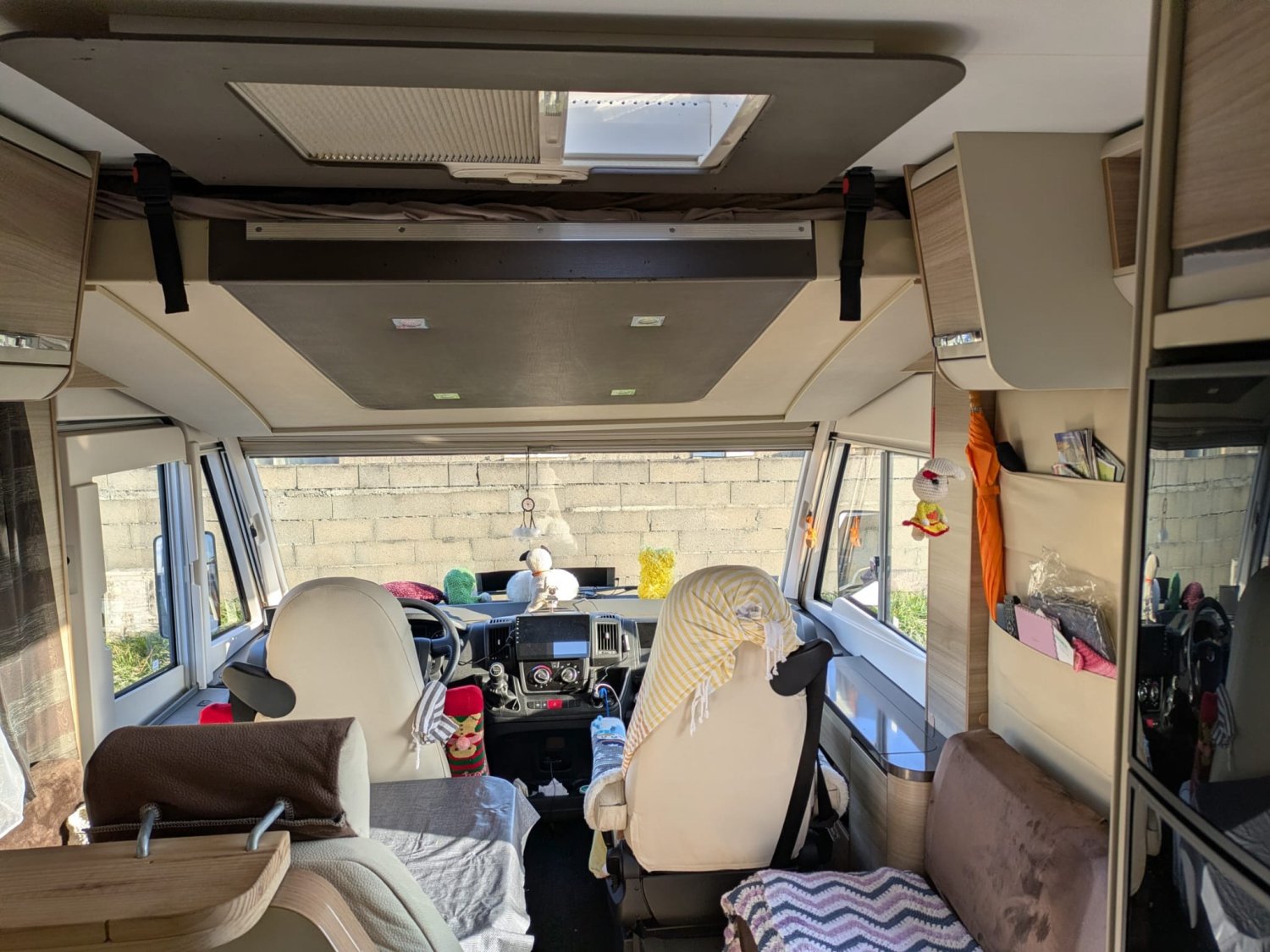 Ses équipements — climatisation 220V, suspension pneumatique, parabole automatique, attelage, porte‑vélo — renforcent son confort et sa polyvalence.