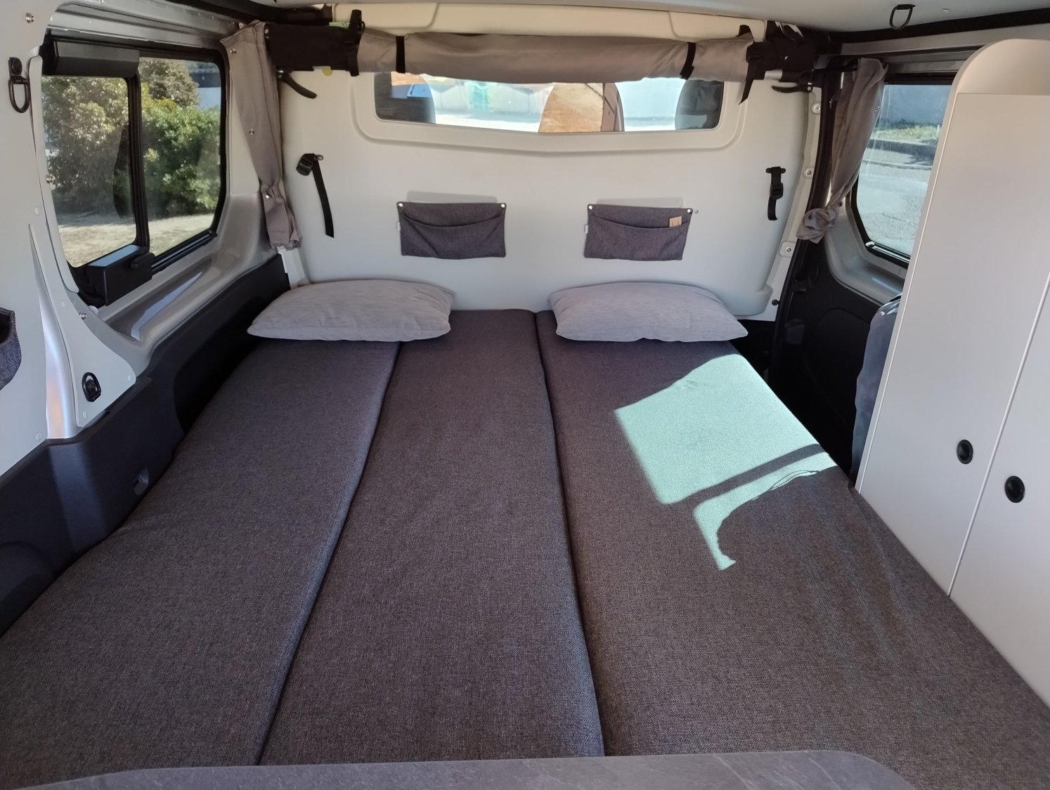 La banquette arrière se transforme rapidement en grand lit double confortable pour 2 personnes de 130 x 190. Un couchage d’appoint pour de jeunes enfants est possible.