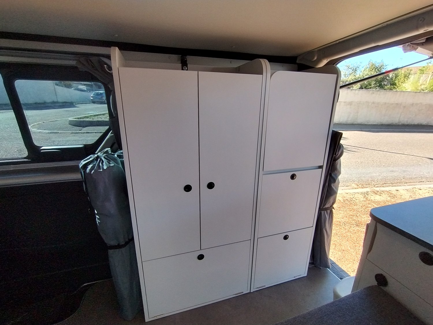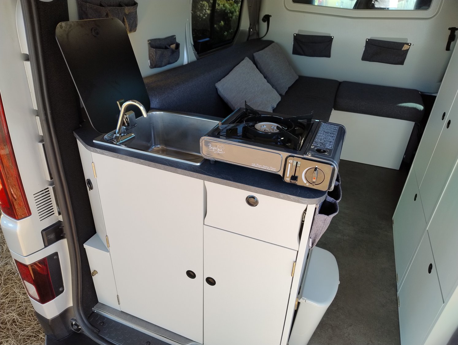 Côté cuisine tout y est ; évier avec réserve d’eau propre et grises, réfrigérateur tiroir de 30L et gazinière amovible. Le tout associé à d’astucieux rangements pour ce gabarit ! Un espace douche se découvre sous le hayon arrière avec une douchette extérieure et un rideau amovible.