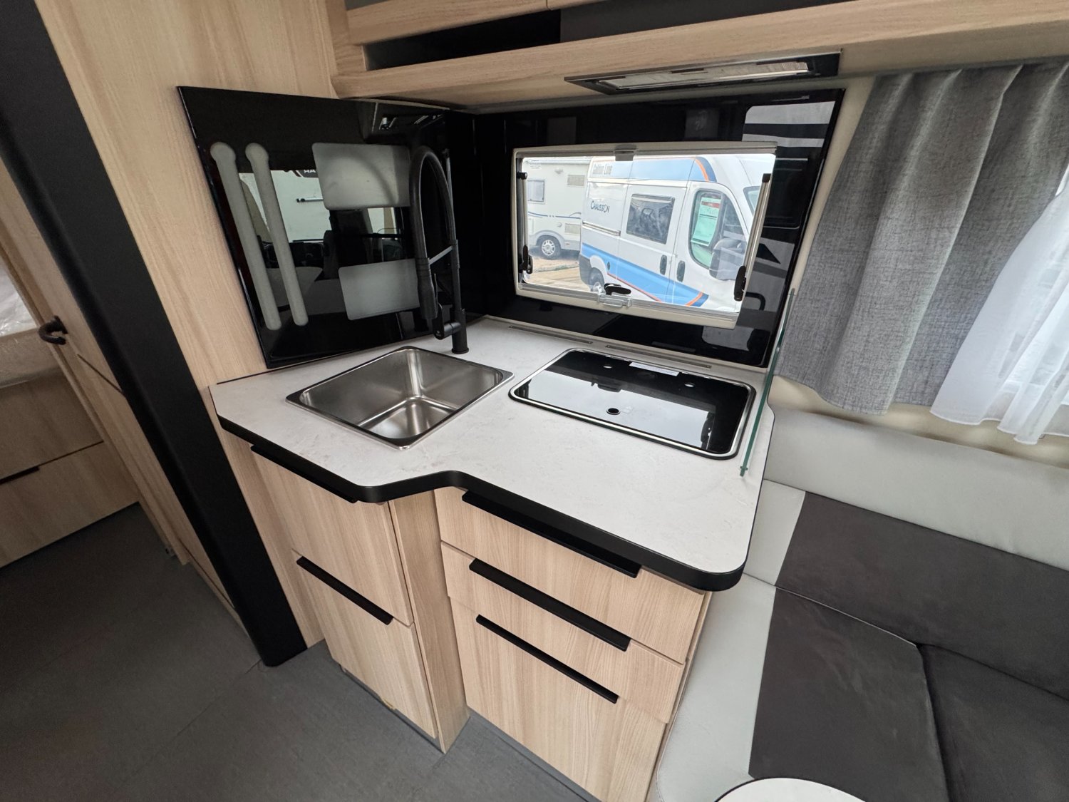 À l'intérieur de cette véritable maison sur roues, vous voyagez sereinement tout en conservant vos habitudes. grand lit central XXL, salon face à face et belle cuisine avec tiroirs à fermeture centralisée. A venir découvrir chez Libertium Toulon.