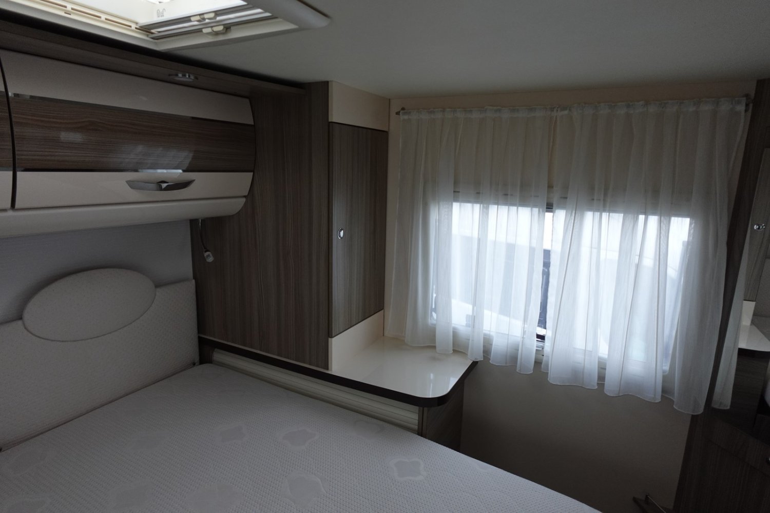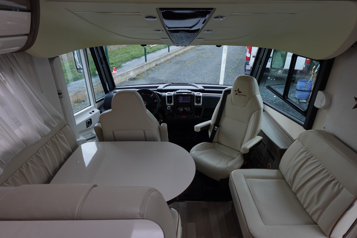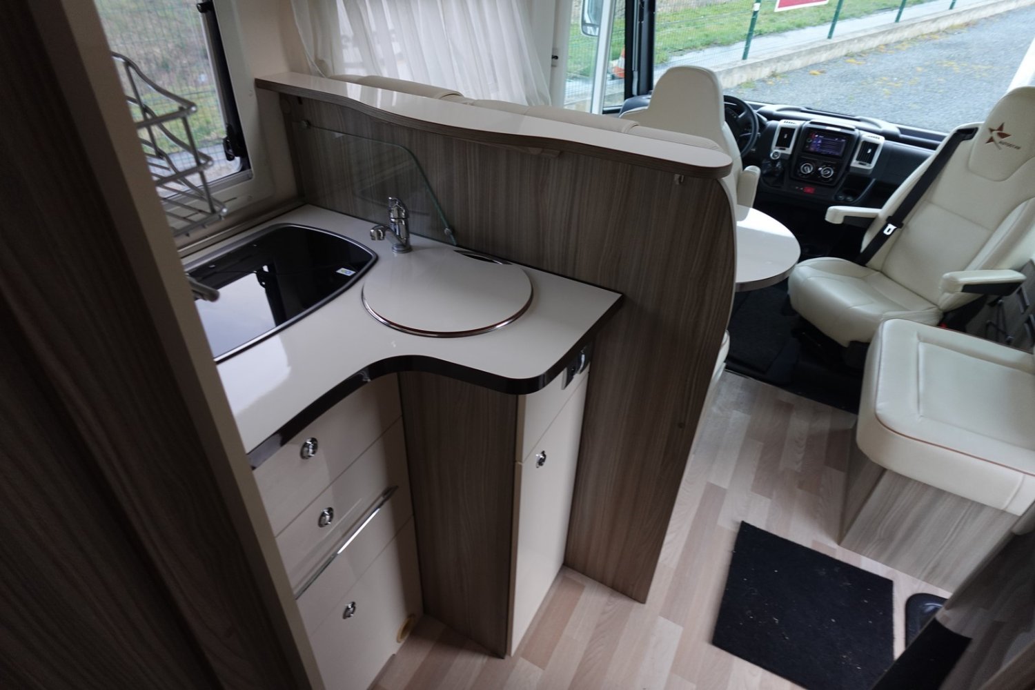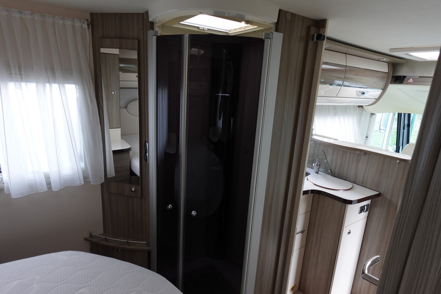 Magnifique intégral comprenant un lit central réglable en hauteur, une douche indépendante de l’espace WC/lavabo, une cuisine en L avec de nombreux rangements, un lit de pavillon et un salon avant panoramique.
