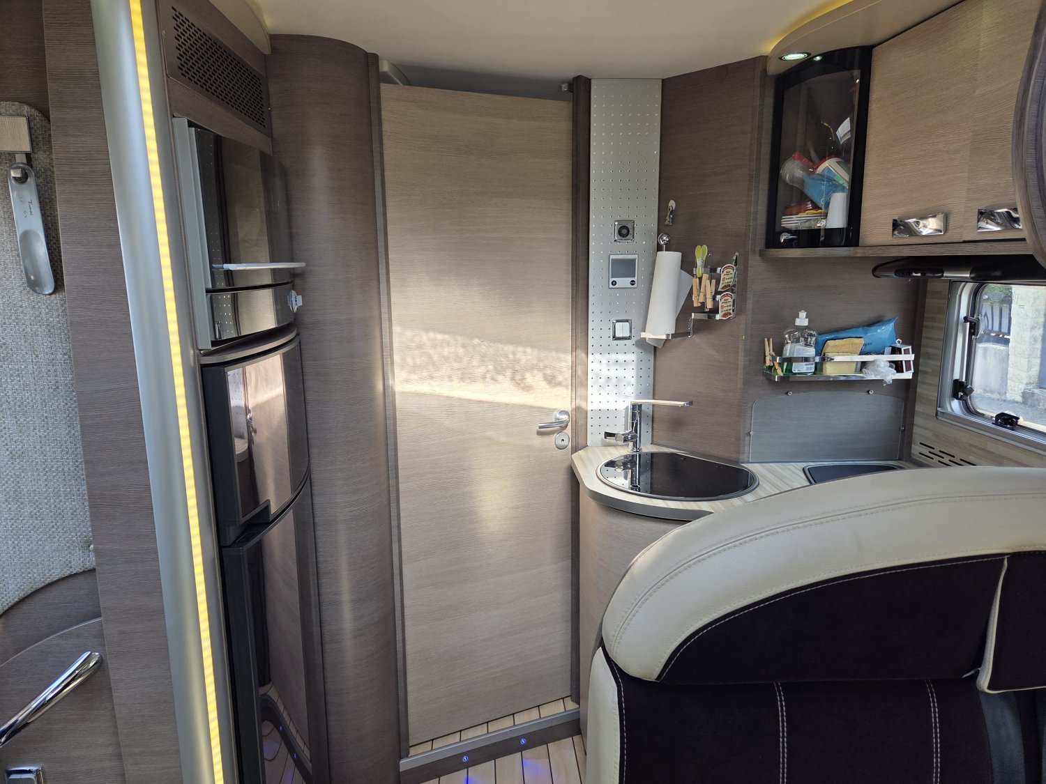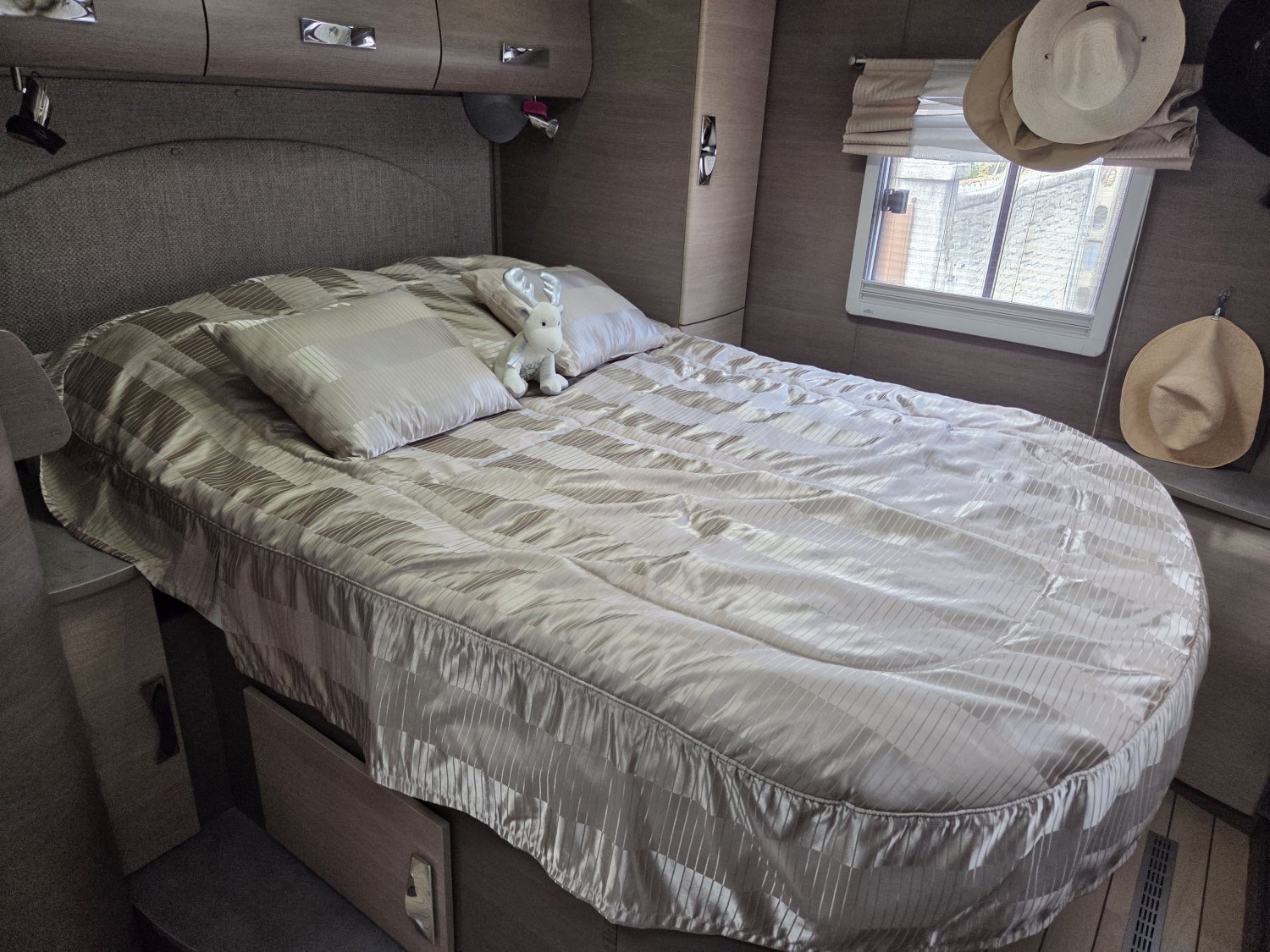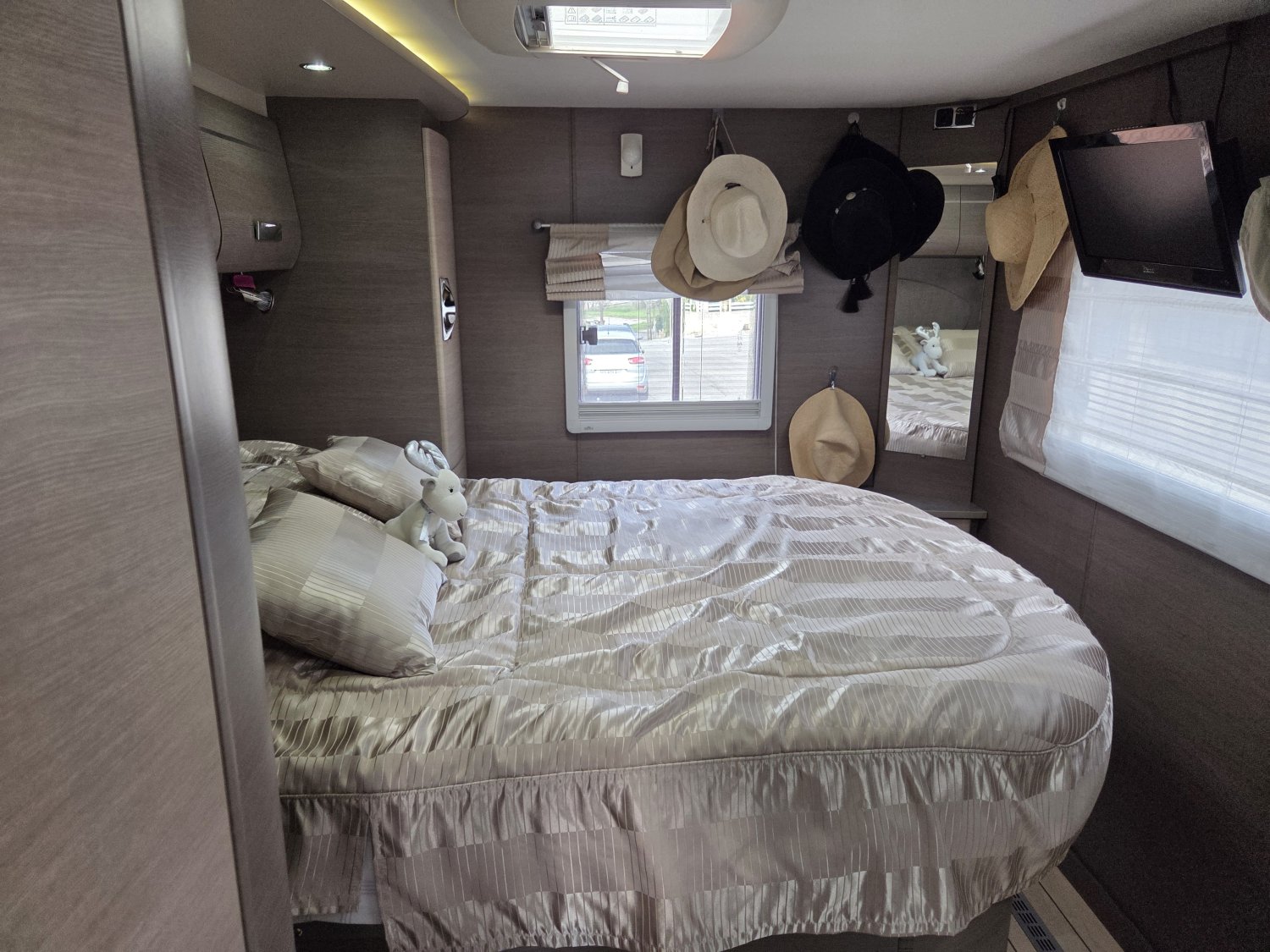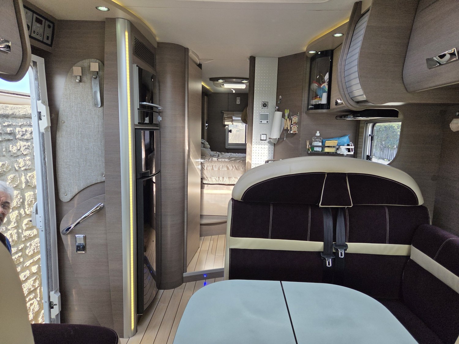 Son agencement spacieux et lumineux propose un grand salon convivial, une cuisine fonctionnelle avec de nombreux rangements et une salle d’eau confortable avec douche indépendante. À l’arrière, vous profitez d’un lit central transversal offrant un couchage confortable et facile d’accès, complété par un lit pavillon deux places à l’avant, permettant d’accueillir jusqu’à quatre personnes.