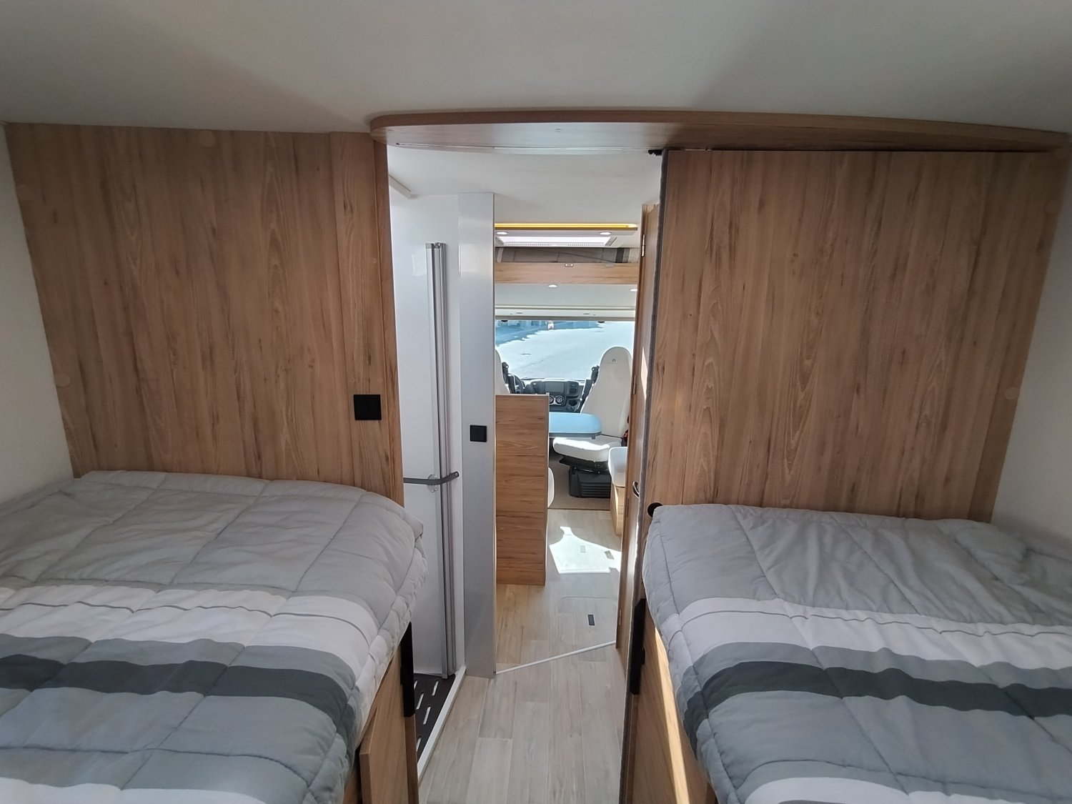 Une implantation idéale pour un couple ou une famille grâce à ses 4 grand couchages : lits jumeaux en partie arrière avec cabinet de toilettes et douche séparés. En partie avant un grand lit pavillon complète les couchages.