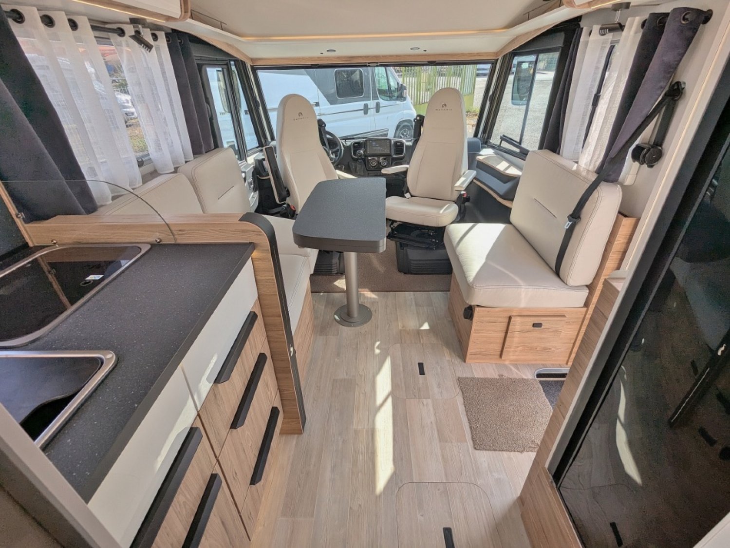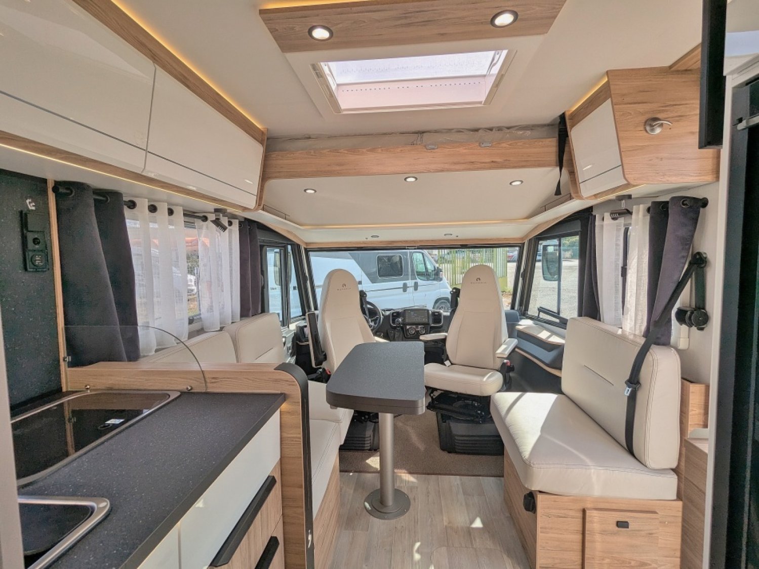 Camping-car intégral en très bon état sur Fiat 2,2 JTD 160 cv boîte automatique avec lit central, salle d'eau/WC, douche indépendante, cuisine équipée de frigo conservateur de 150 L, plaque gaz et de nombreux tiroirs fonctionnels, et salon avant avec sièges pivotants. Lit de pavillon de deux persoinnes au-dessus des sièges conducteur et passager.