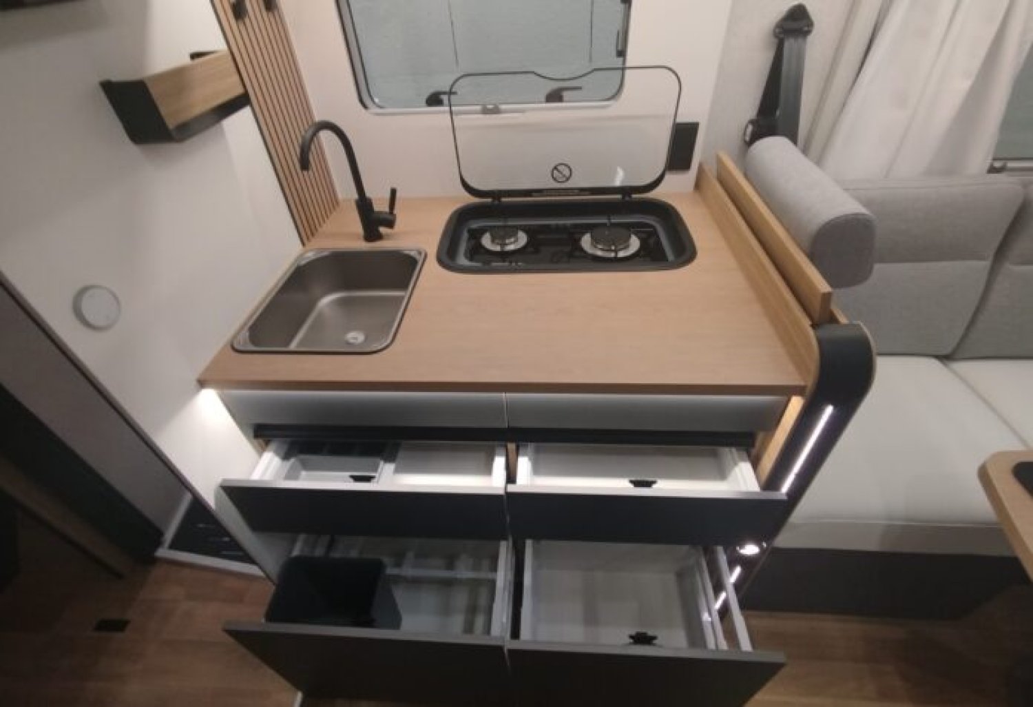 Tiroir bas de caisse • Caillebotis • Éclairage, rails d’arrimage et prise 230 V en soute