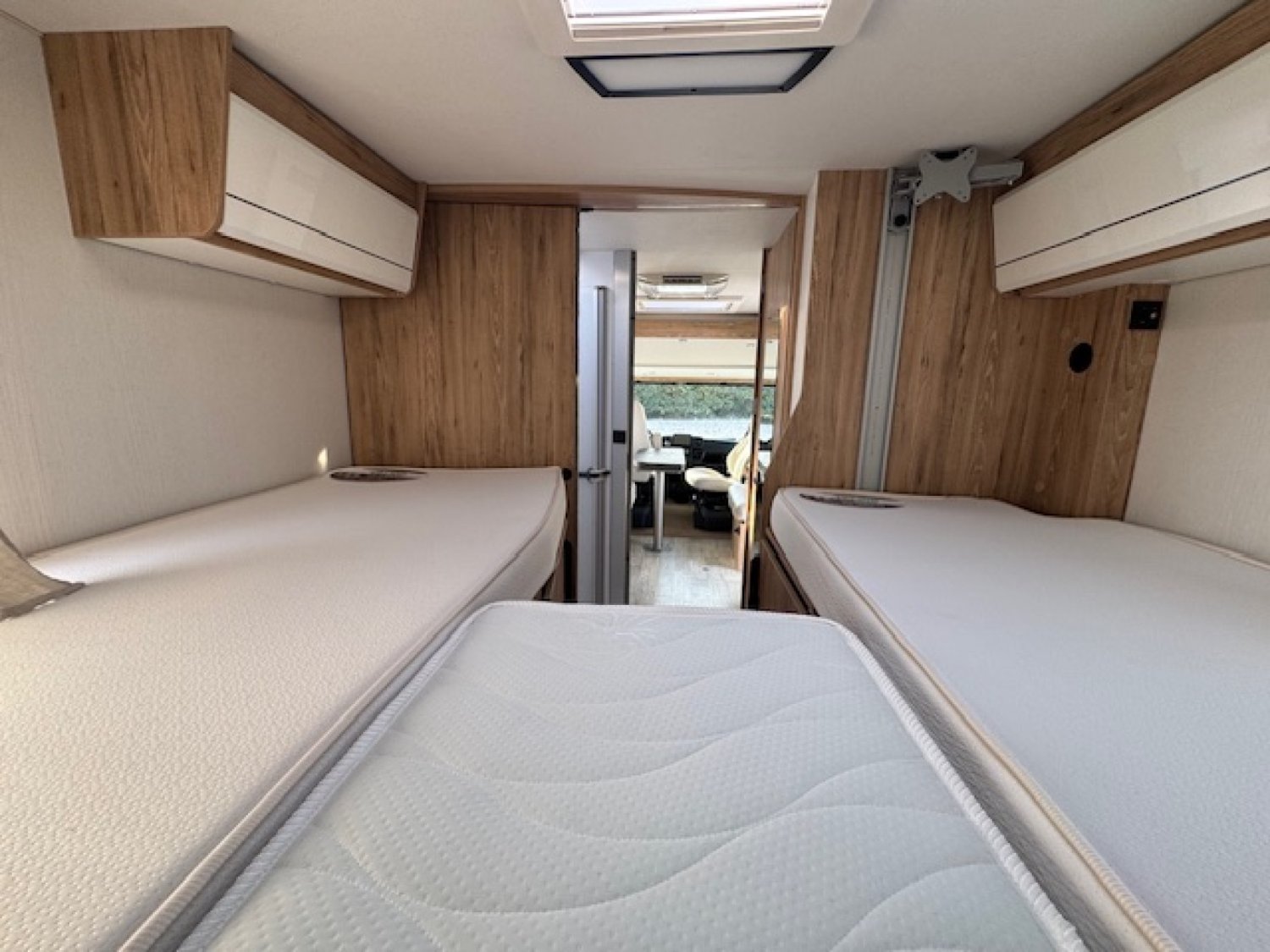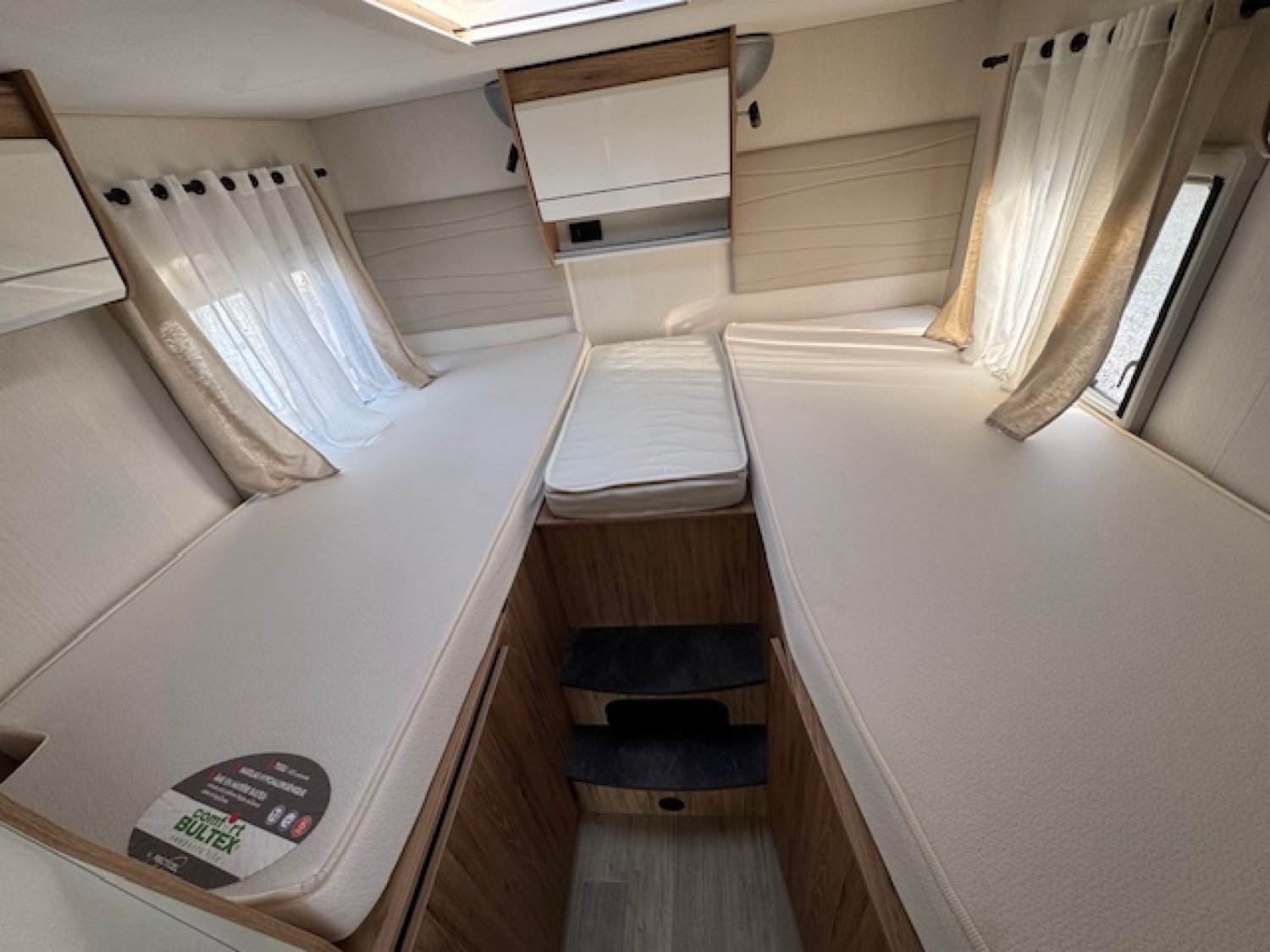 Modèle haut de gamme de la marque, il propose un vaste salon en face à face pouvant accueillir jusqu'à 5 personnes, une chambre cosy avec des lits jumeaux tout confort et du rangement avec 2 énormes penderies et une salle de bain avec douche séparée et double cloison !