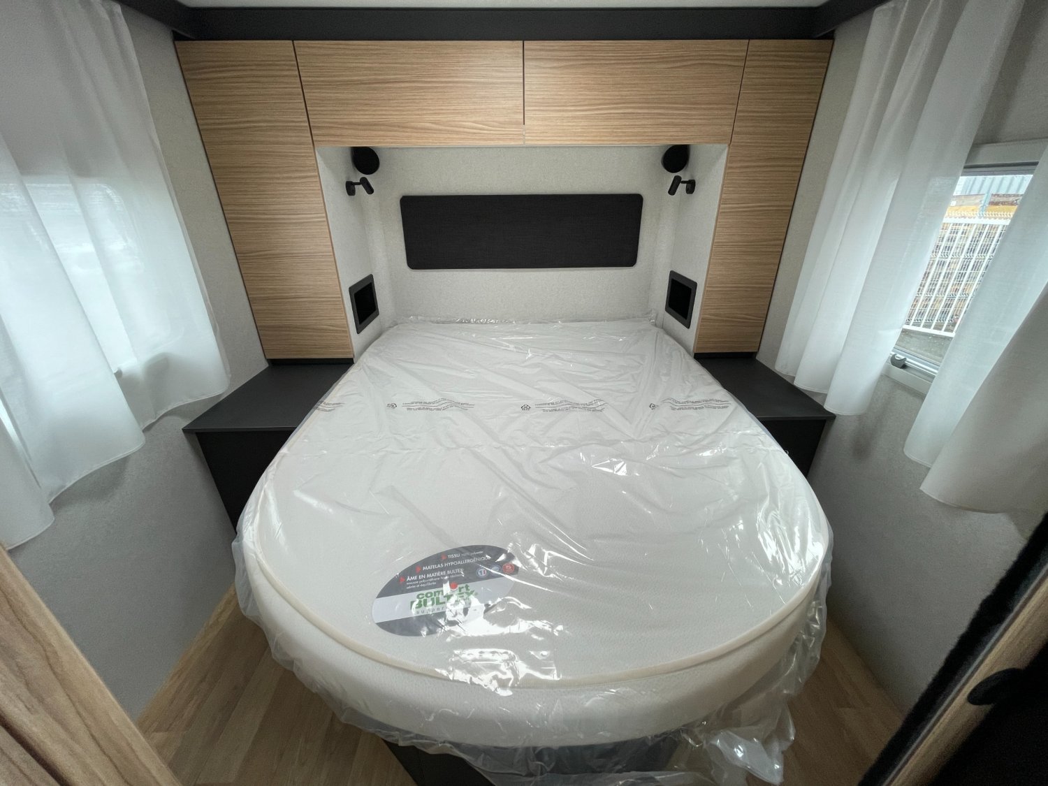 Patere et porte savon, Feux haute puissance, Lit pavillon, Table centralle papillon au salon, Soute traversante accessible par 2 portillons latéraux, Penderies, prises en têtes de lit, chevets, Salle d'eau transversante, Double cloisenement, Grans plan de travail dans la cuisine, Salon face à face, Structure renforcée permettant les charges lourdes, Grand lit central 150*190, Matelas grand confort et sommier à lattes