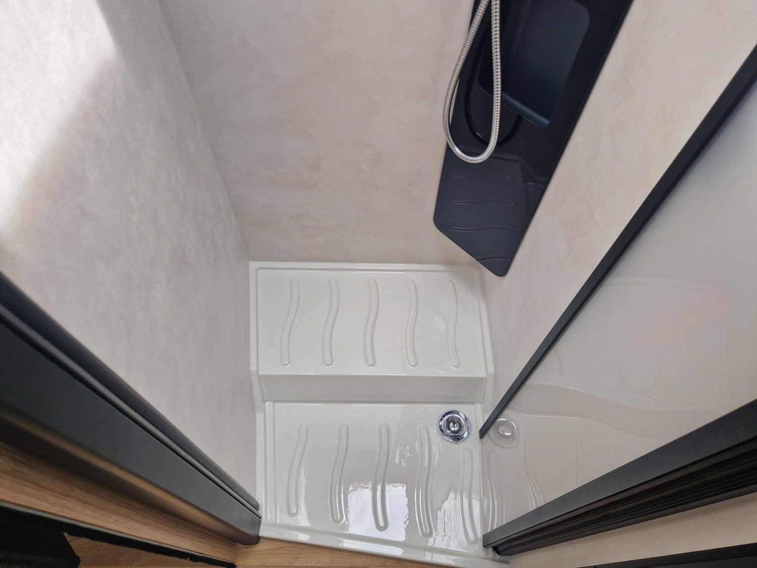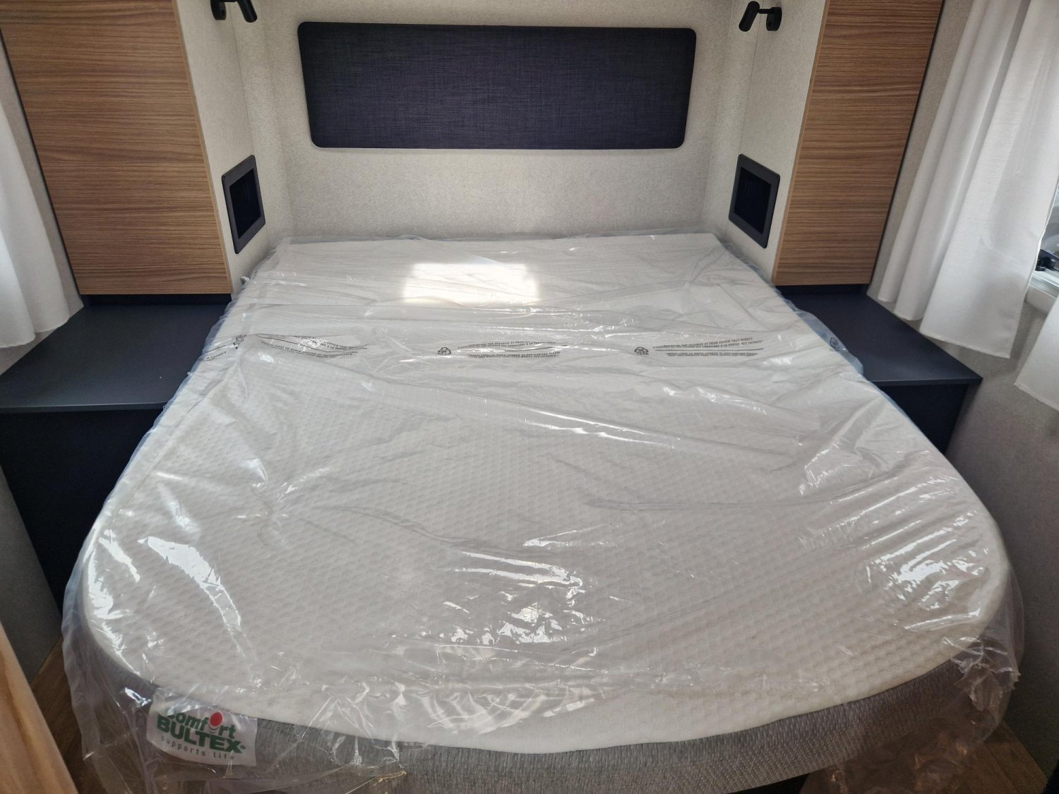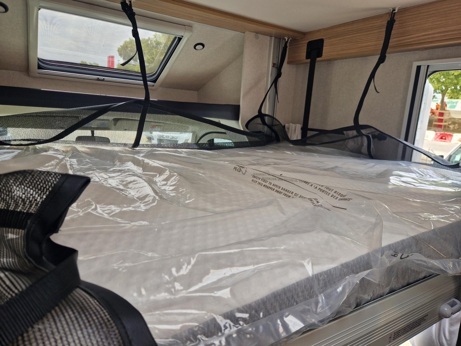 Profilé de marque leader avec lit central et lit de pavillon électrique 2 places, douche séparée du WC, cuisine équipée d'un grand frigo et salon en banquette face face, sur une base Fiat 140 CV en BVA.
