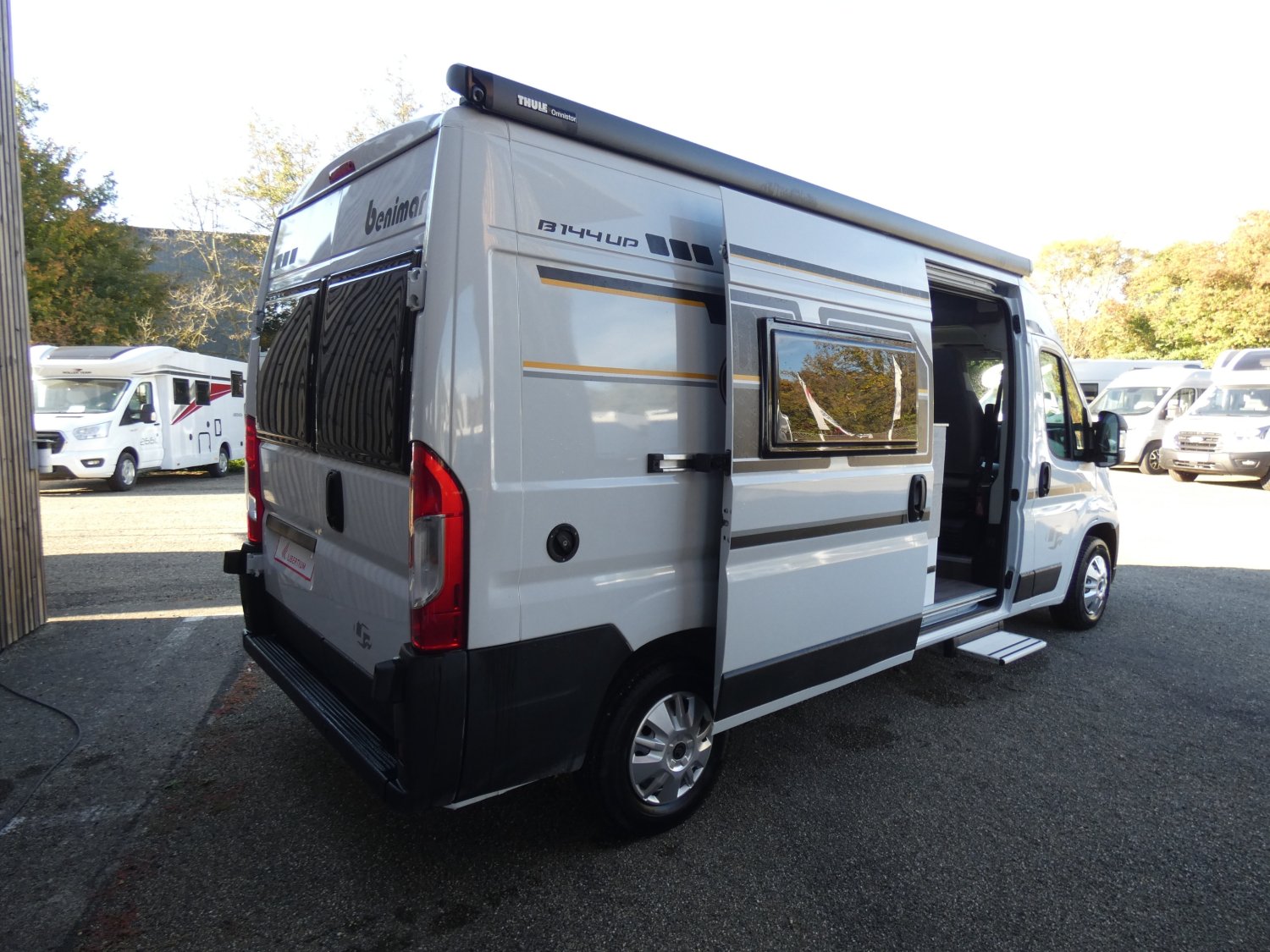 Prêt à partir, avec de série la moustiquaire de porte coulissante, le marche-pied électrique, le store extérieur, le panneau solaire 200 w ou encore les stores de cabine, le fourgon aménagé BENIMAR 144 UP (lit transversal) vous attend pour partir à l'aventure !