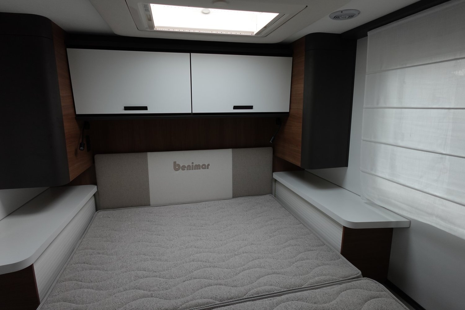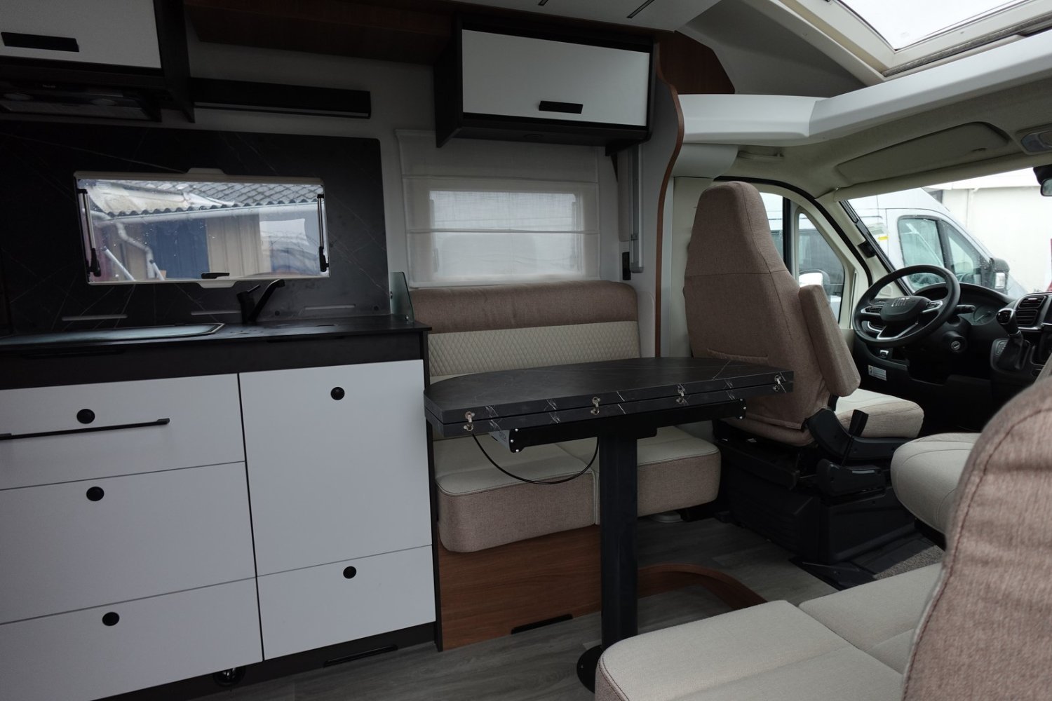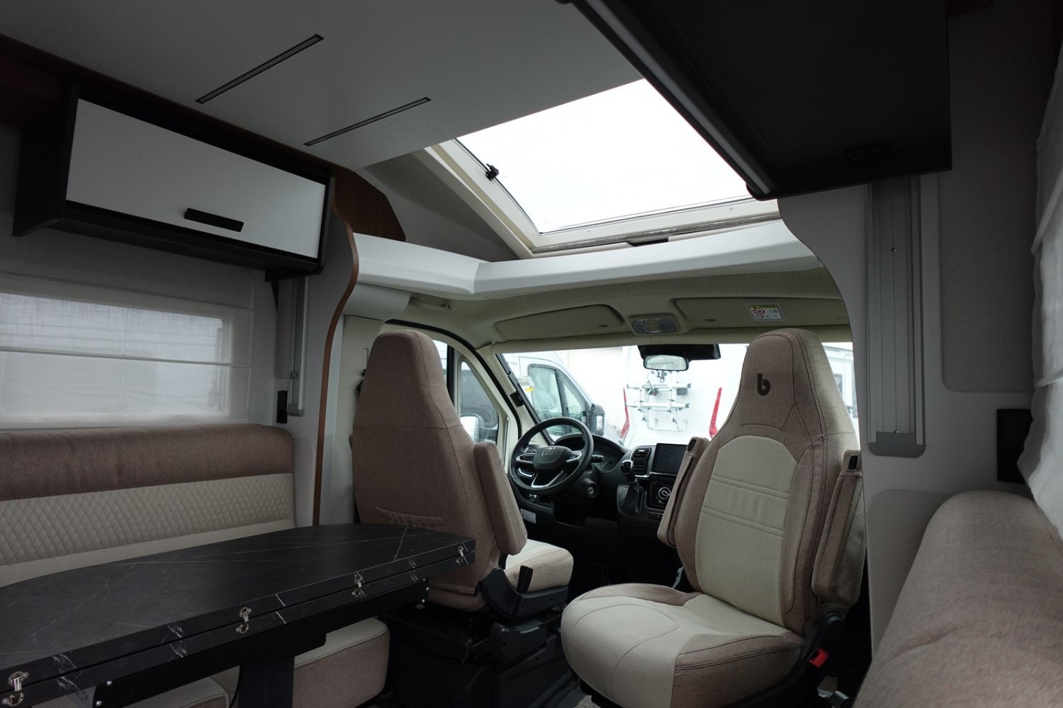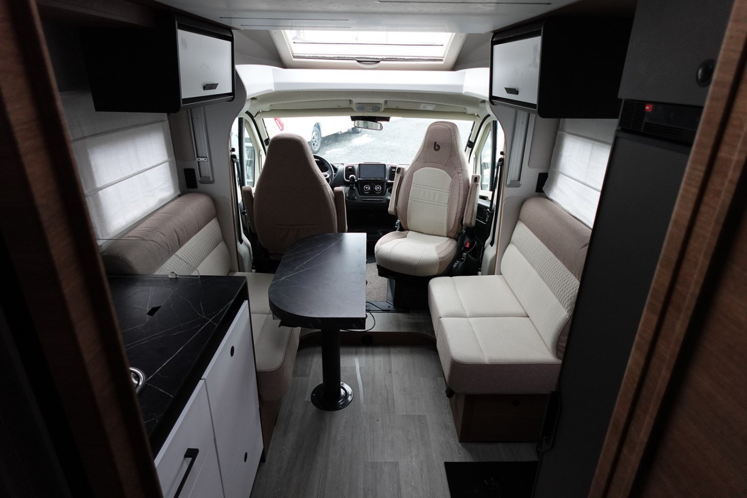 Magnifique profilé avec un lit central réglable en hauteur sur soute garage, une douche indépendante de l’espace WC, une cuisine avec de nombreux rangements, un lit de pavillon et un grand salon panoramique avec banquettes face/face.