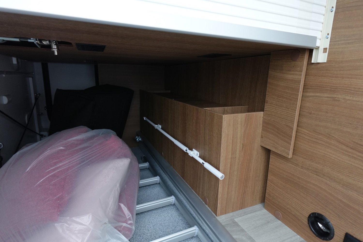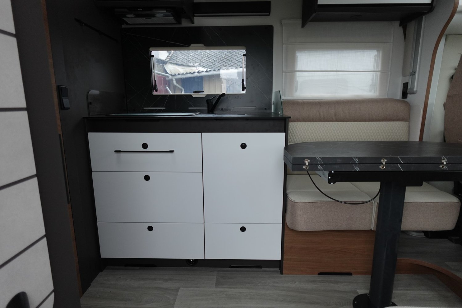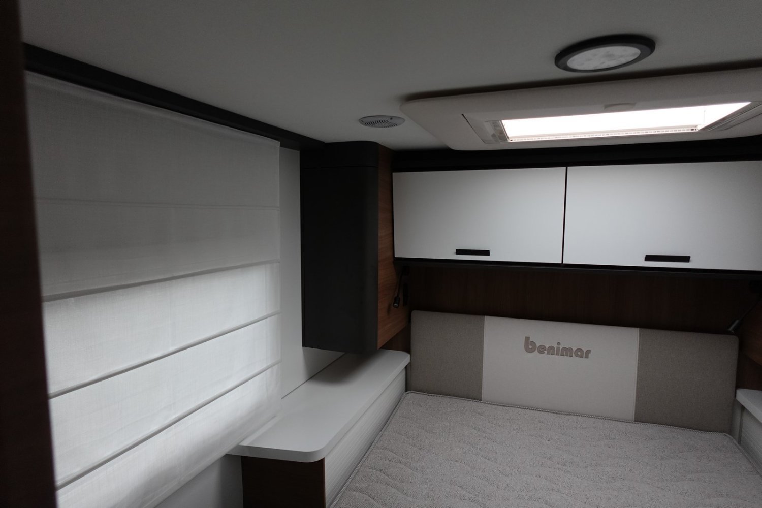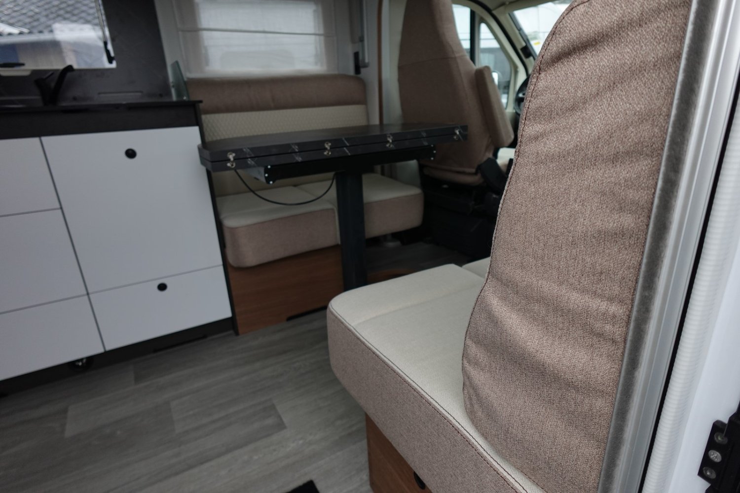 Magnifique profilé avec un lit central réglable en hauteur sur soute garage, une douche indépendante de l’espace WC, une cuisine avec de nombreux rangements, un lit de pavillon et un grand salon panoramique avec banquettes face/face.