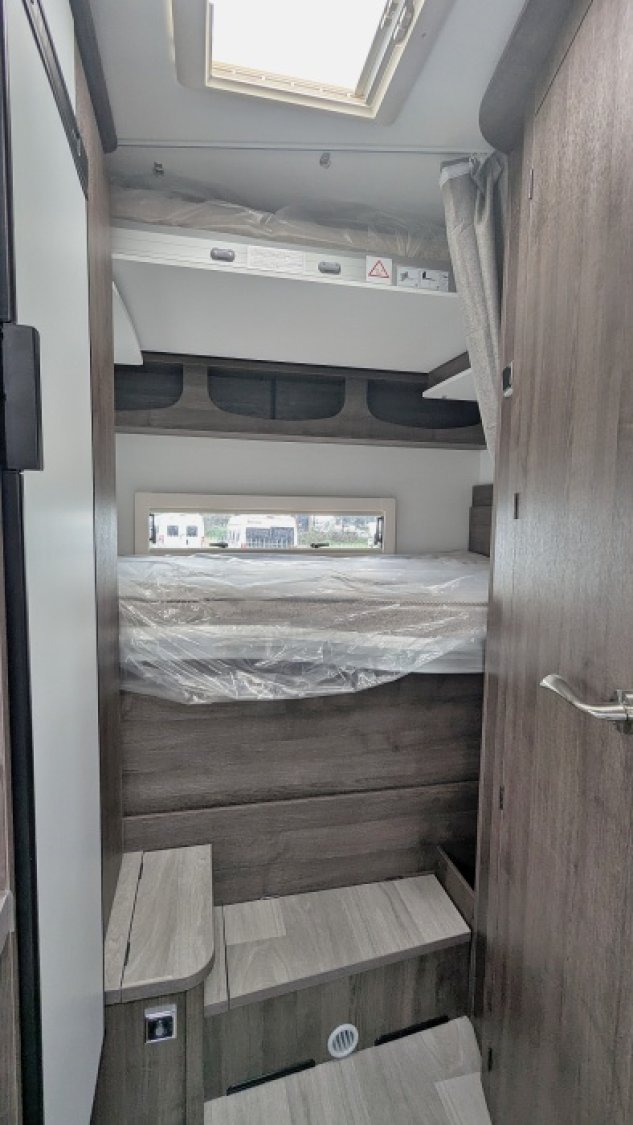 Benimar Sport 340 UP 2025 sur Ford 130 cv BV6, une capucine familiale suréquipée à prix très serré de seulement 6,76 m de long avec lits superposés arrière sur soute dont 1 électrique, salle d'eau/WC avec douche séparée, cuisine avec grand frigo/congel et maxi salon avec sièges pivotants. Le lit capucine mesure 155 x 203 cm et peut accueillir 2 personnes.