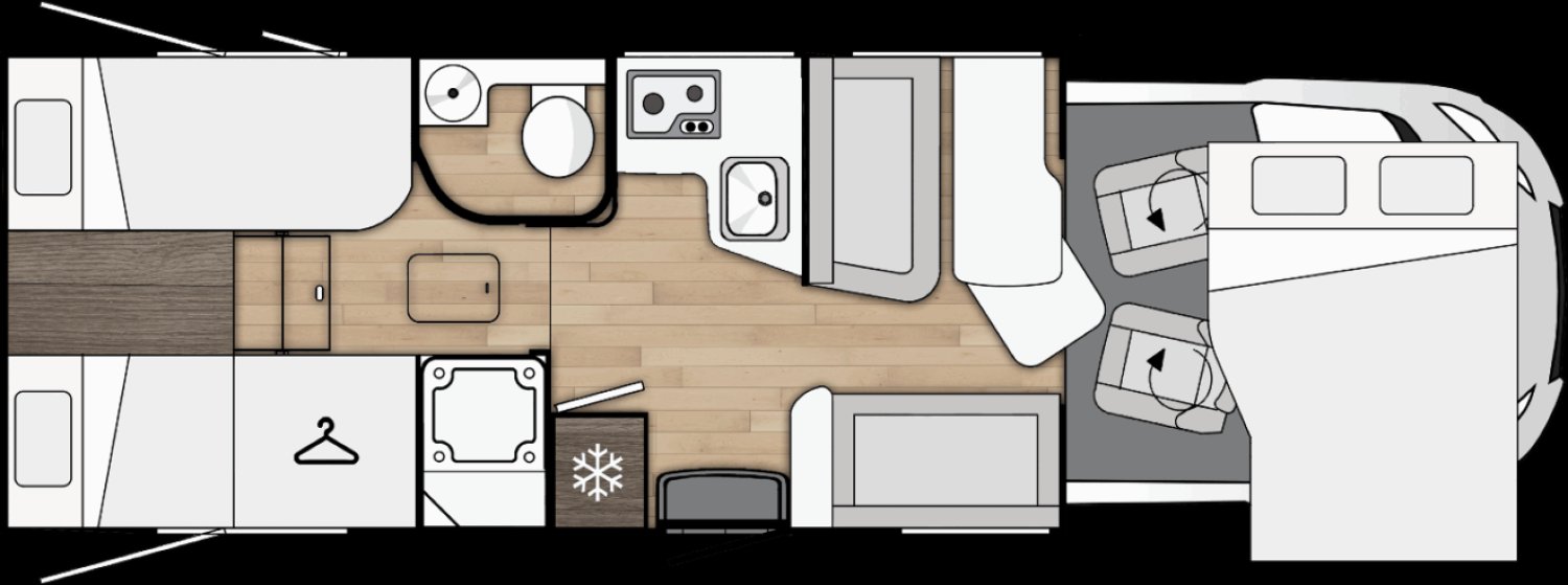 Moteur FORD Euro 6 - 2,0 l 165 CV, Chargeur de batterie 22A avec option lithium, Lit de pavillon électrique 2 places, Porte cellule XL, Grille de calandre noire et chromé, Radio DAB avec écran tactile 12" + Caméra recul, Assistance au démarrage en côte (HSA), Lits jumeaux transformables en lit de 170x210 cm, Prises 230 et 12 V dans le garage, Carrosserie et dessous plancher polyester, Support TV, Pré-installation 2ième batterie, Fenêtres double vitrage Dometic D-Lux Extra plates, Porte cellule avec fenêtre, store et poubelle, alerte anticollision et aide au stationnement avant, Rétroviseurs électriques et dégivrants, Frein électrique, Prise USB dans la zone de couchage, Panneau solaire 200 W avec régulateur MPPT, Téléviseur 20' avec antenne omnidirectionnell, Phares automatiques et détecteur de pluie, Toit ouvrant panoramique cabine (avec store et moustiquaire, Alerte de circulation à contresens, Assistance au centrage sur la voie, Vitres électriques, Régulateur de vitesse avec limiteur, Flancs et plafond imputrescibles (sans bois), Store 4 m, Phares antibrouillard avant, Rideaux occultation vitres cabine, Casquette de profile 100% polyester renforcé, Lumière extérieure LED, Roues 16", Adaptation intelligente de la vitesse, Reconnaissance des panneaux de limitation de vitesse, Radars de recul, Climatisation cabine automatique