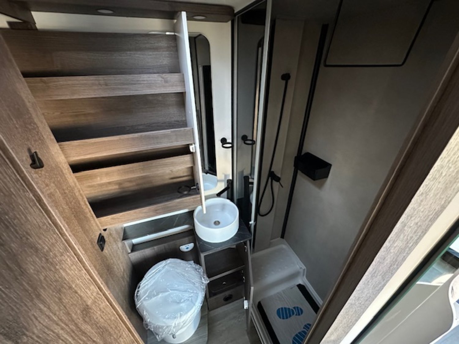 Découvrez un grand salon en L convivial, une salle de bain moderne avec douche indépendante et miroir rétro-éclairé, ainsi qu une grande soute avec double accès sécurisé pour transporter tout votre équipement.