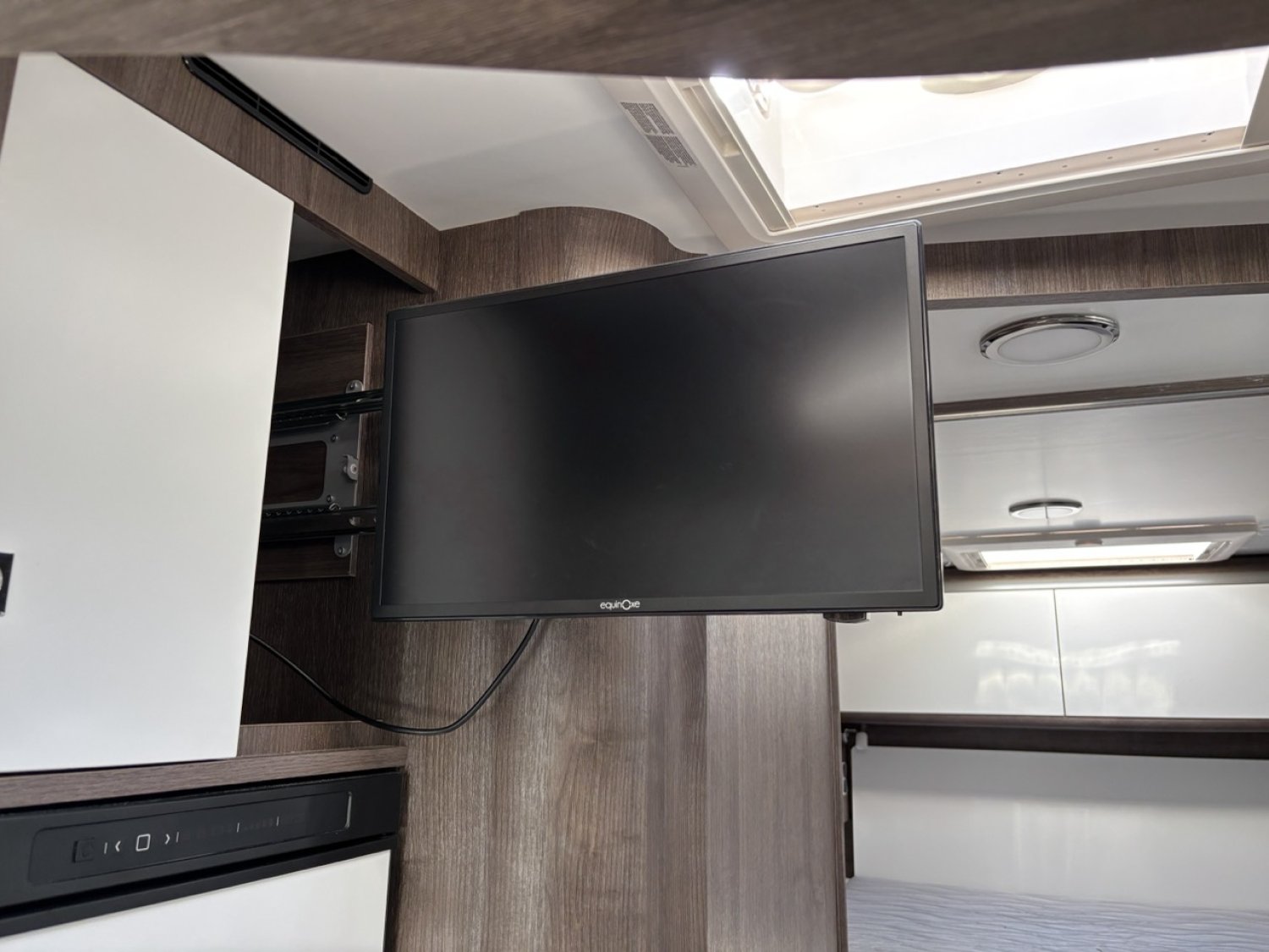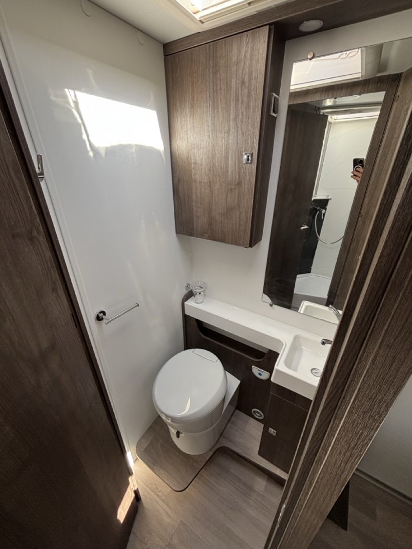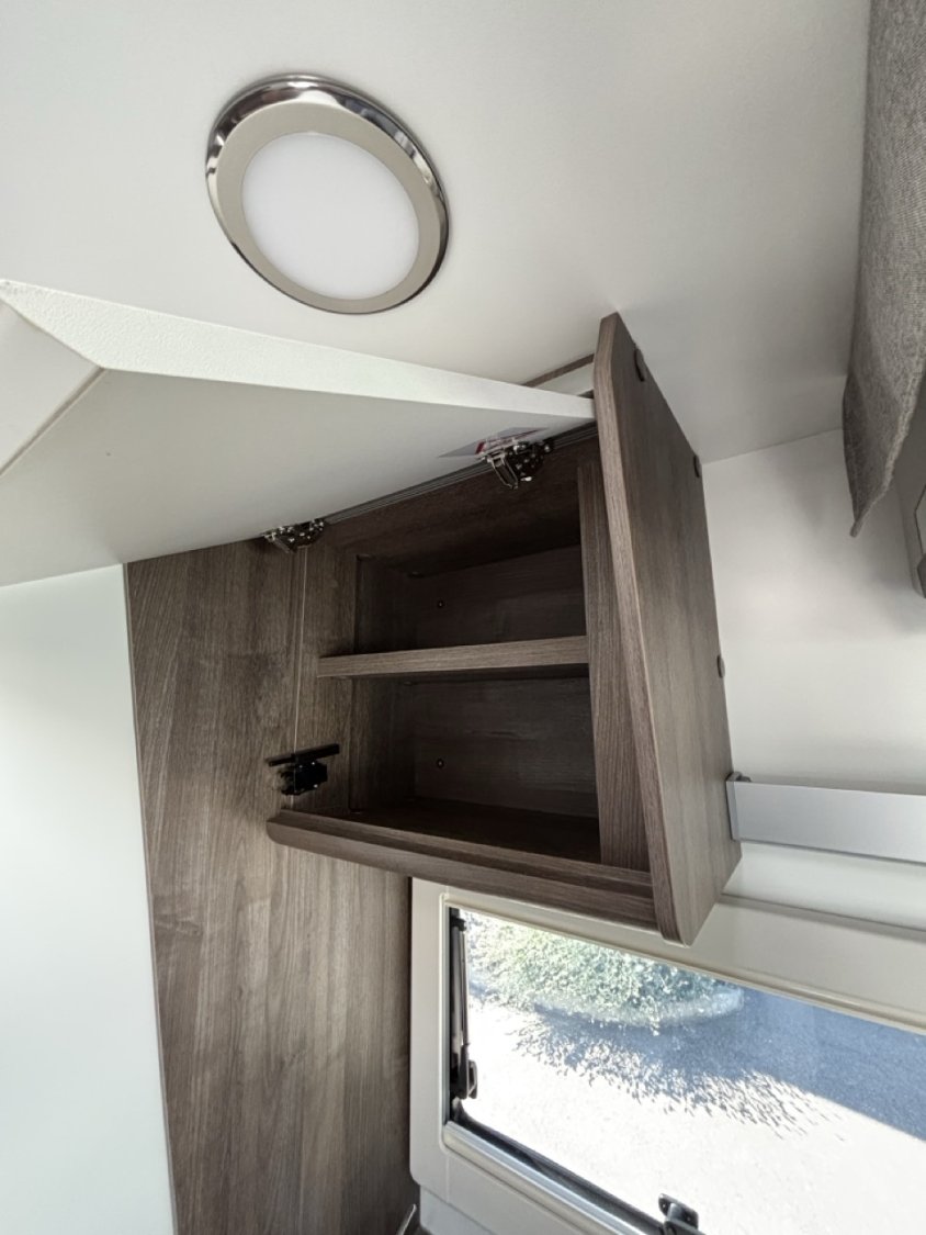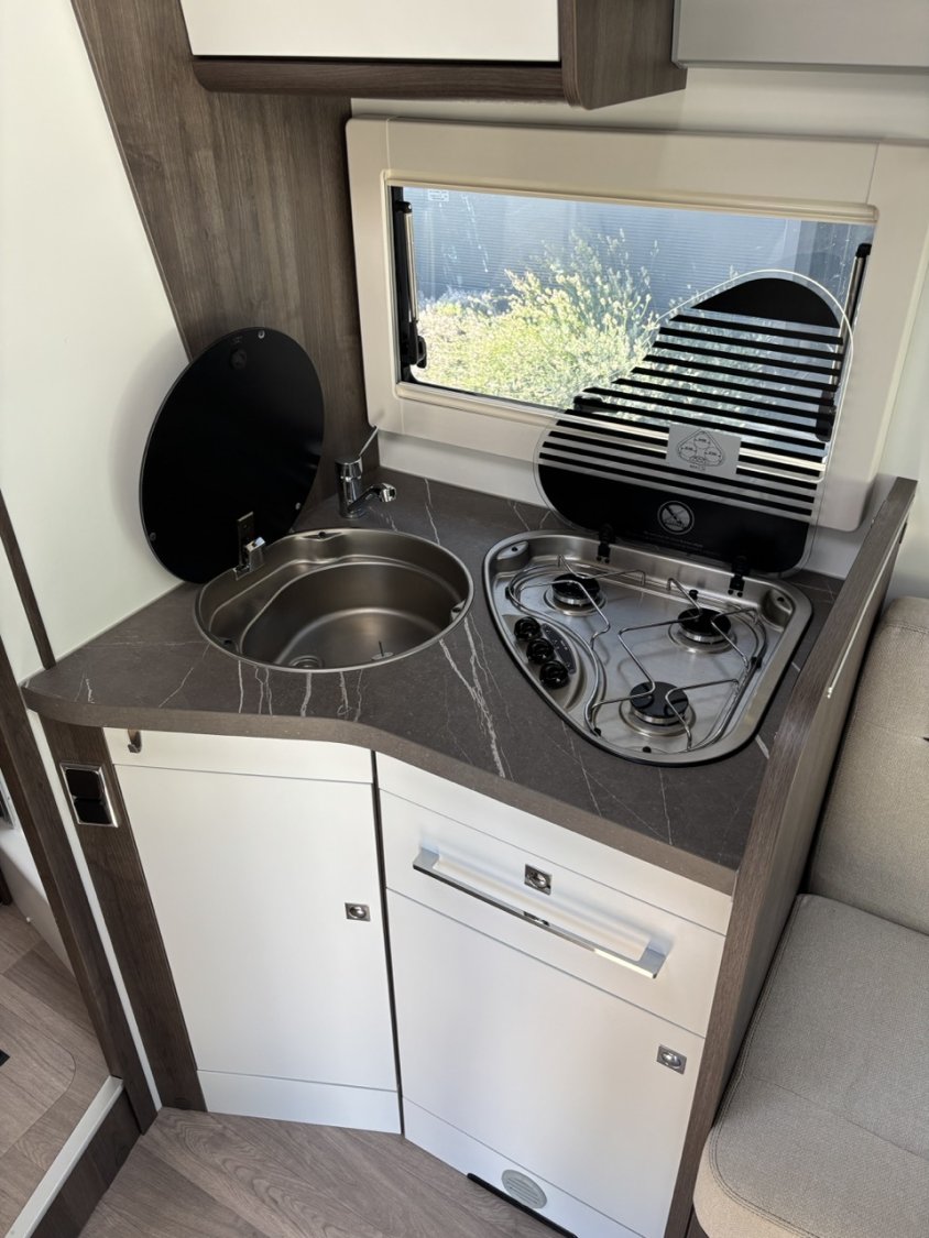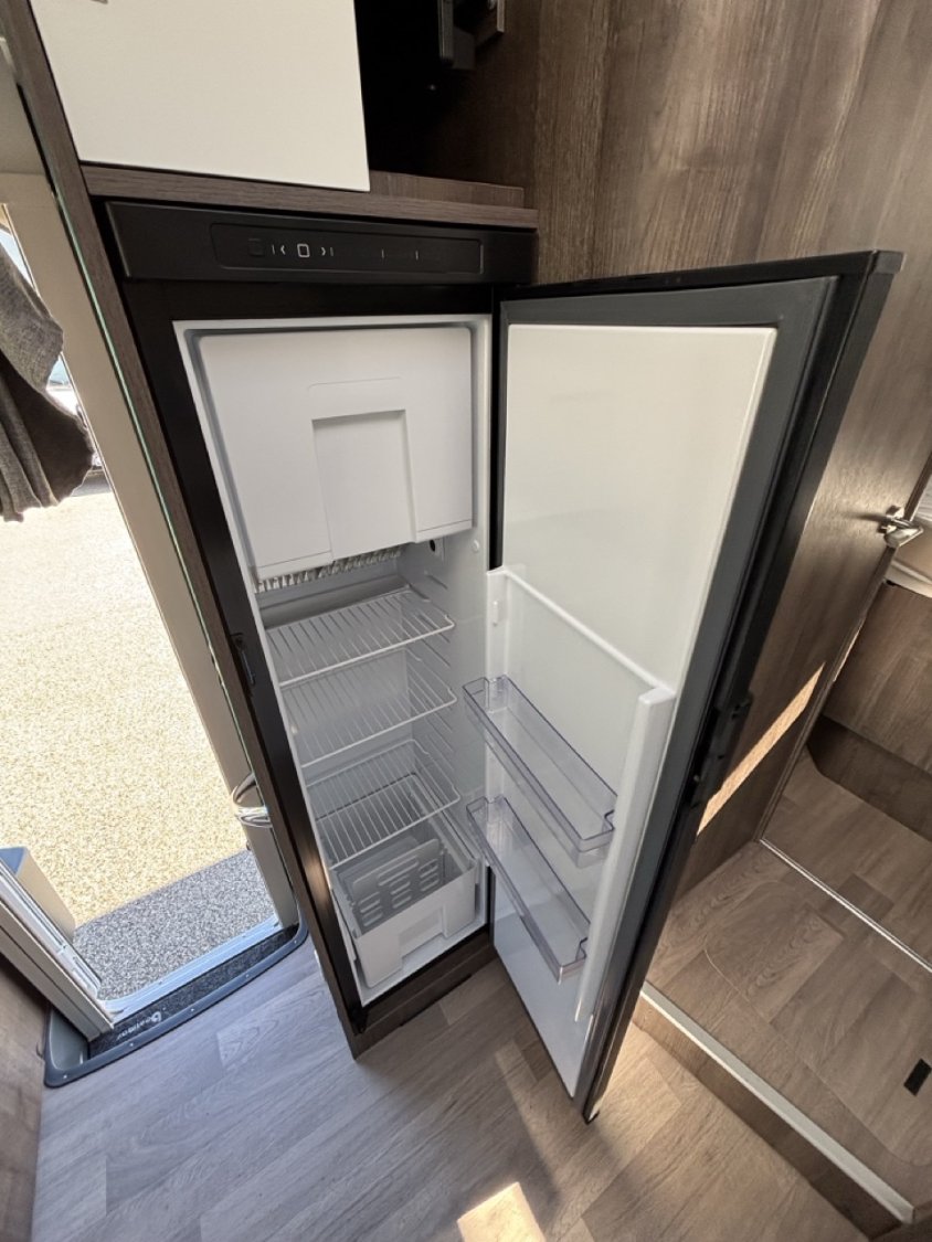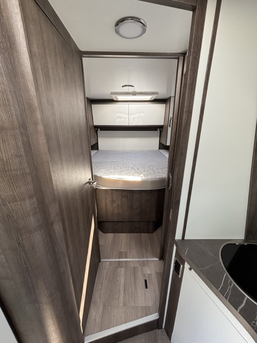 L’aménagement intérieur se veut à la fois raffiné et fonctionnel, avec une belle chambre arrière dotée d’un lit central réglable en hauteur, une salle d’eau avec douche indépendante, ainsi qu’un salon face-face spacieux pouvant accueillir aisément 4 personnes. Un lit de pavillon électrique vient compléter l’espace nuit, permettant ainsi jusqu’à 4 couchages confortables sans modifier le salon. La cuisine, moderne et bien pensée, dispose d’un grand réfrigérateur, de nombreux rangements et d’un plan de travail fonctionnel.