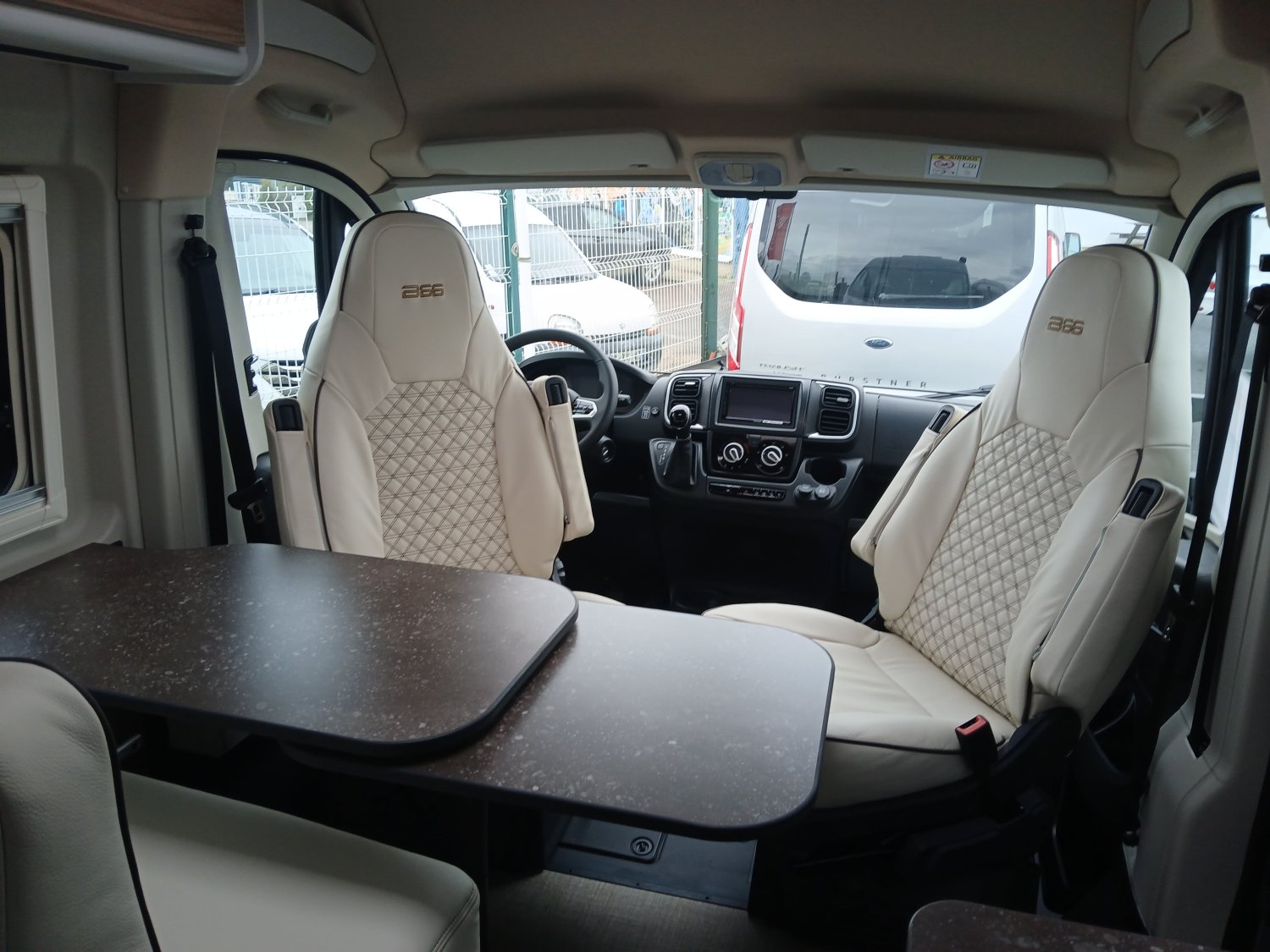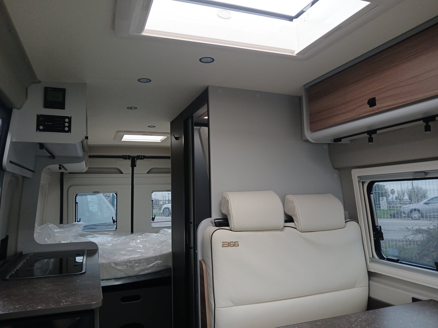 Burstner fait très fort avec cette série B 66. Ce fourgon de 5m99 dispose de 3 couchages avec grand lit arrière et un dinette transformable. Coup de cœur assuré tant il séduisant par sa couleur extérieure Gris Lanzarote, sa sérigraphie spécifique B66, sa sellerie cuir et son nouveau mobilier. Intérieurement, il est admirablement bien conçu avec une belle chambre arrière avec un lit en 150x197cm, une salle de bain vario, une cuisine astucieuse et un salon généreux. Un niveau d'équipement de série très appréciable.