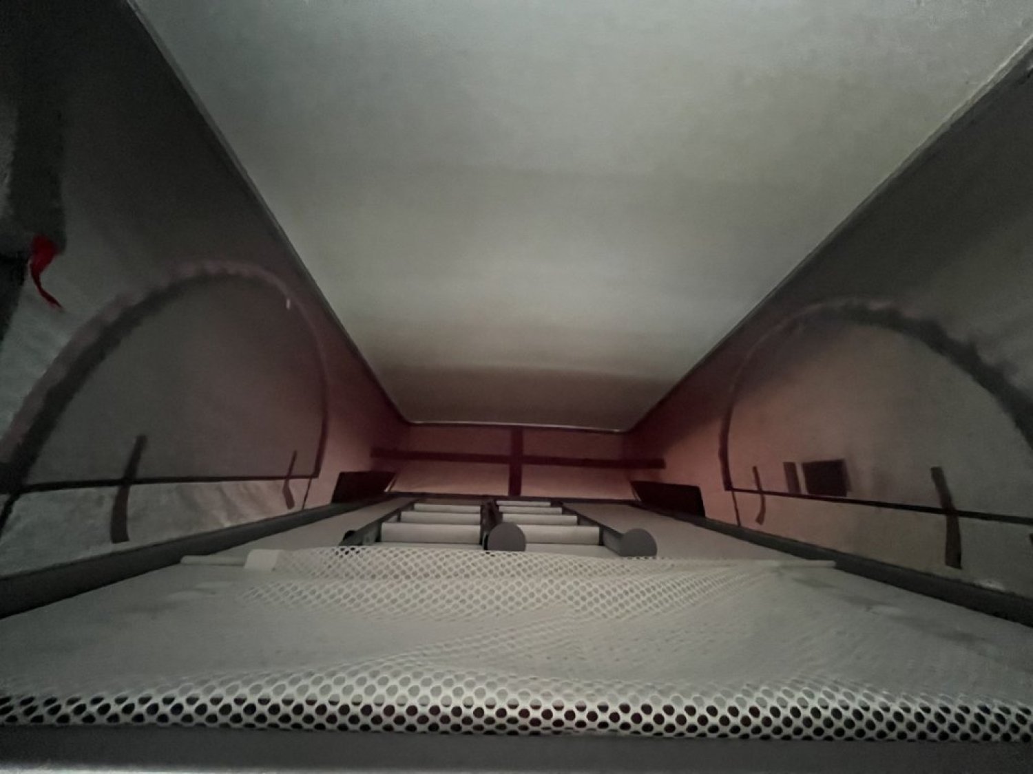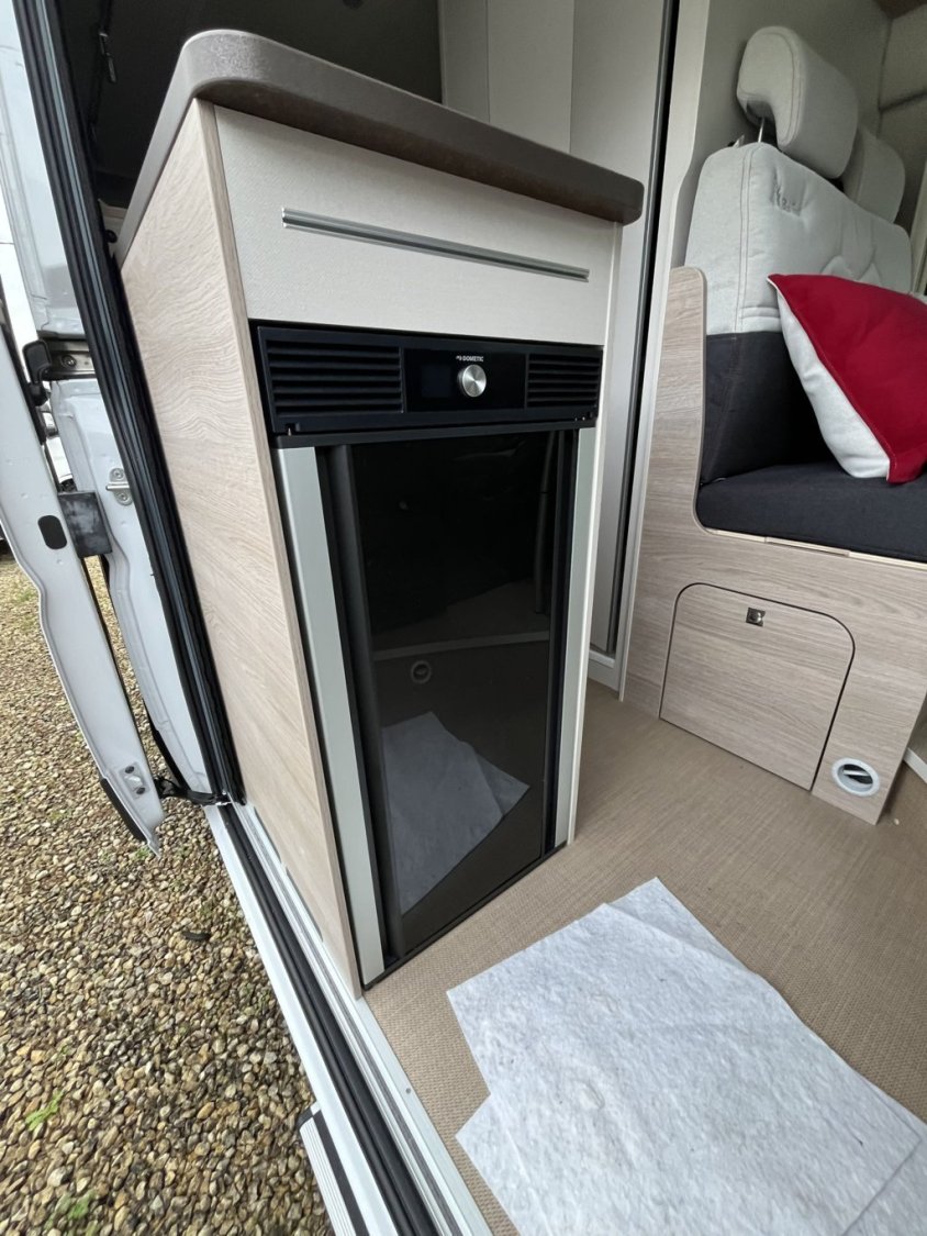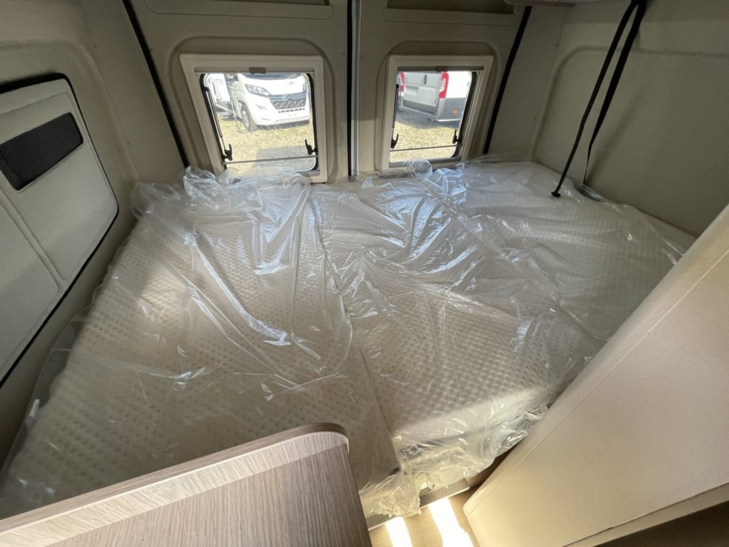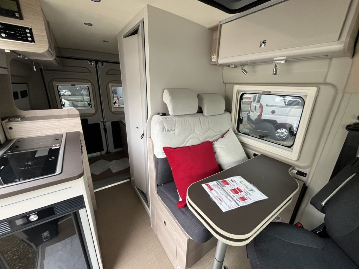 Bac de douche, Cuisine en long, Lit central transversal, Lit toit relevable, Salon avant sièges pivotants, WC Cassette.