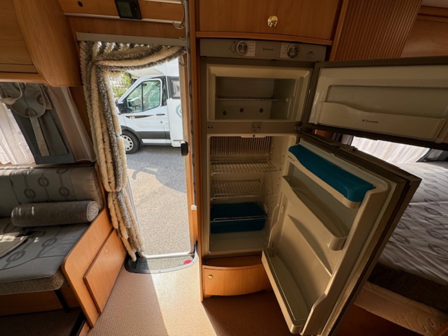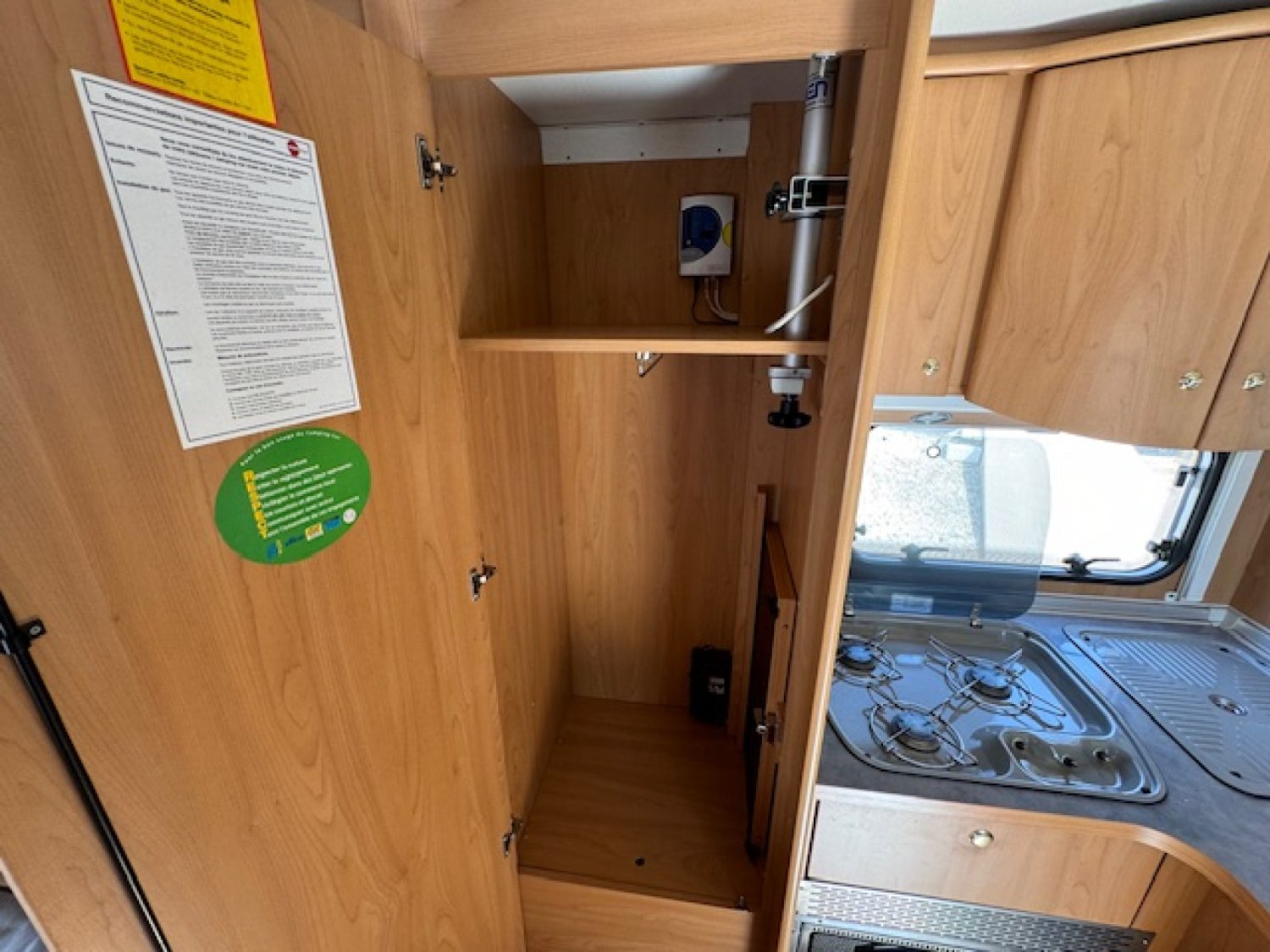 Il bénéficie d un coin cuisine en L avec four à gaz et évier ainsi qu un grand réfrigérateur 150L Trimixte (à absorption).