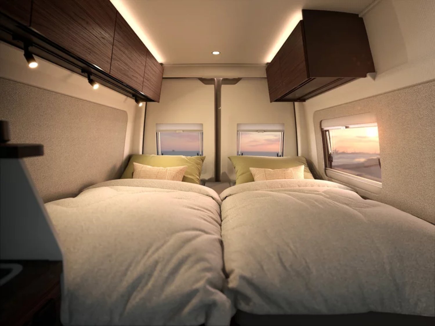 Détails Pack Confort : Habillage des parois intérieur en tissu, store plissée cabine, Moustiquaire de porte, extension de plan de travail cuisine, baie à encadrement, batterie Lithium 100 ah, éclairage indirect led