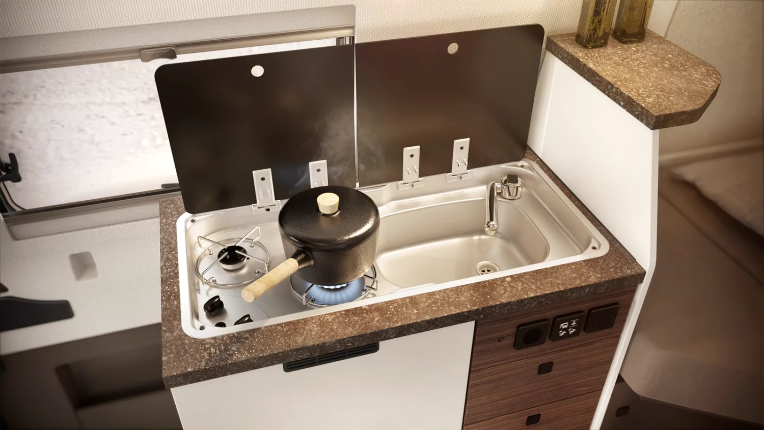 Pack confort cellule : Habillage des parois intérieur en tissu, store plissée cabine, Moustiquaire de porte, extension de plan de travail cuisine, baie à encadrement, batterie Lithium 100 ah, éclairage indirect led : 3 015 €