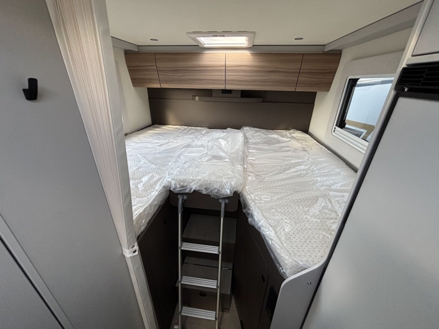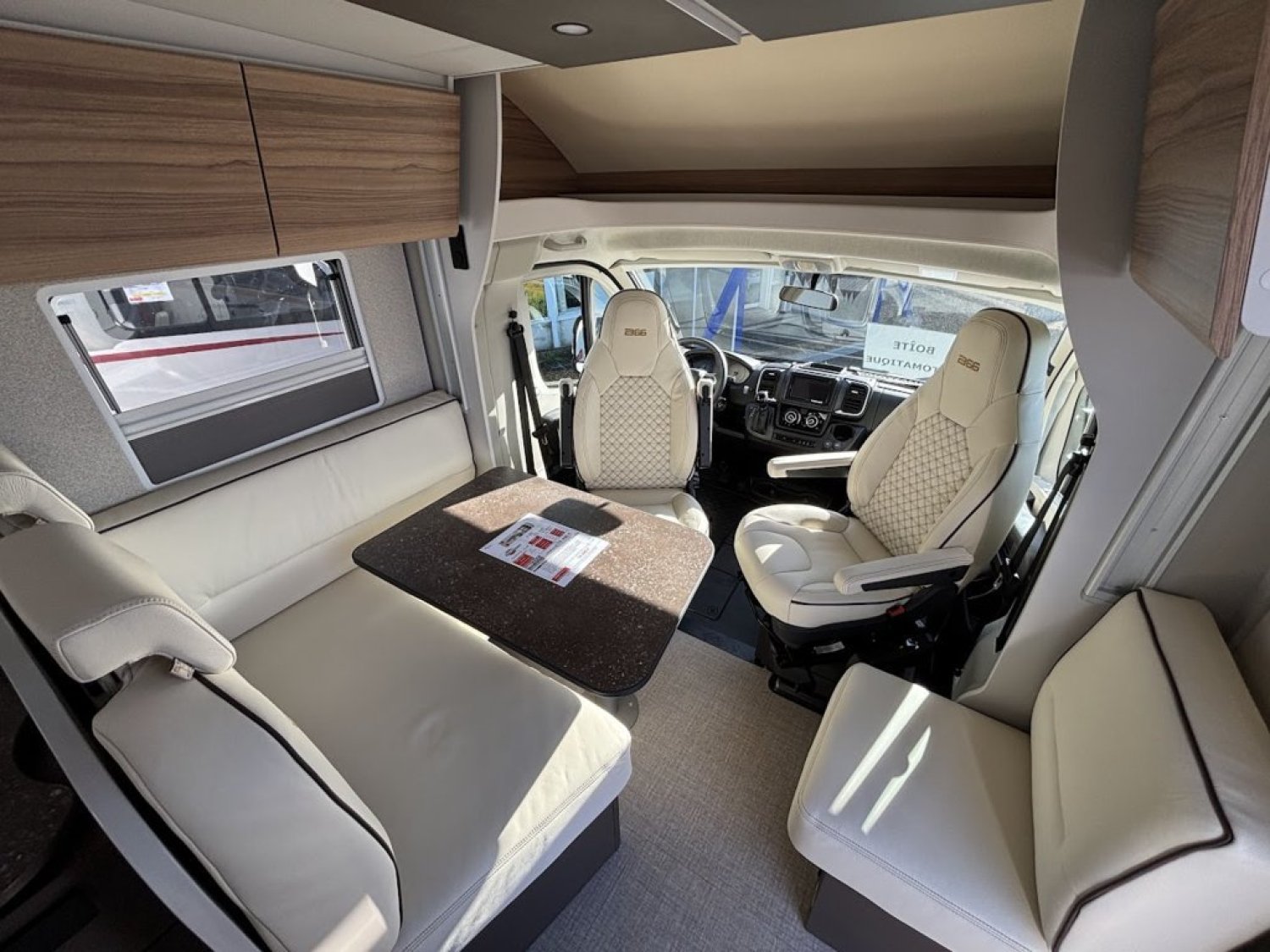 Cuisine en L, Douche à vario, Grande soute, lit jumeaux, lit pavillon, Salon avant sièges pivotants, Salon en L, WC Cassette.