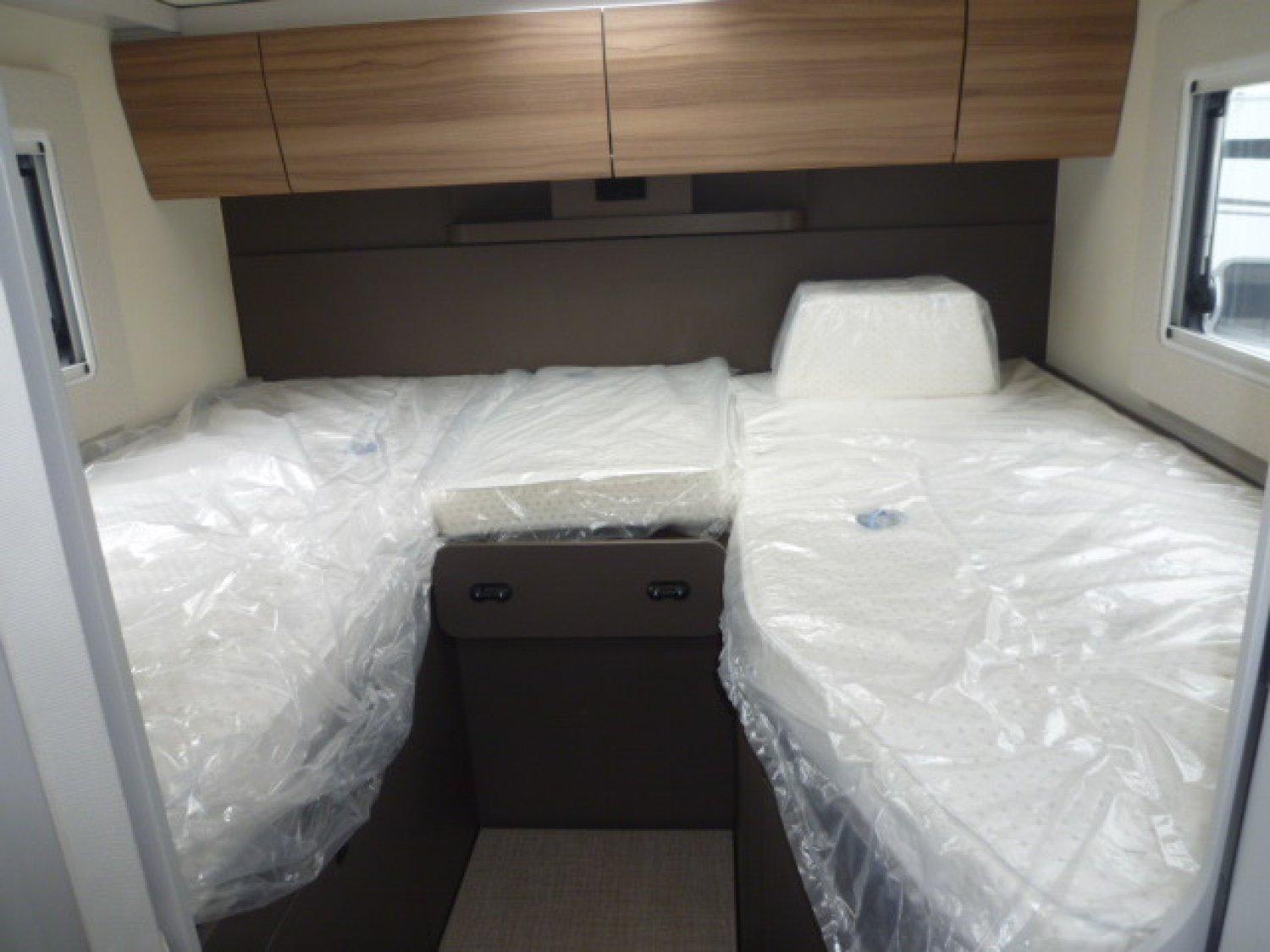Cuisine en L, Douche à vario, Grande soute, lit jumeaux, lit pavillon, Salon avant sièges pivotants, Salon en L, WC Cassette.