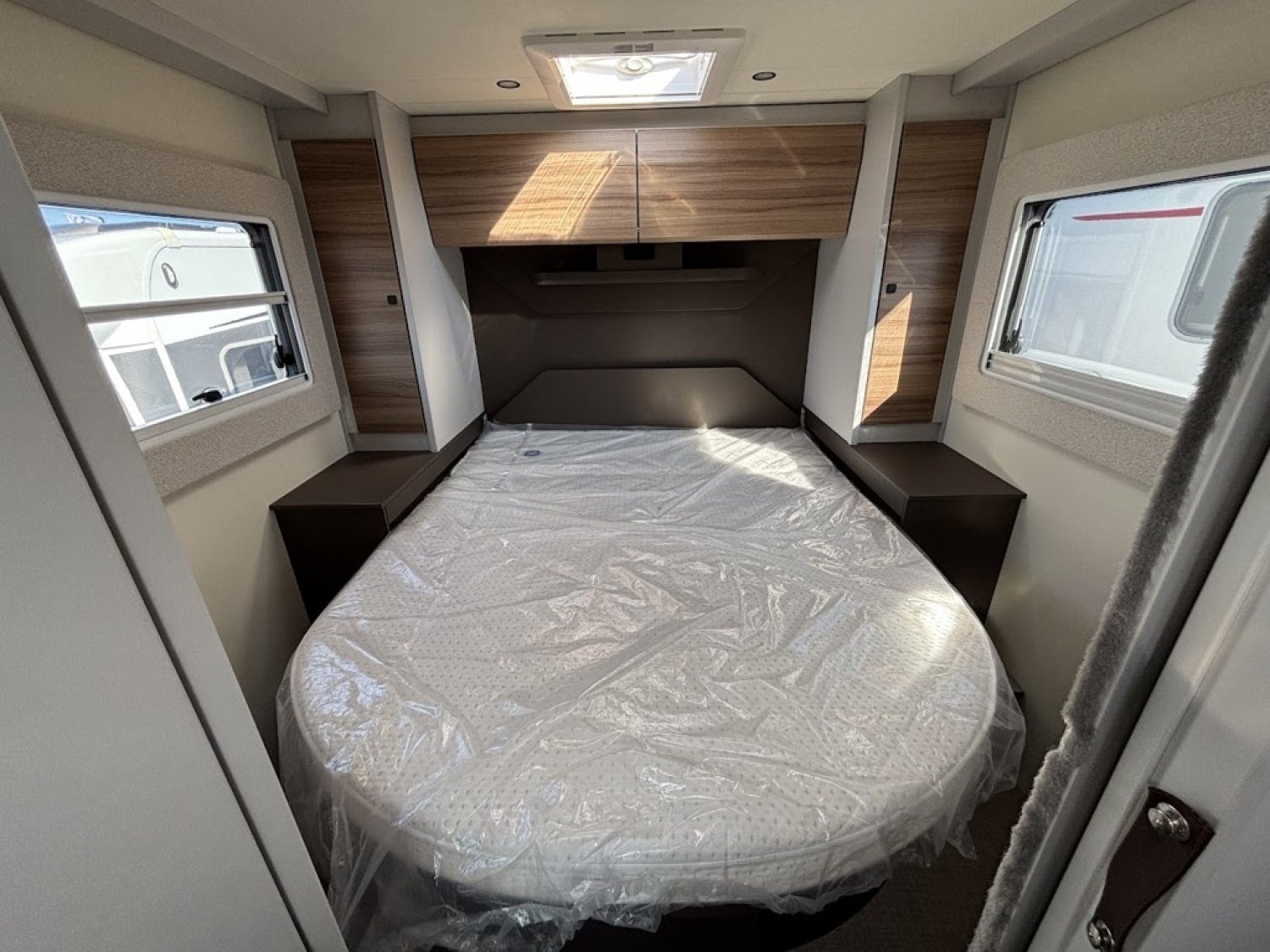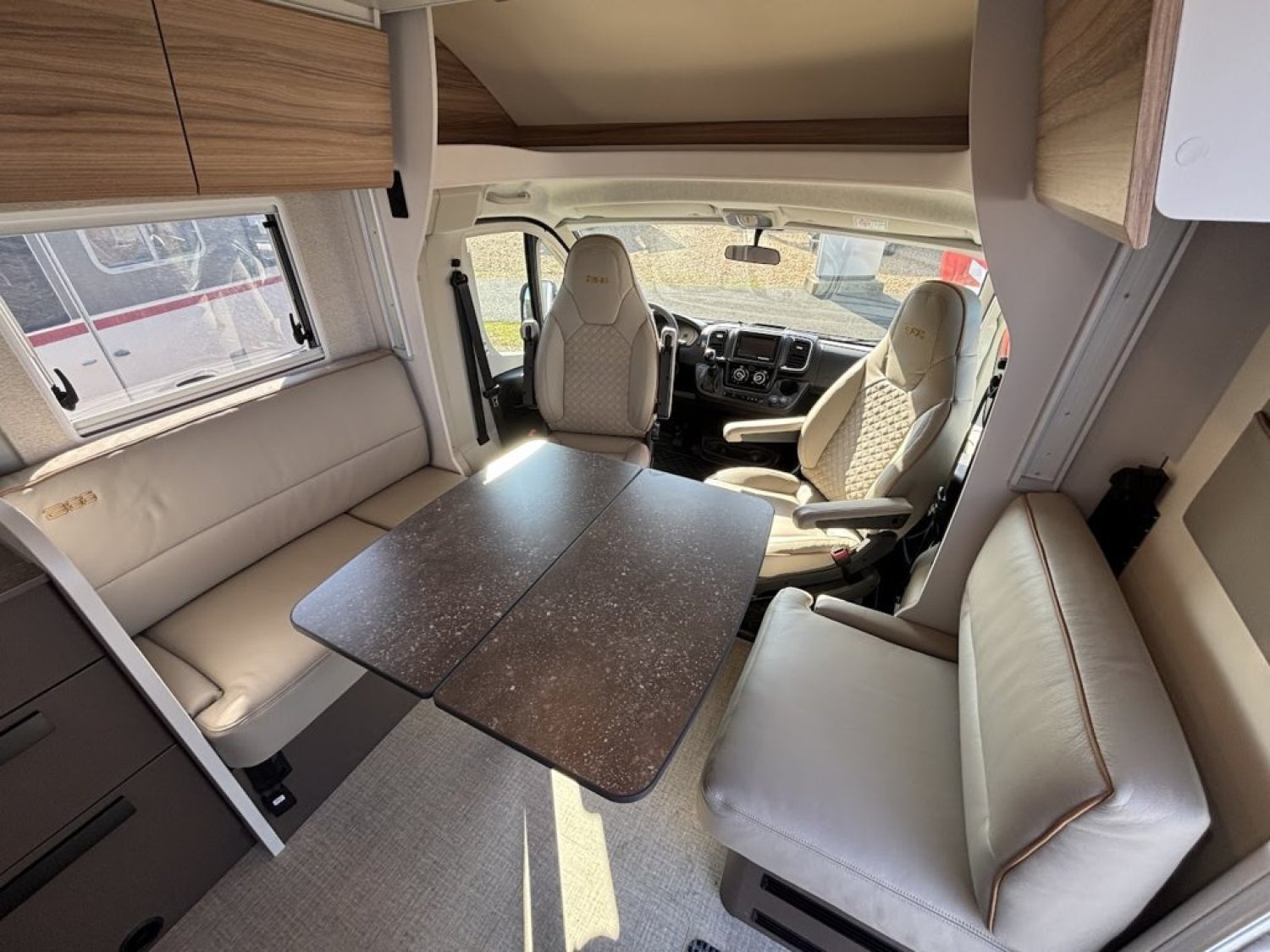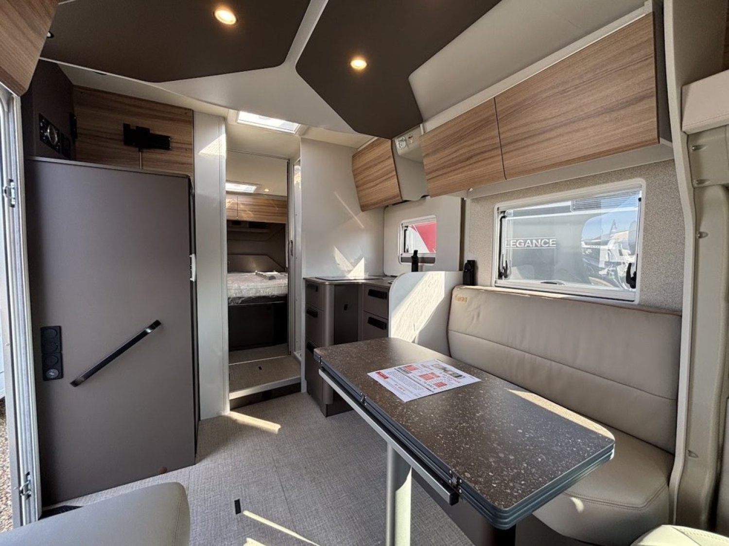 Bac de douche, Cuisine en L, Lit central, lit pavillon, Salon avant banquettes face à face, Salon avant sièges pivotants, WC Cassette.