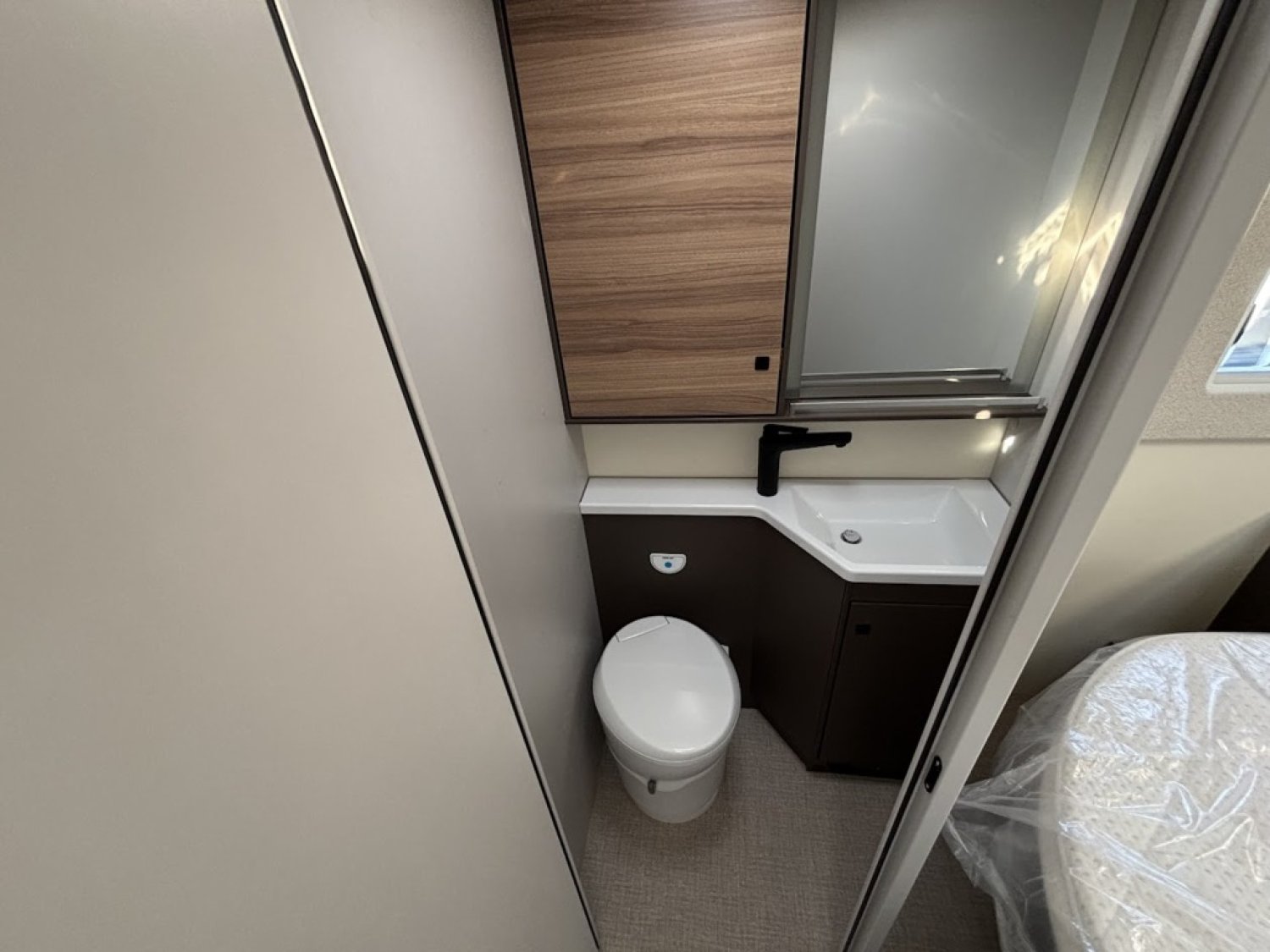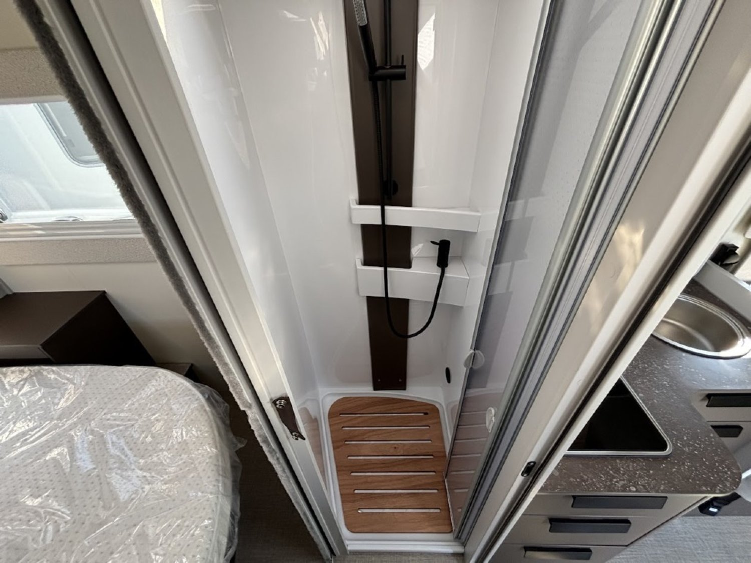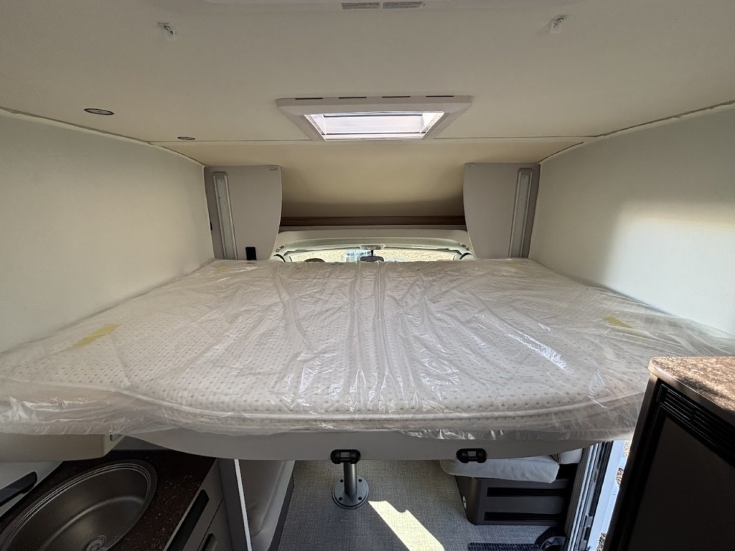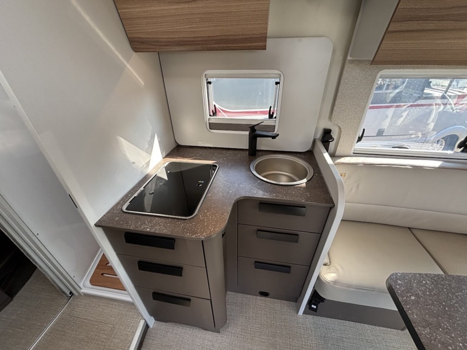 Bac de douche, Cuisine en L, Lit central, lit pavillon, Salon avant banquettes face à face, Salon avant sièges pivotants, WC Cassette.