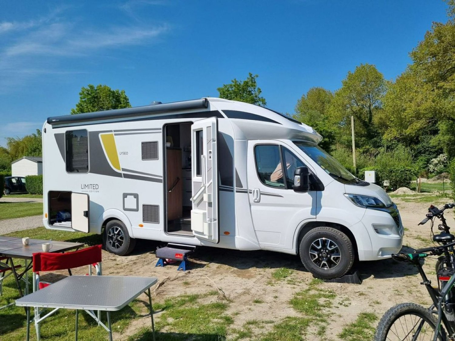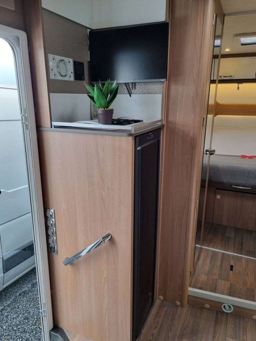 Côté équipements, il comprend un réfrigérateur 133 L, un store extérieur avec LED, un marchepied électrique, un porte-vélos 3 vélos, ainsi que deux Smart TV connectées Oyster, une antenne Wi-Fi, une station multimédia Pioneer avec caméra de recul, Bluetooth et prises USB.
