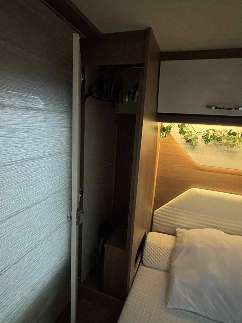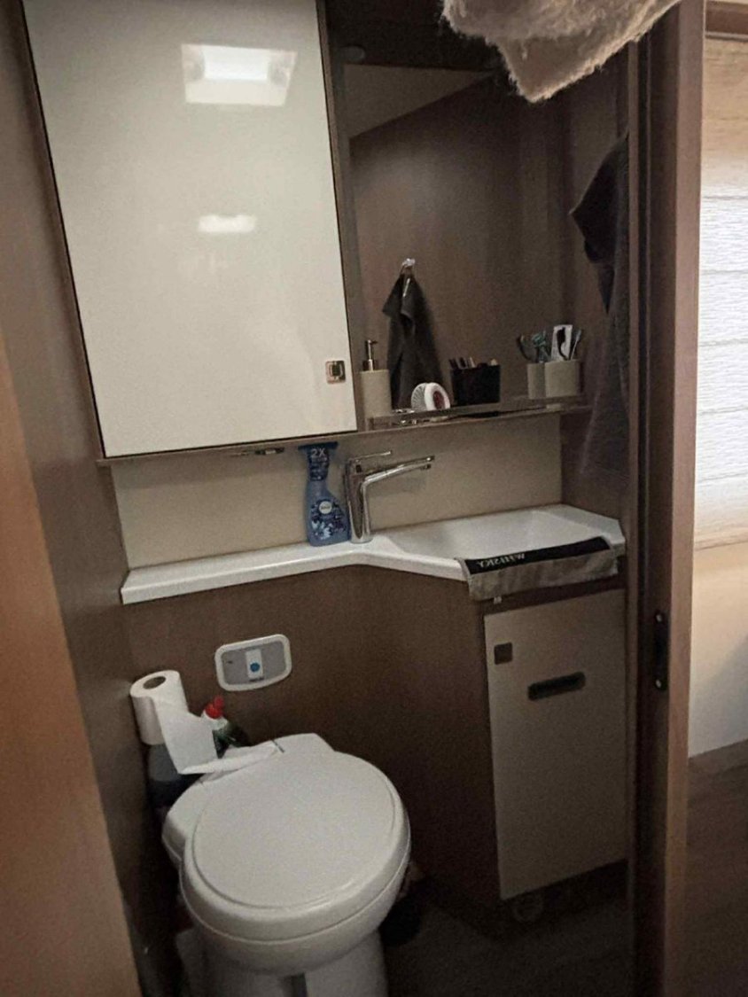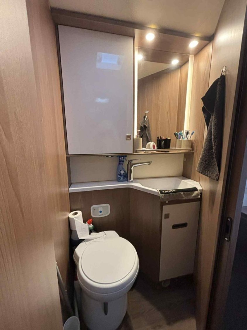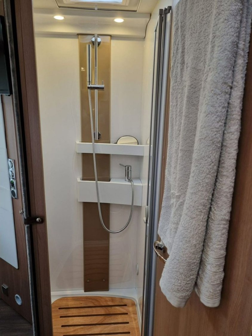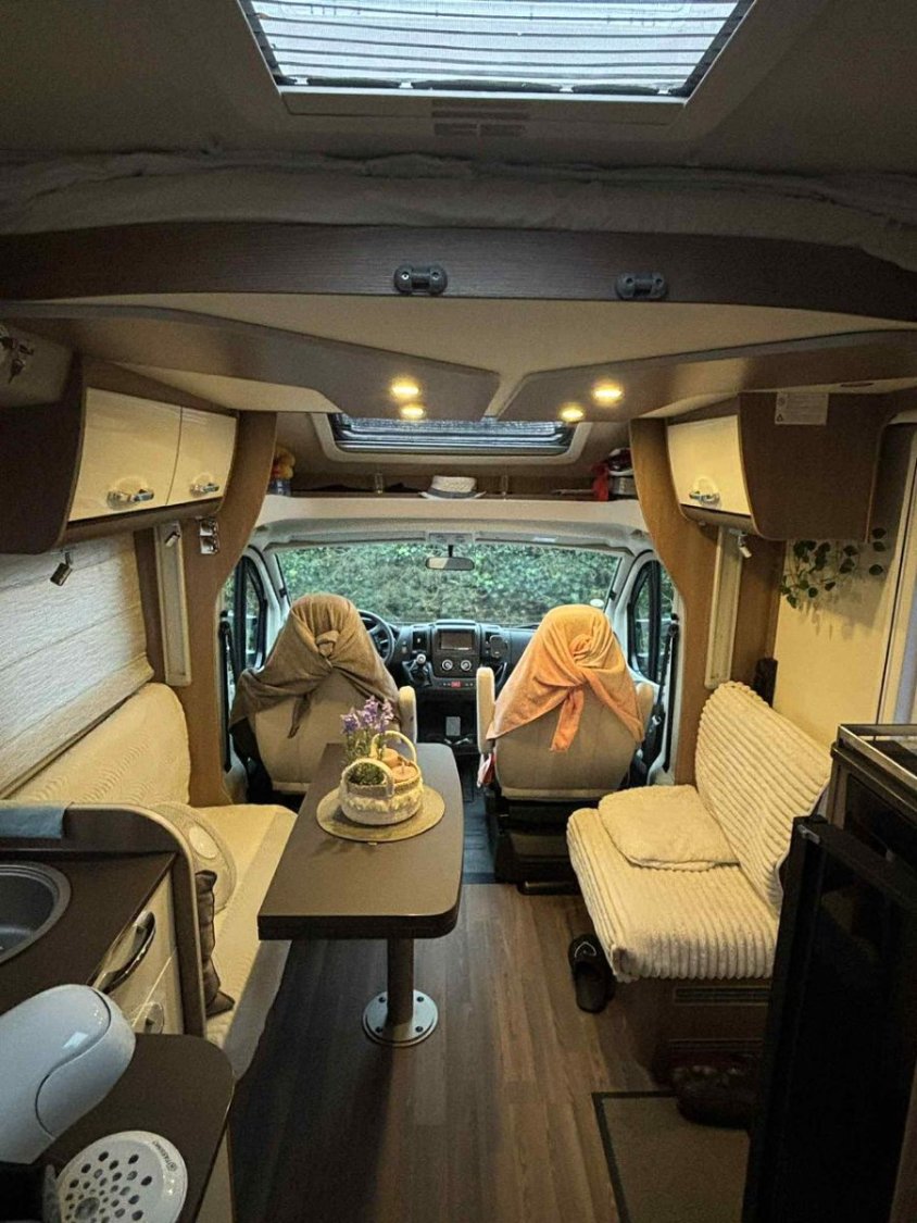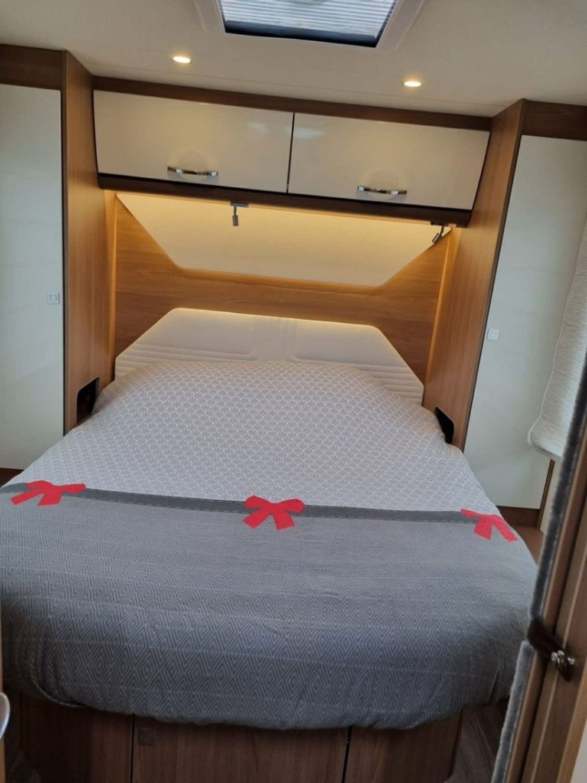 Le camping-car est équipé du chauffage et chauffe-eau TRUMA, d’un double plancher avec rangements, d’une batterie cellule 95 Ah et d’un panneau solaire Skyroof.