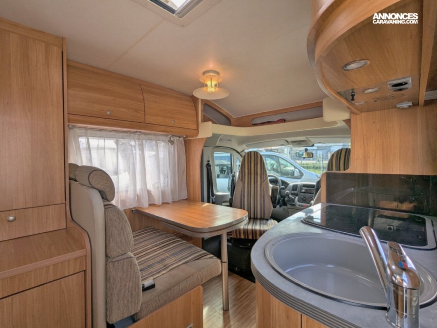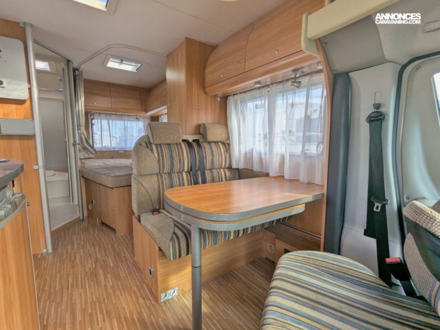 Camping-car profilé compact sur Fiat 2,3 JTD 130 CV BV6 avec salle d'eau/WC et douche séparée arrière, lit à la française, cuisine latérale avec frigo et plaque de cuisson 2 feux, et salon avant avec sièges pivotants.