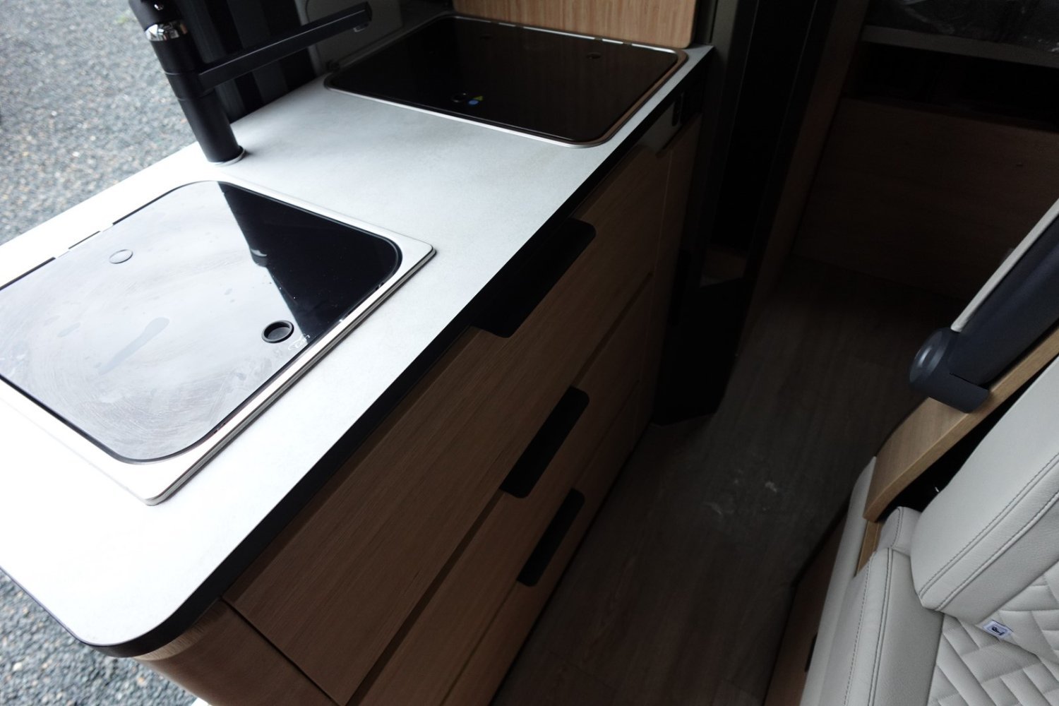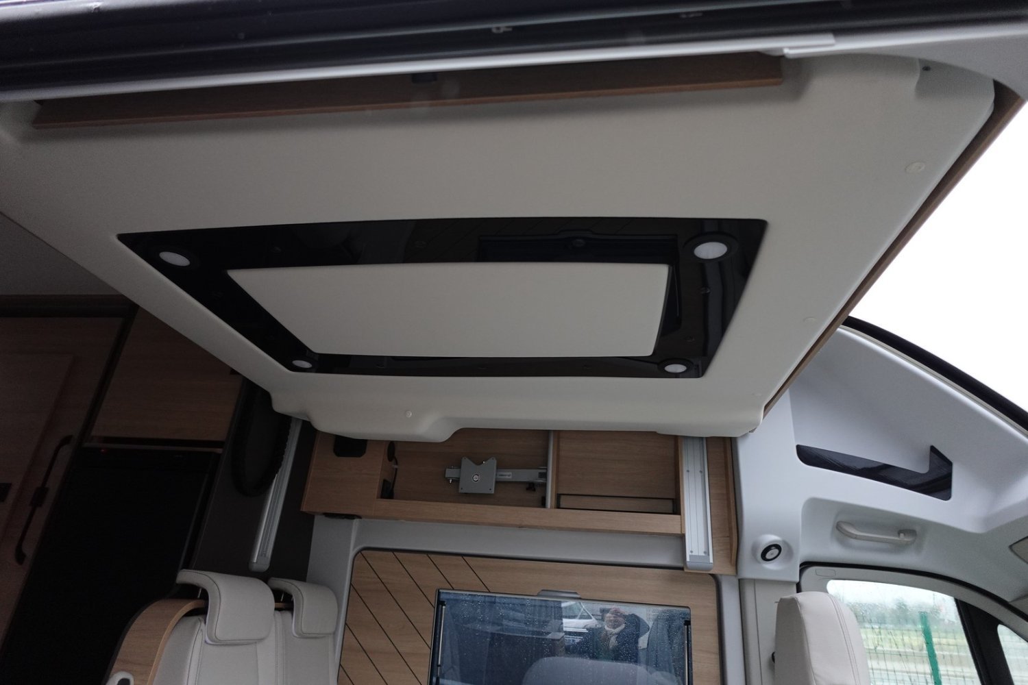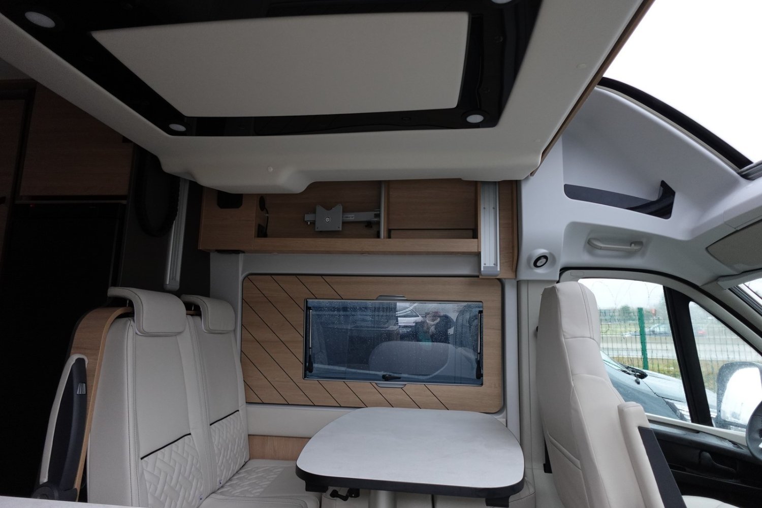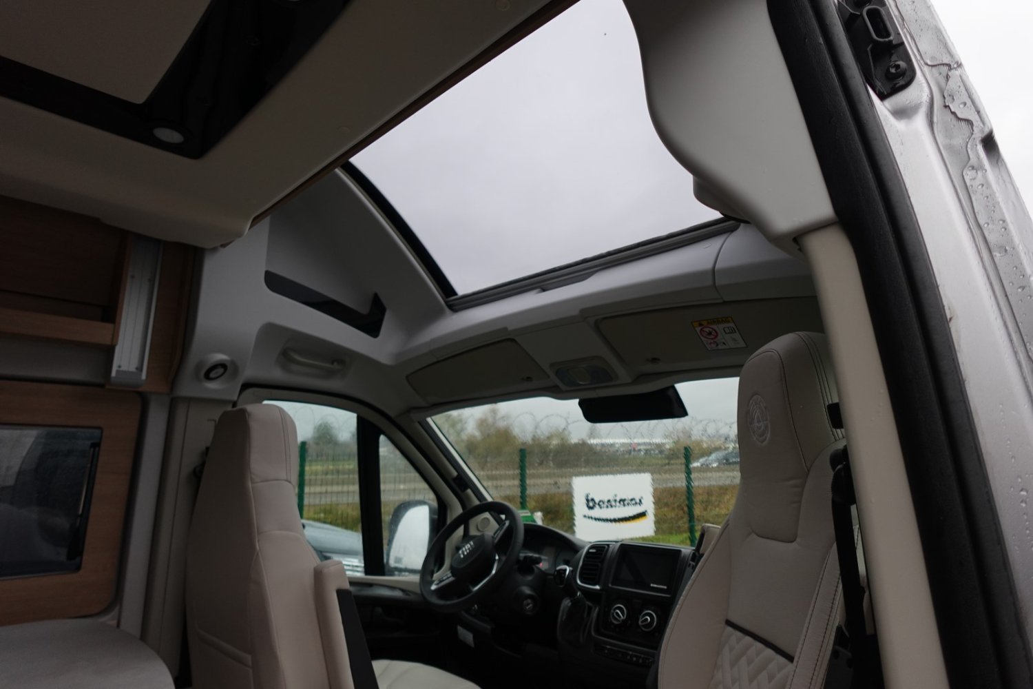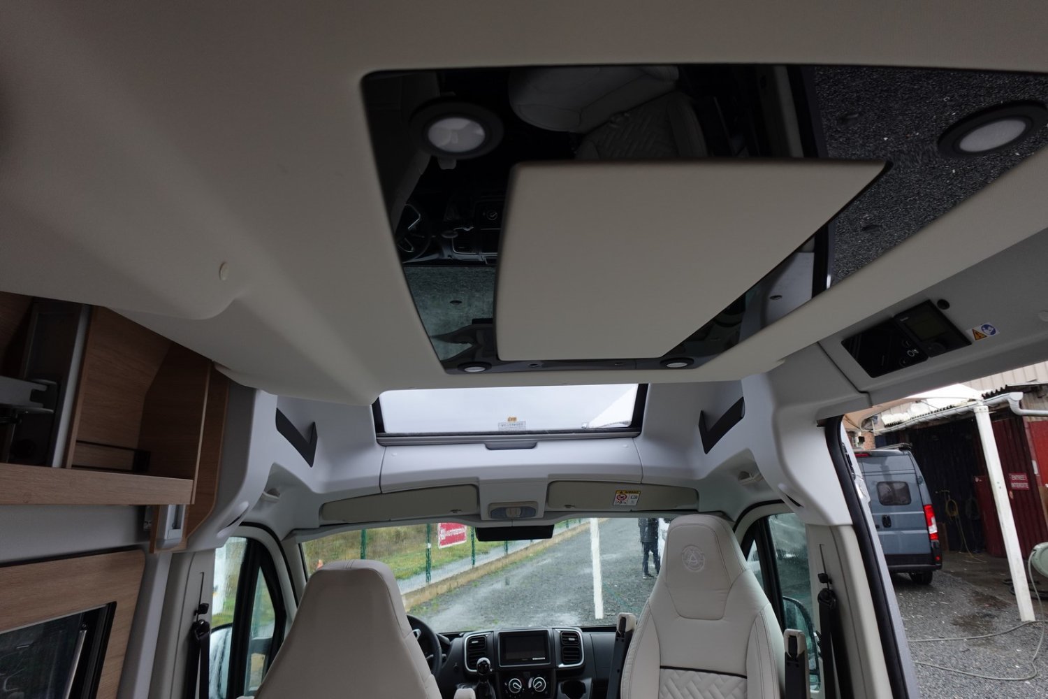 (Ambiance mobilier au choix, Sellerie au choix, Truma Combi 4 DIESEL avec kit altitude et commande de chauffage CP PLUS, 2ème batterie cellule AGM, Jantes 16 pouces en alliage léger, Volant cuir, Habillage gris sur aérateurs, TPMS, Feux avant 100 % LED, Allumage automatique des feux et des essuie-glaces, Frein de stationnement électrique, Pare-chocs avant couleur carrosserie, Skid plate noire, Feux anti-brouillard, Peinture métallisée Gris Artense, Toit panoramique SKYVIEW, Renfort pneumatiques suspension essieu arrière, Panneau solaire 150 W, Déco Saphir, Prise gaz extérieure)