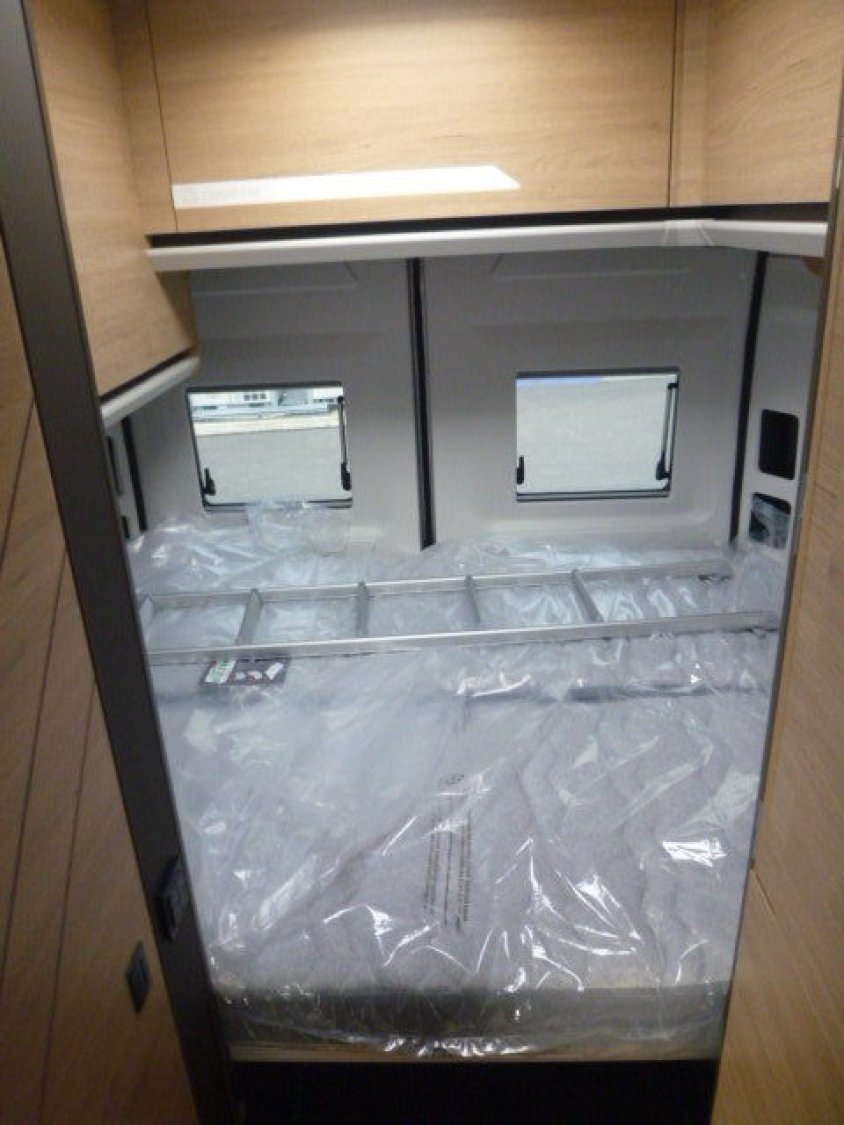 Cuisine en long, Douche indépendante, Lit arrière transversal, lit pavillon, Maxi salon, Salon avant sièges pivotants, Salon en L, WC Cassette.