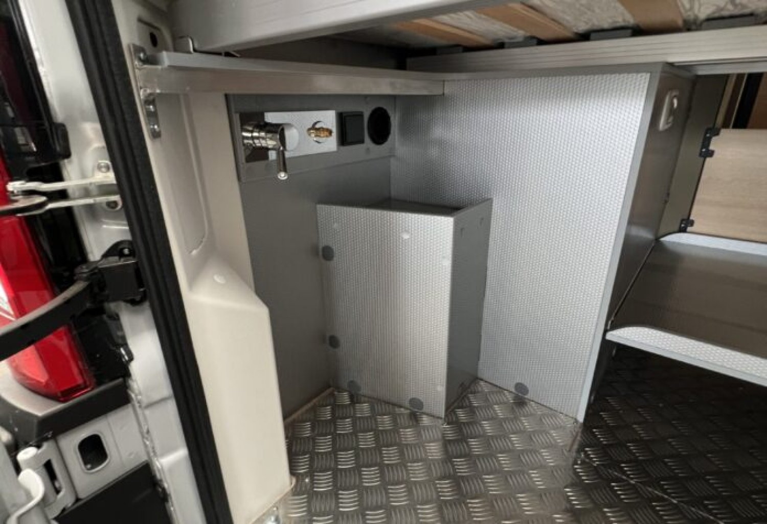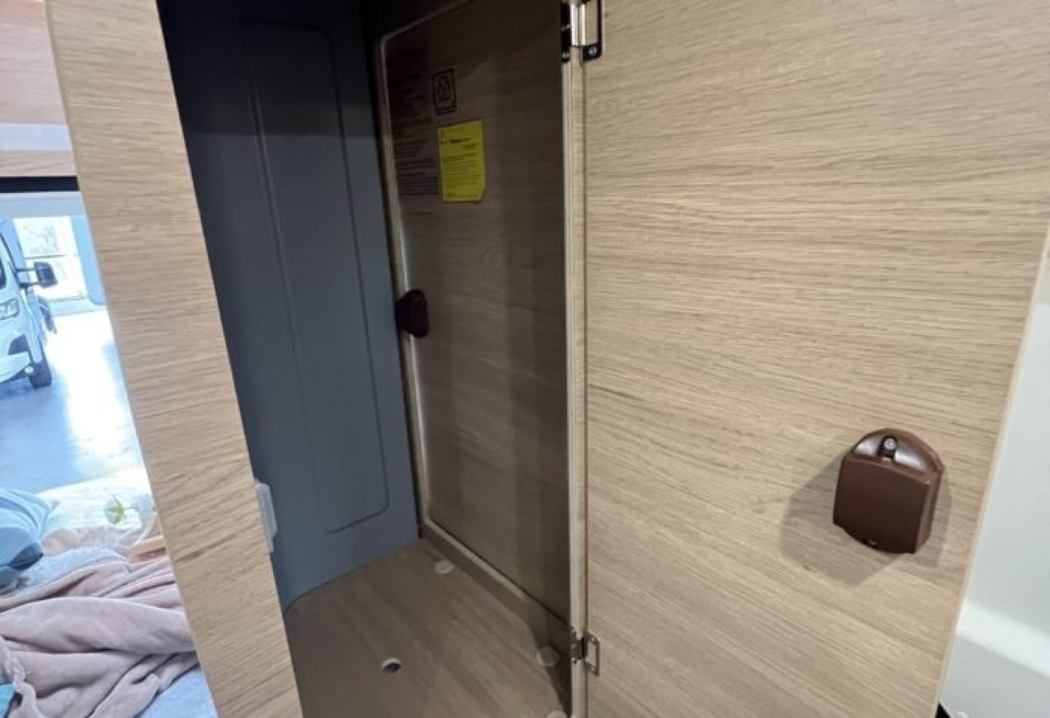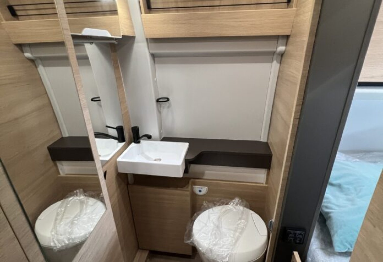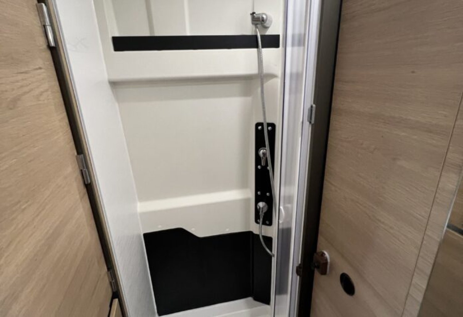 FOURGON HAUT DE GAMME 5M99 AVEC LIT TRANSVERSAL ET CABINE DE DOUCHE SEPAREE DU CABINET DE TOILETTE