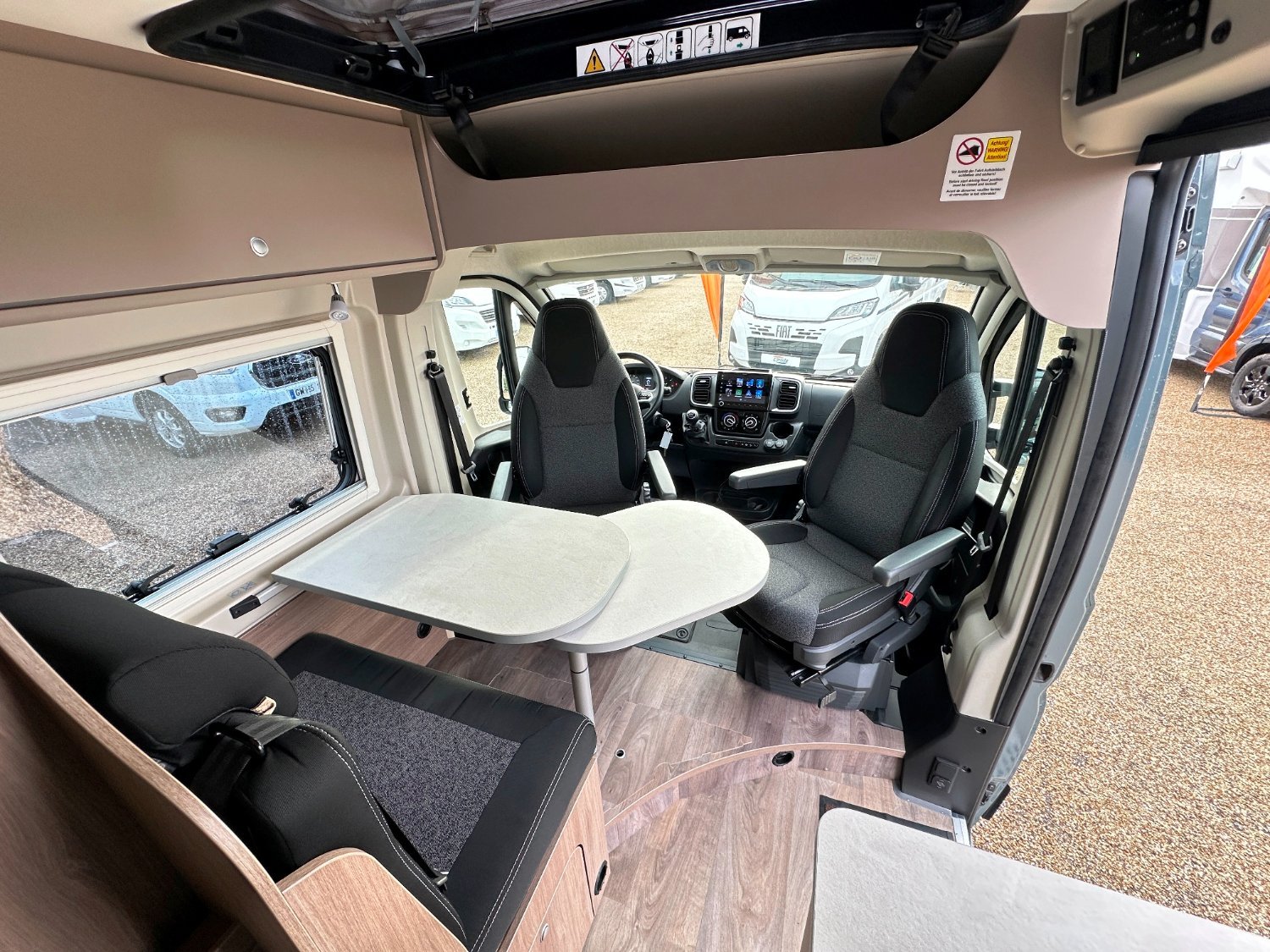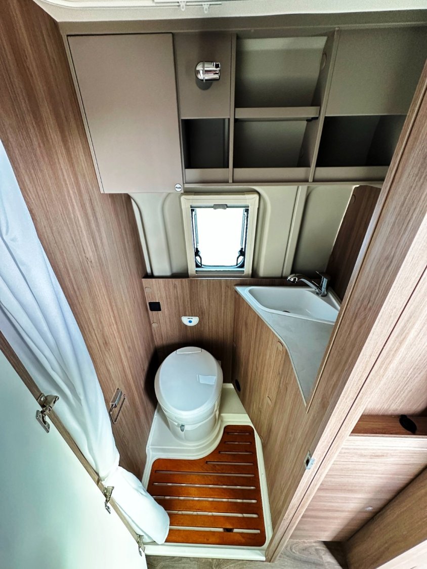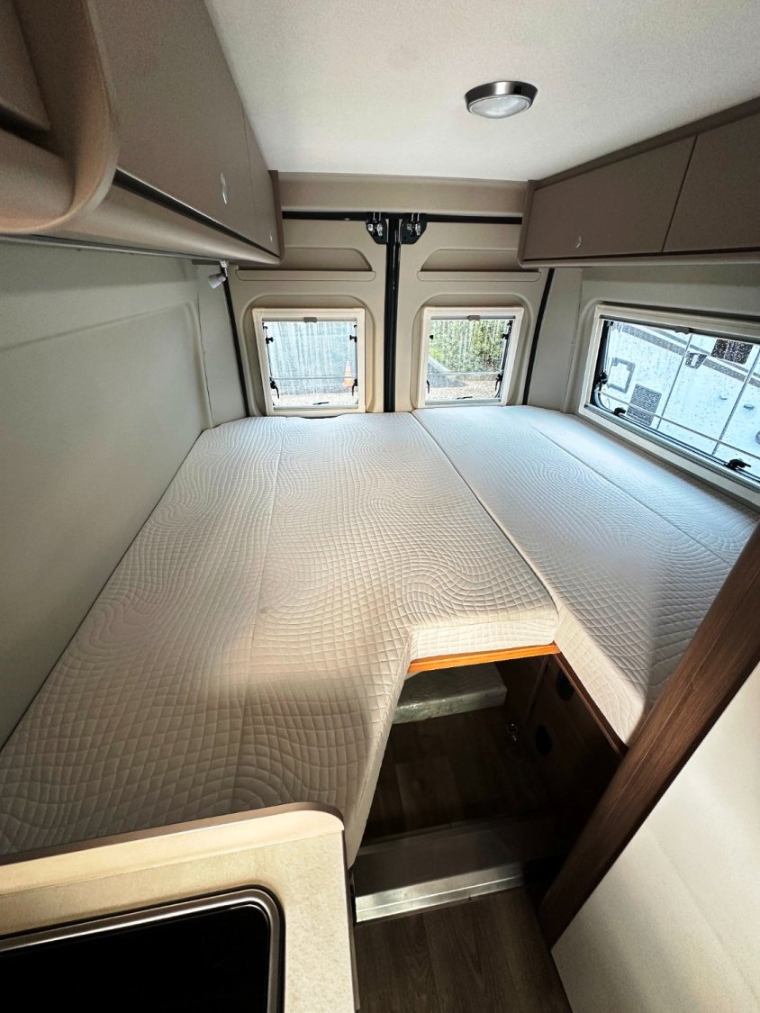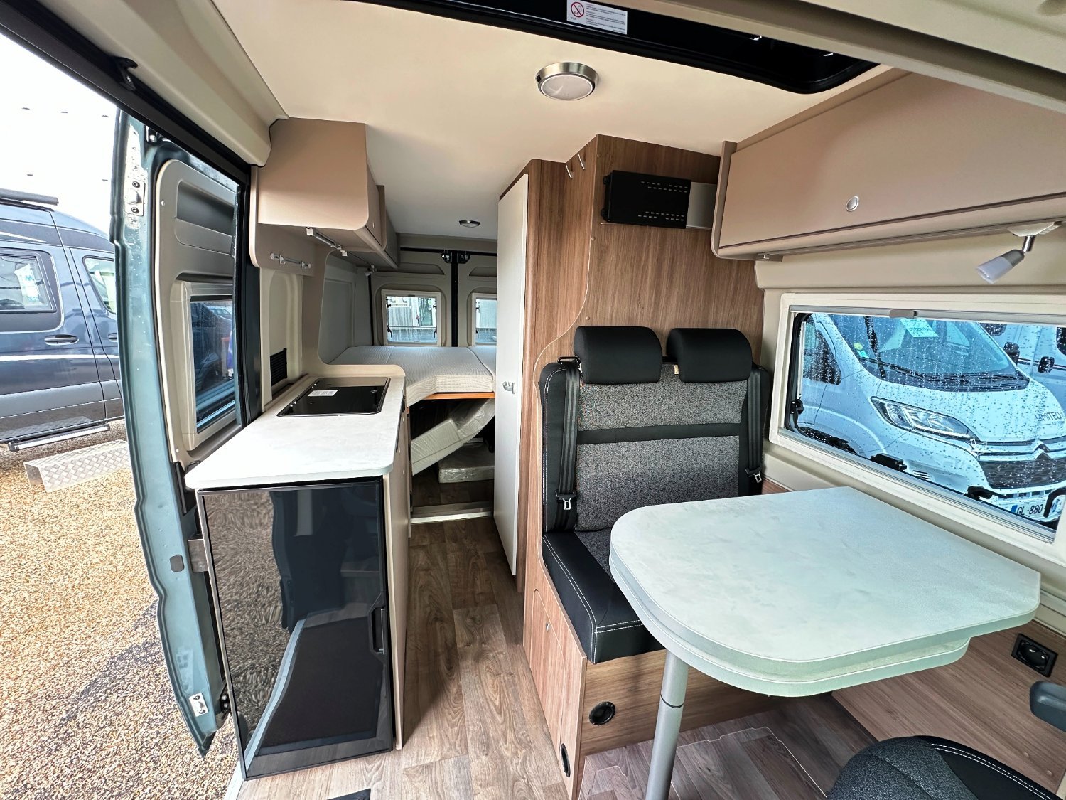 Fourgon Carado (6.36 M), lits jumeaux (possibilité de dégager le couloir), salle de bain avec douche intégrée, salon avant avec sièges pivotant, table centrale, cuisine droite équipée de nombreux rangements avec frigo par compression, toit relevable accueillant un vaste lit supplémentaire en 140×190 cm.