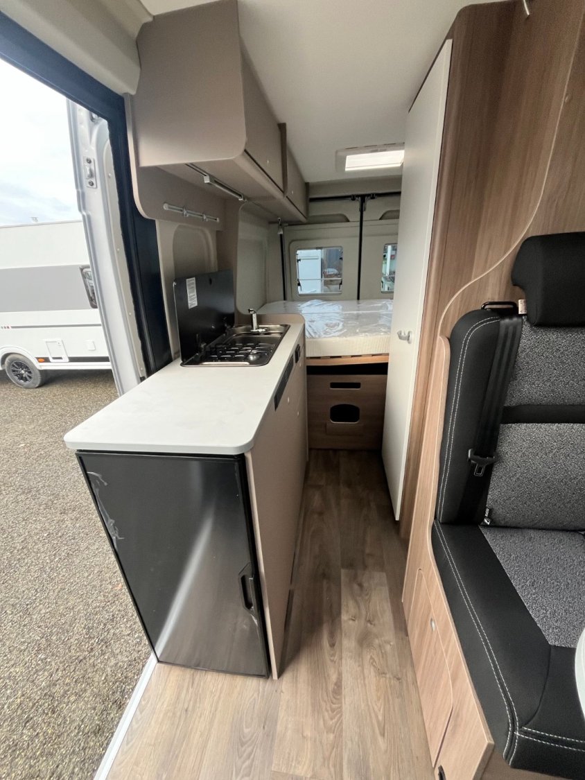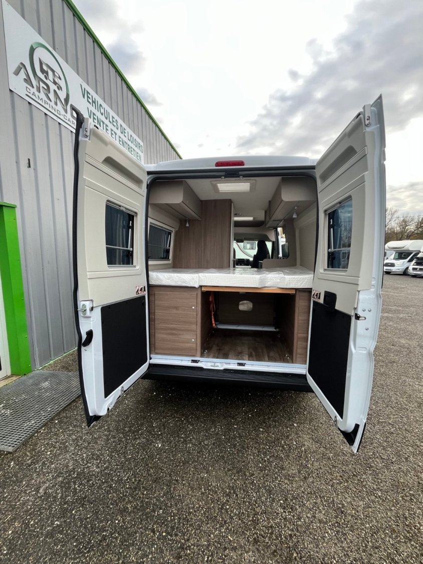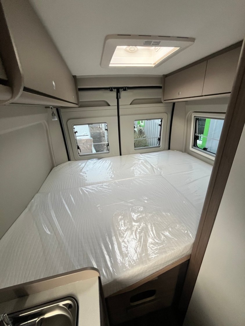 Fourgon Neuf CARADO CVE 600 collection 2026 avec Lit Transversal et Lit sur le salon pour 4 personnes.