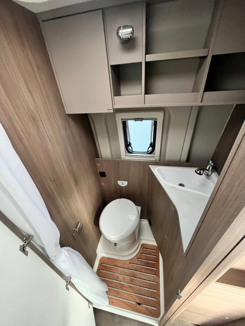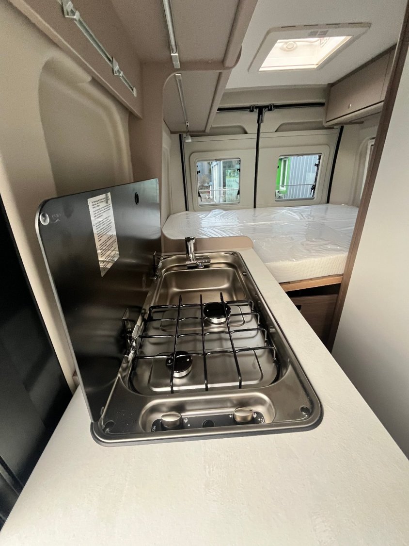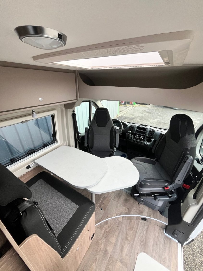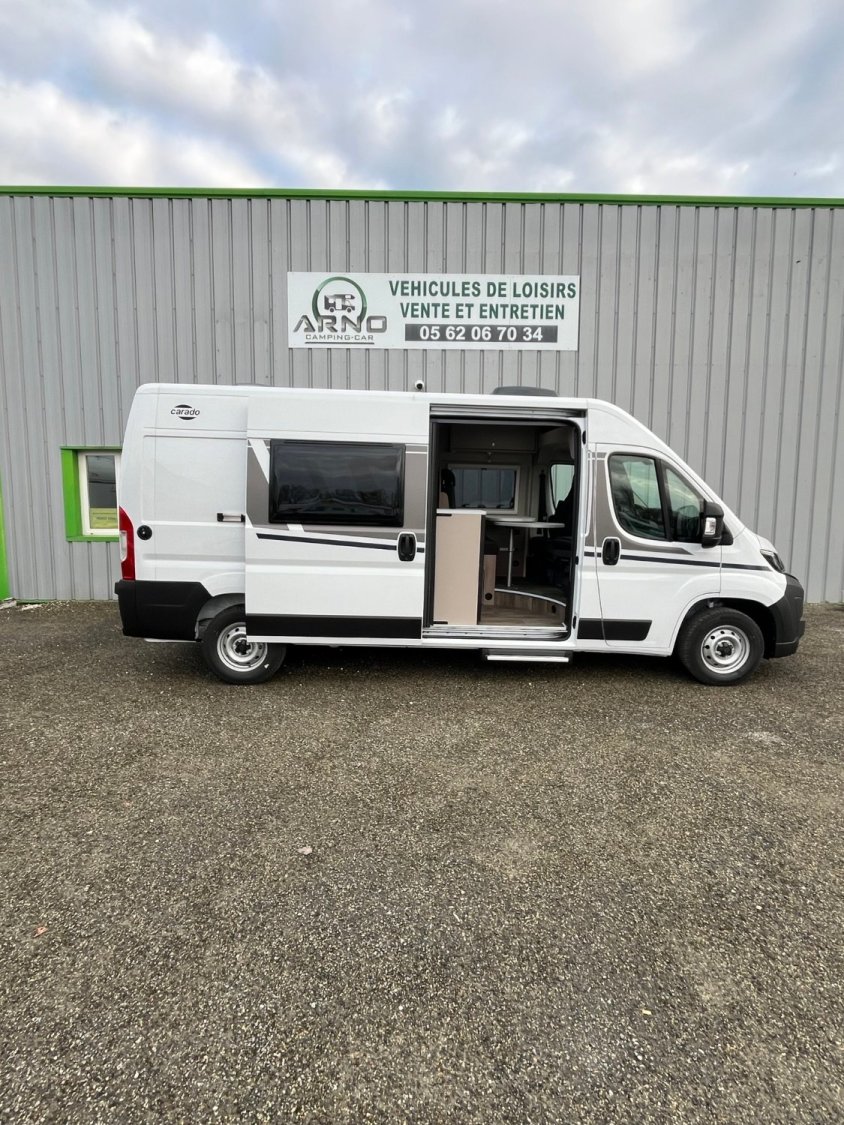 Fourgon Neuf CARADO CVE 600 collection 2026 avec Lit Transversal et Lit sur le salon pour 4 personnes.