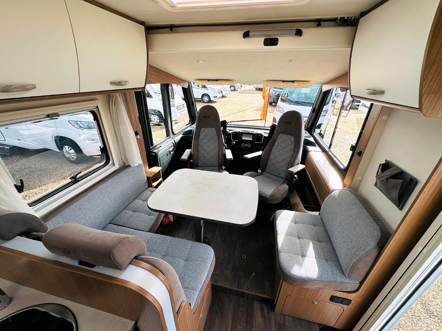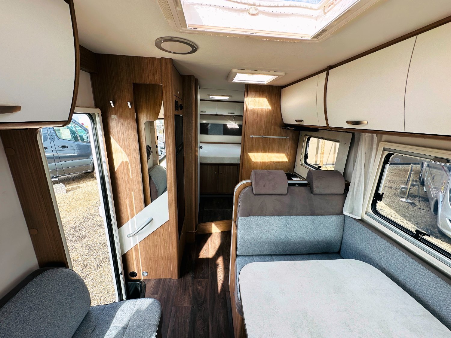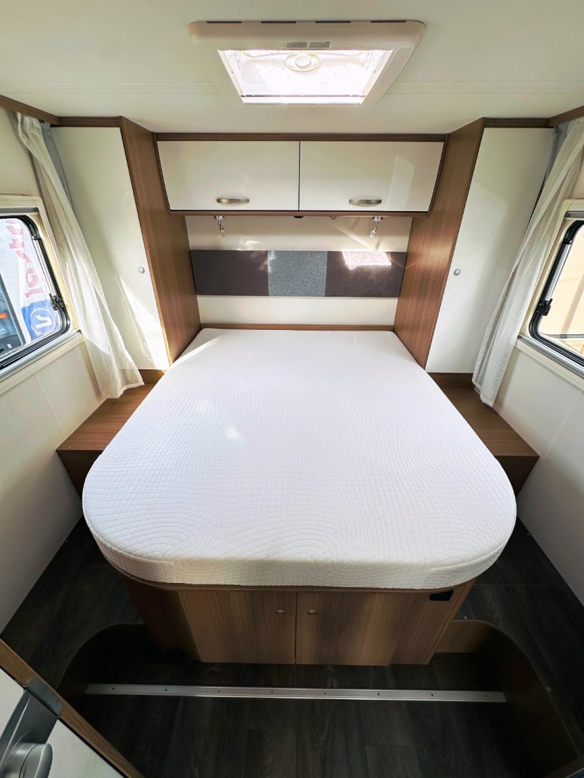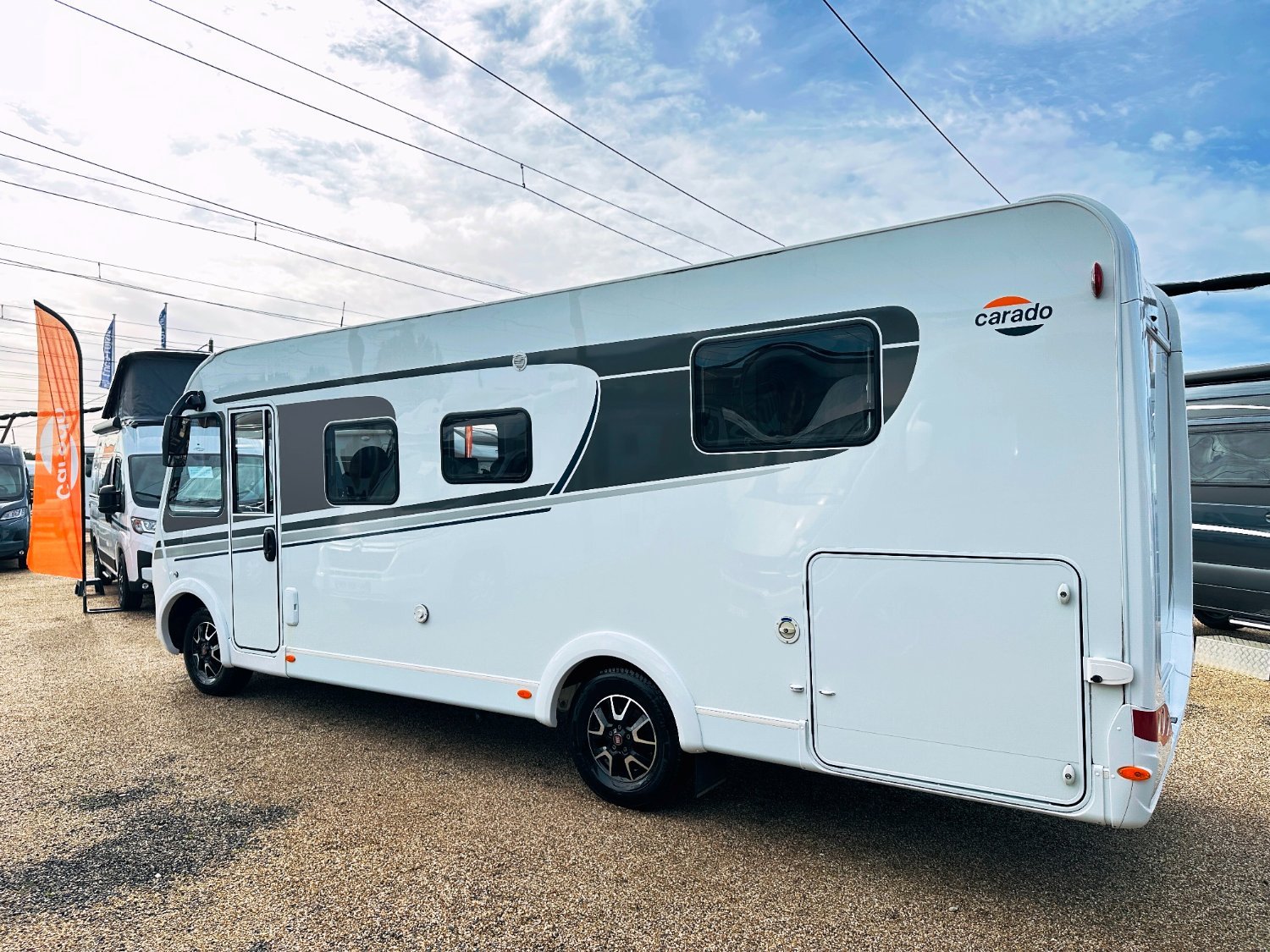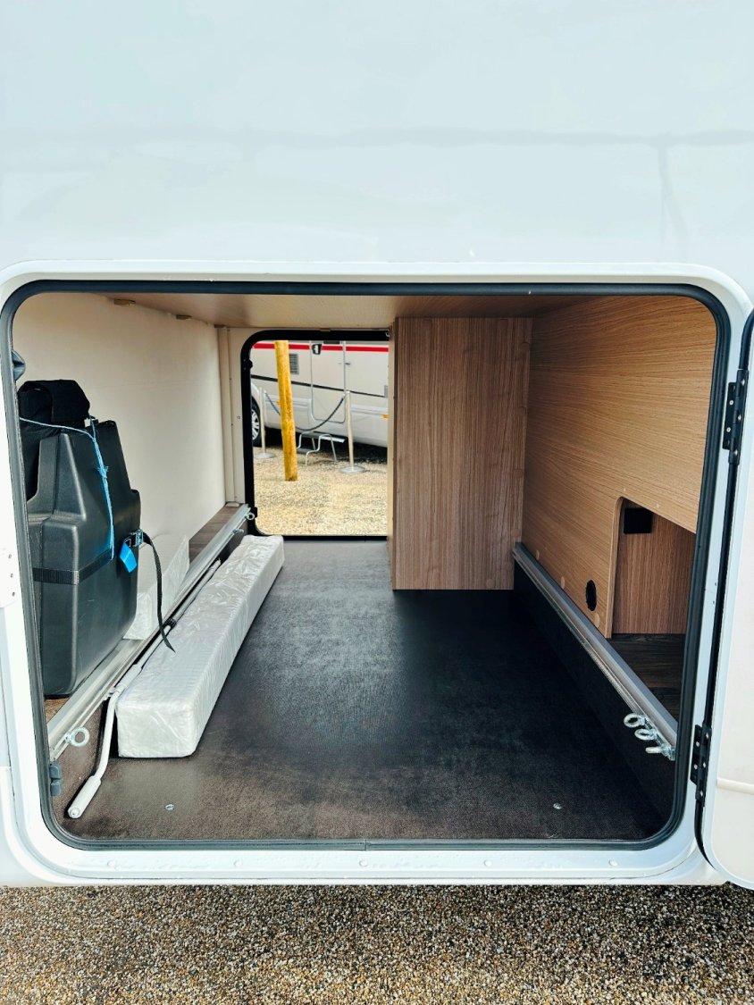 Intégral Carado, lit central (150 Cm), vaste soute garage (plusieurs vélos adultes), 4 couchages, salle de bain avec grande douche entièrement séparée, cuisine spacieuse et toute équipée, vaste salon avant avec sièges pivotant et table centrale convertible en un couchage d’appoint + lit pavillon en cabine pour deux adultes.
