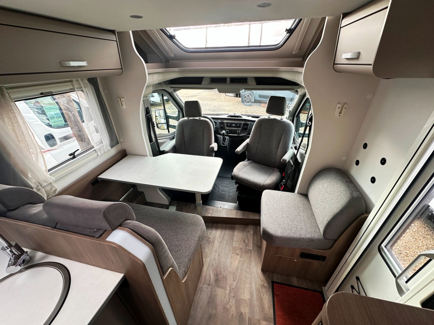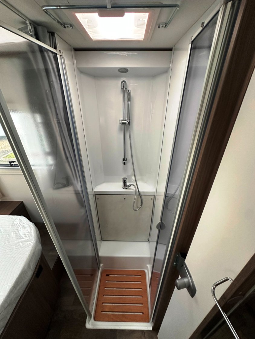 Profilé Carado, lit central en 150 cm sur soute (plusieurs vélos), 4 couchages, salle de bain avec grande douche entièrement séparée, fermeture chambre arrière, cuisine spacieuse et toute équipée, vaste salon avant avec sièges pivotant et table centrale + lit pavillon pour deux adultes.