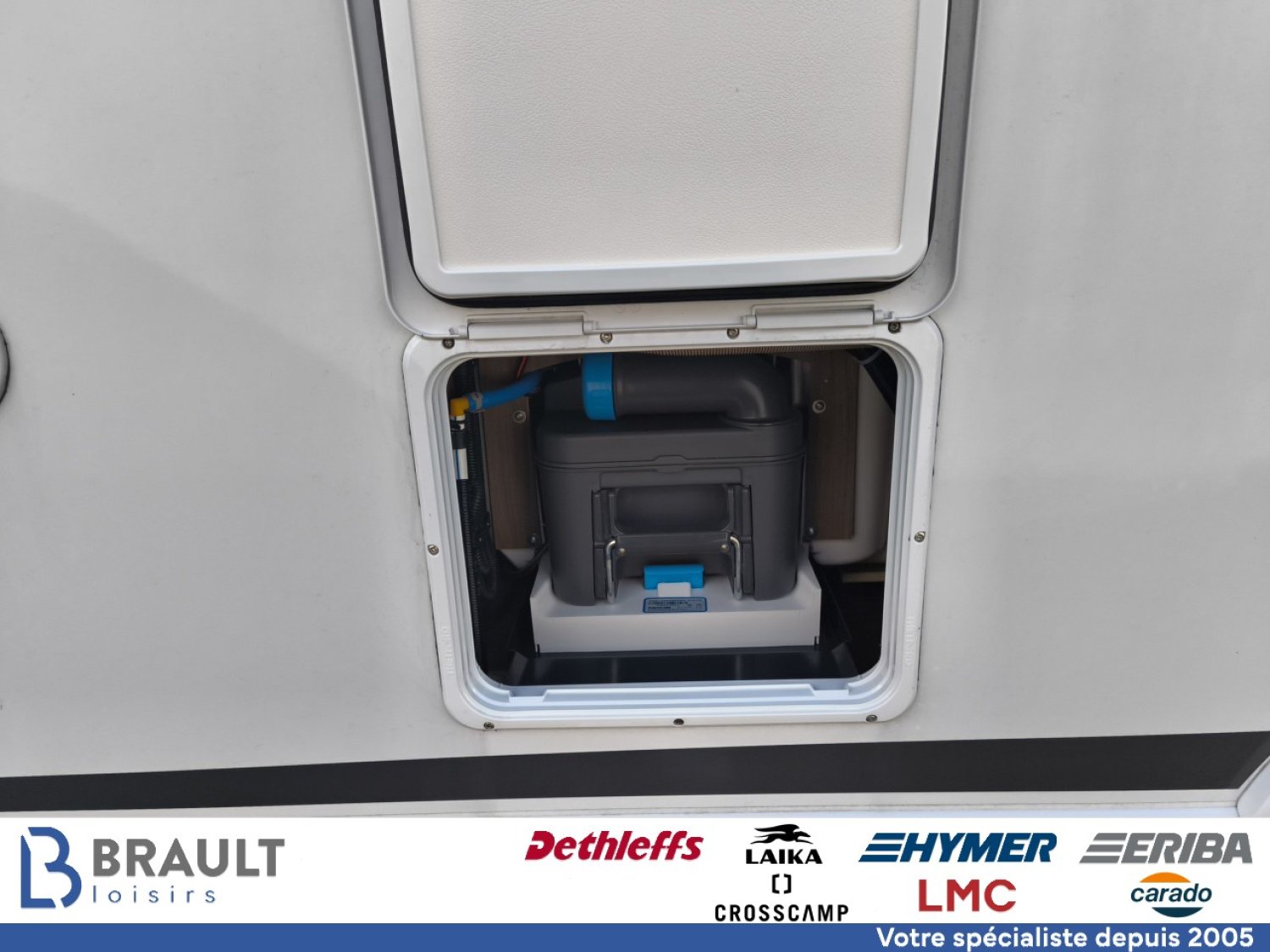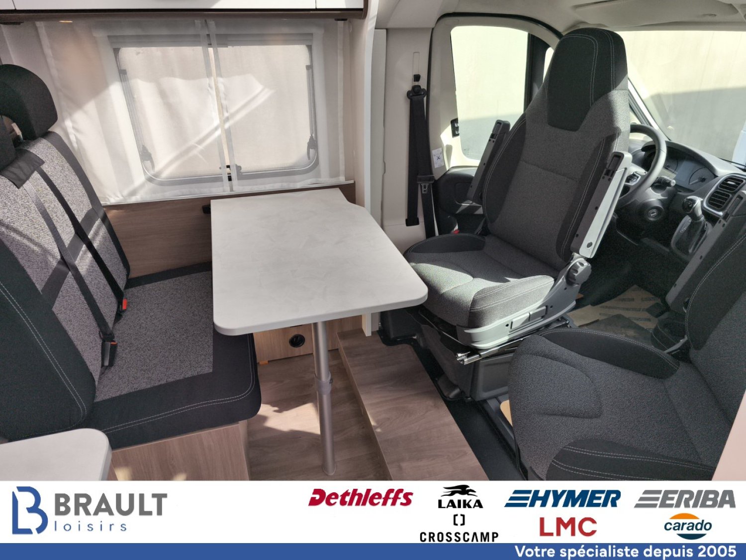 Pack Confort | Couleur extérieure gris Artense métallisé, Stores plissés de cabine, Toit panoramique de cabine, Coloris spécifique des portes des meubles de pavillon en blanc Cosy, Sérigraphe Pro +, Store extérieur 4 m, Réservoir eaux usées isolé, deuxième trappe extérieur