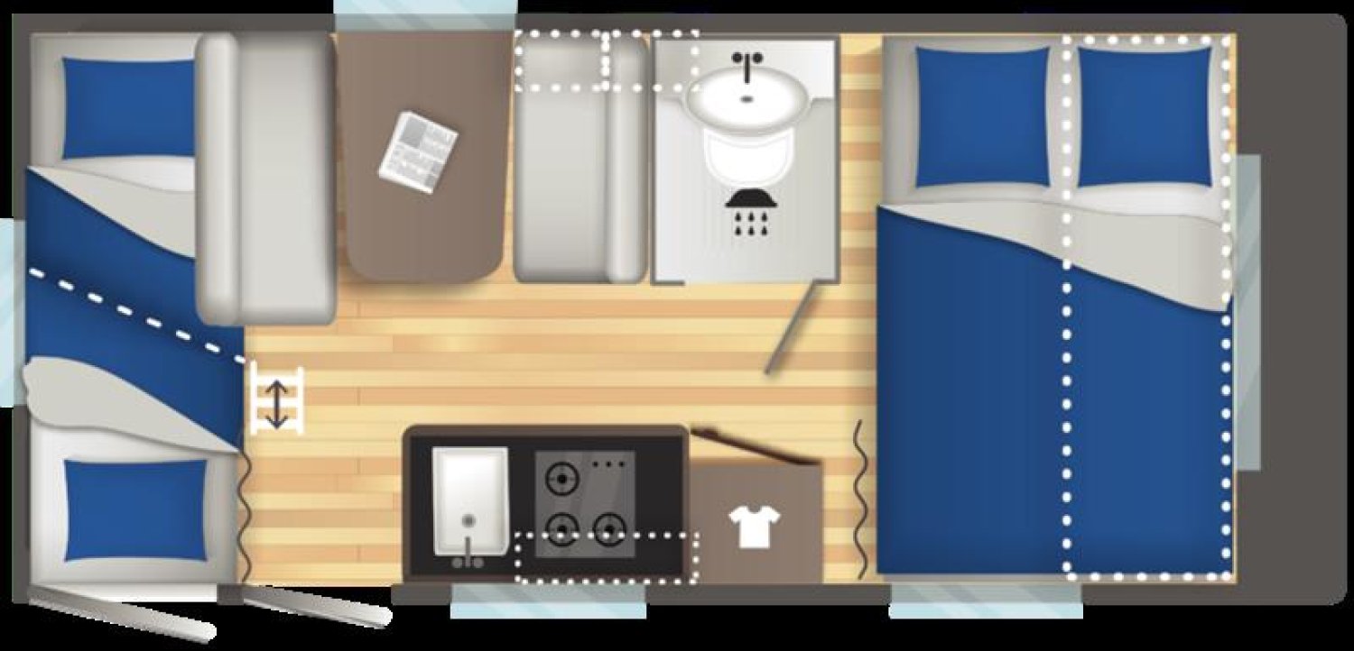 Transformateur 23012V avec disjoncteur, Vérins rallongés à l'avant, Soute à vélos (cm) : 100x65, Toit polyester, WC à cassette pivotant manuel, 3ème feu stop, Bac à douche, Baie arrière, Baies ouvrantes double vitrage, Combiné réchaud 3 feux et cuve évier inox avec couvercle ver, Compartiment bouteille à gaz, Dimensions couchage arrière (cm) : (61x212)x2, Dimensions couchage avant (cm) : 137x205, Dimensions couchage central (cm) : 11096x168, Eclairage intérieur LED, Eclaireur d'auvent LED, Parois latérales polyester, Prises 230V : 3, Prises USB, Pré-équipement Climatiseur, Pré-équipement TV: prises antenne et 230V, Réfrigérateur à compression XL FREEZE : 150L, Store combi occultant + moustiquaire, Rail auvent, Roue jockey