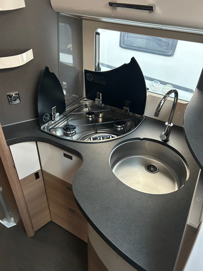 Lit central avec couchage jusqu'à 1,95M - Salon en L avec table pivotante 360° - Cuisine d'angle confort avec comptoir de cuisine surélevé faisant office de séparation et de plan de travail additionnel - grand garage scooter avec une charge de 350Kg.