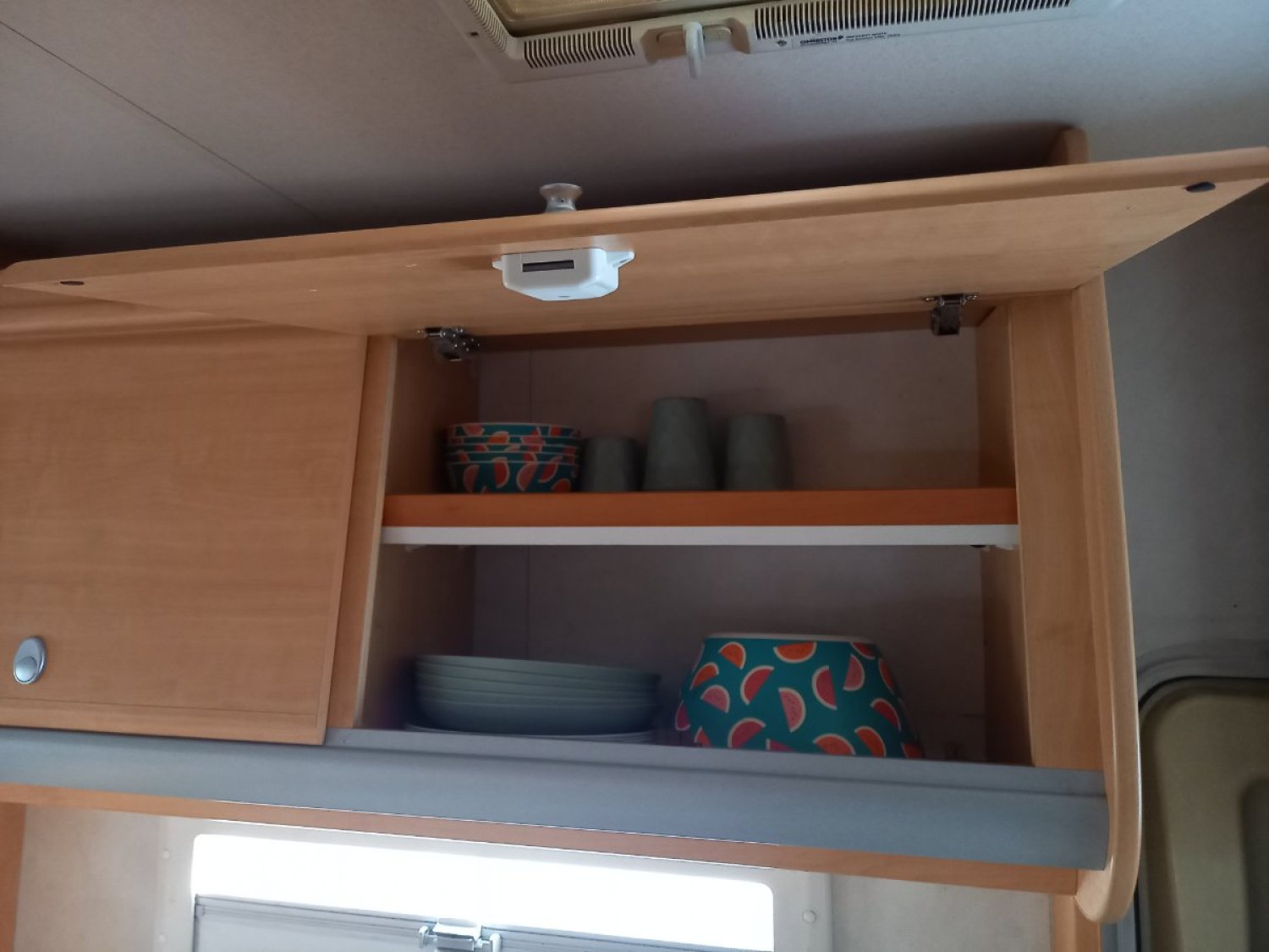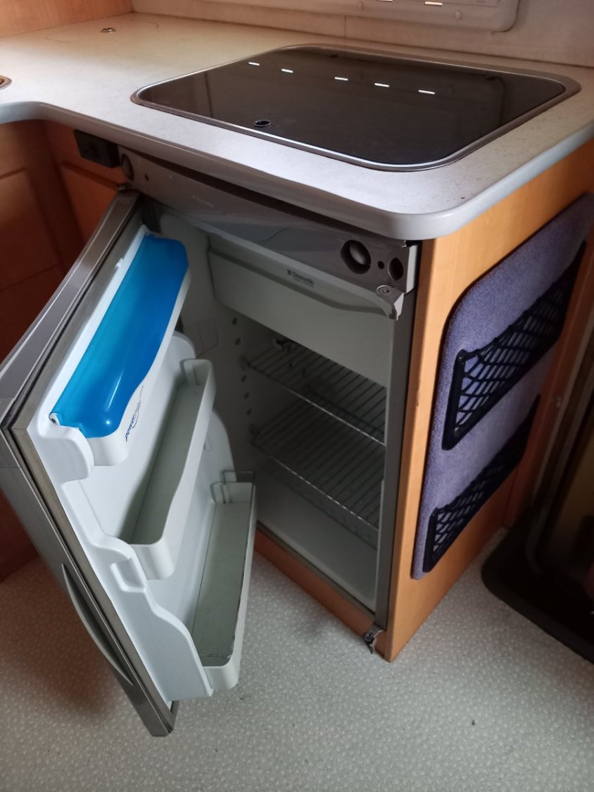 Cuisine séparée du salon avec évier encastré et robinetterie inox, gazinière 3 feux (système double bouteille de gaz) + poubelle intégrée, frigo gaz Dometic avec freezer 80l,