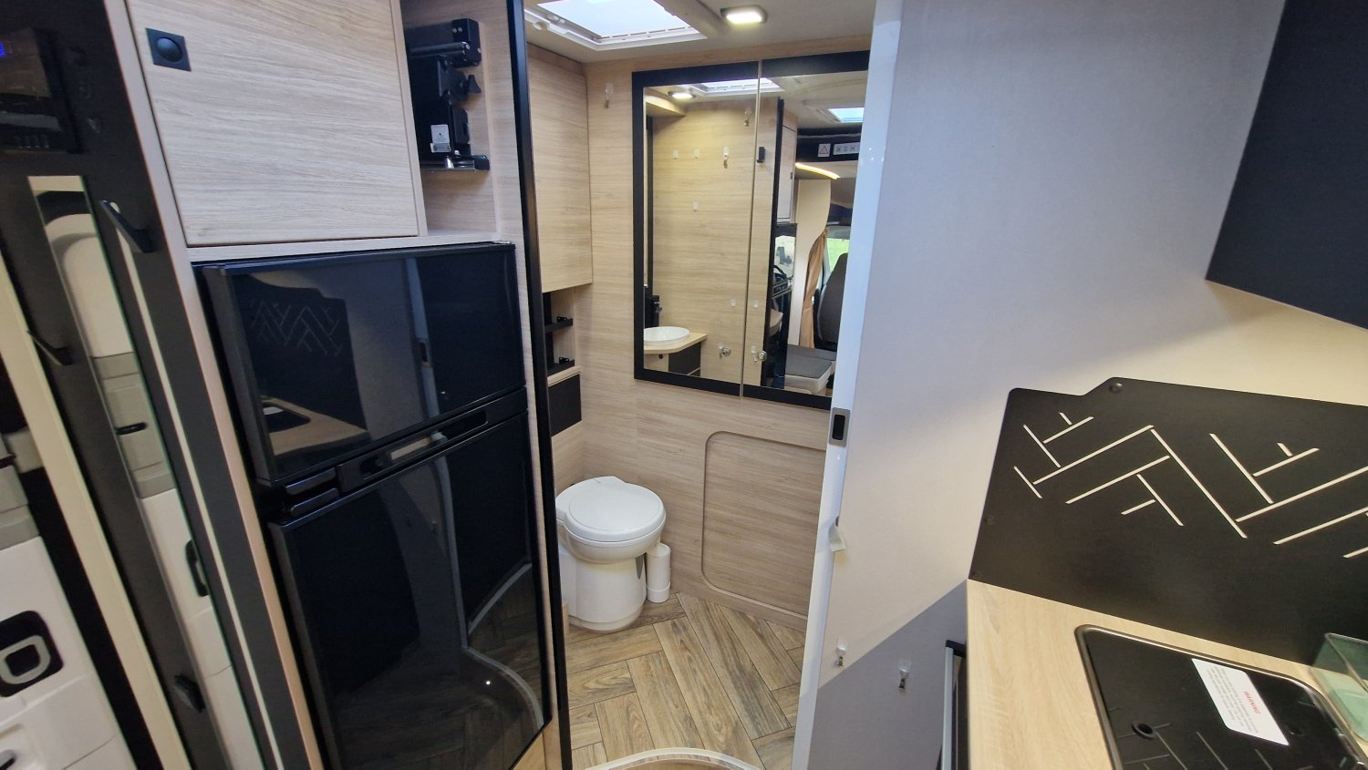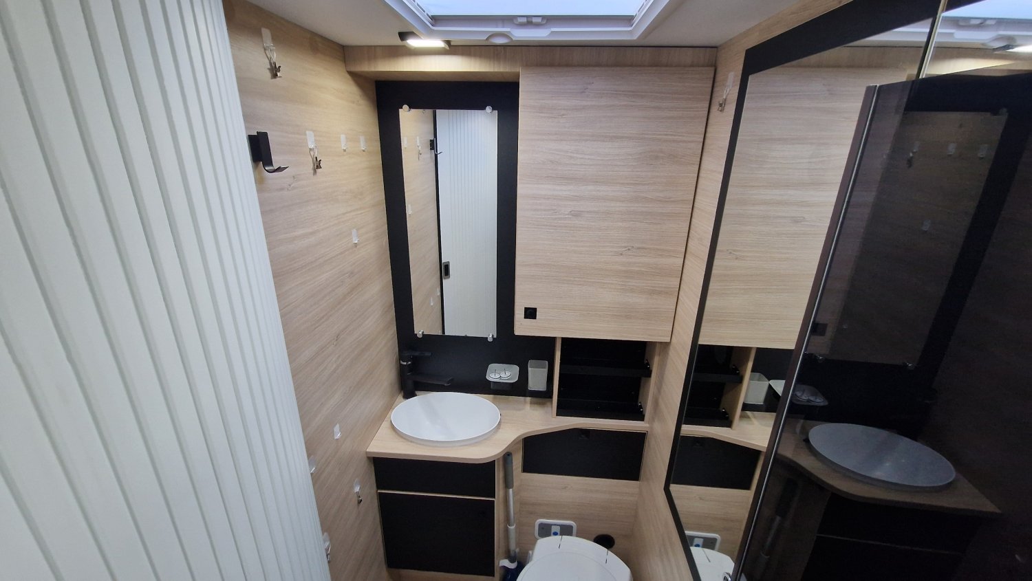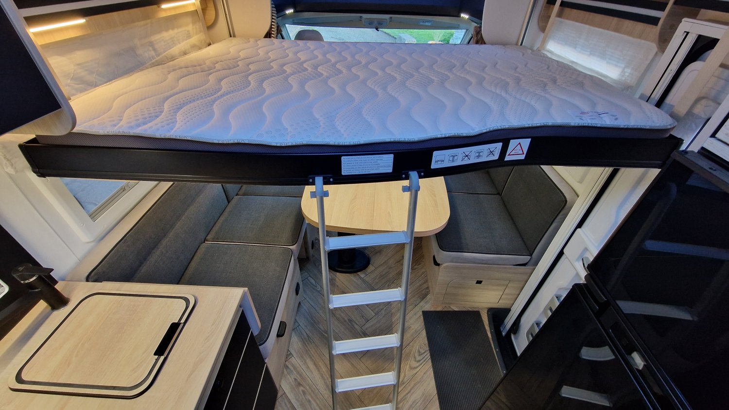 Une implantation idéale pour un couple pour voyager tout confort en toutes saisons : un lit de plafond électrique 2 positions et un lit d'appoint convertible, une cuisine bien équipée avec un grand réfrigérateur / congélateur trimix, un maxi salon convivial en face à face et une salle d'eau indépendante traversante donnant accès à un grand Dressing très logeable.
