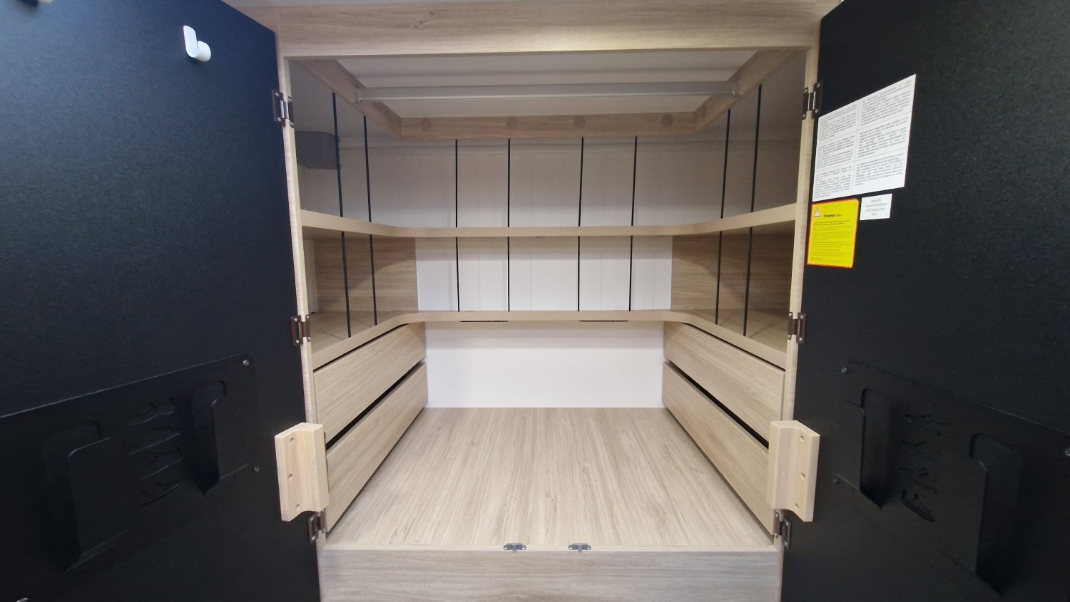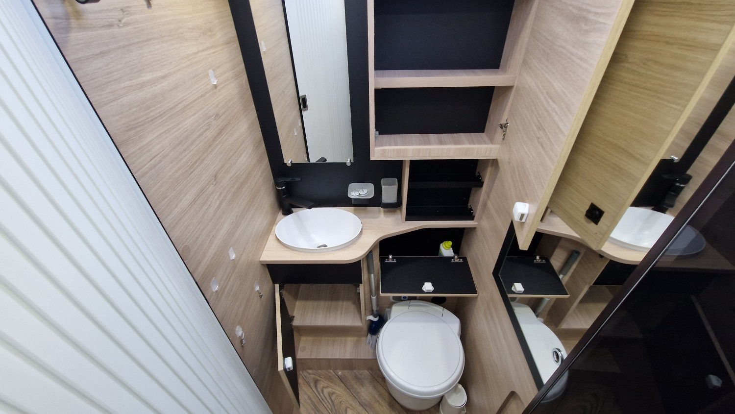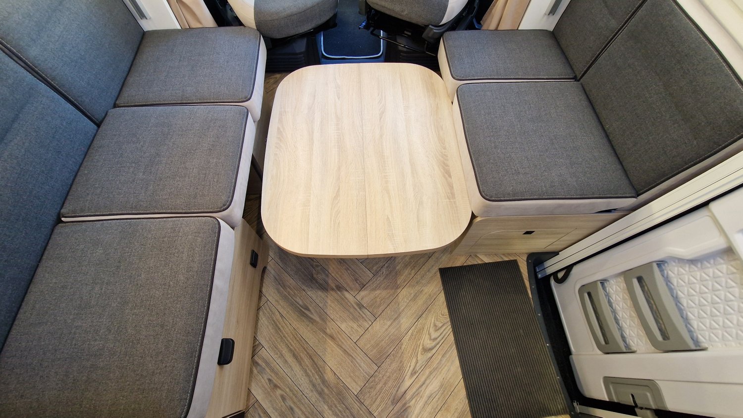Une implantation idéale pour un couple pour voyager tout confort en toutes saisons : un lit de plafond électrique 2 positions et un lit d'appoint convertible, une cuisine bien équipée avec un grand réfrigérateur / congélateur trimix, un maxi salon convivial en face à face et une salle d'eau indépendante traversante donnant accès à un grand Dressing très logeable.