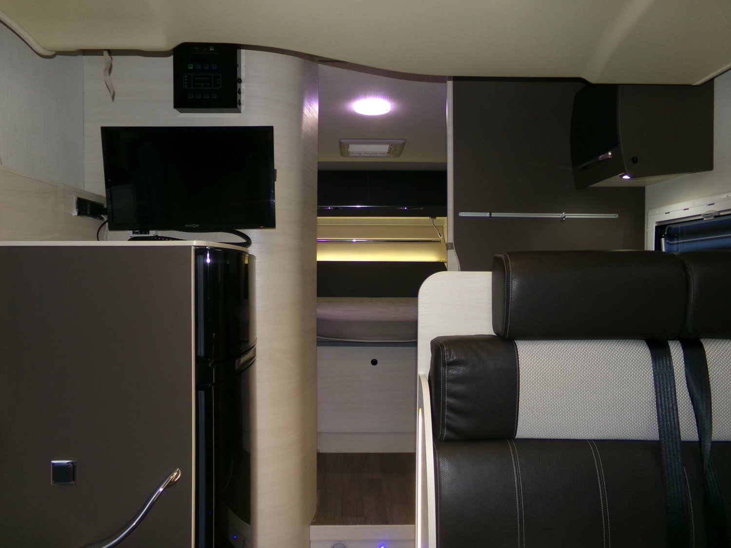 Tableau de bord luxe avec inserts alu, Régulateur de vitesse et limiteur, PANNEAU SOLAIRE, Technibox, Toit panoramique cabine ouvrant, Voie arrière élargie, Éclairage extérieur, STORE EXTERIEUR, Réglages hauteur lit permanent sur garage : Easy bed, Marche de la cellule isolée, Moustiquaire de porte, Pare-chocs peint, Pré disposition batterie cellule, Radio avec commandes au volant, Roues 16", Réfrigérateur gaz 12V/230V : 167L AES, PORTE VELOS X3, ANTENNE MANUELLE, CLIM CABINE, ALARME, IRP, Lanterneau avec moustiquaire, douche, Calandre brillante, Housse sièges cabine assorties tissus ambiance cellule, Caméra de recul avec écran sur rétroviseur, Chassis spécial camping-car, Chauffage combi diesel 4 kW, Chauffage utilisable en roulant, Climatisation cabine manuelle, Double airbag, ESP, Fenêtres double vitrage avec combiné stores moustiquaire, Bac à douche double bonde, Feux antibrouillard, Éclairage intérieur 100 % LED, TELE, DVD, ATTELAGE, Rétroviseurs dégivrants, réglables électriquement, CAMERA DE RECUL