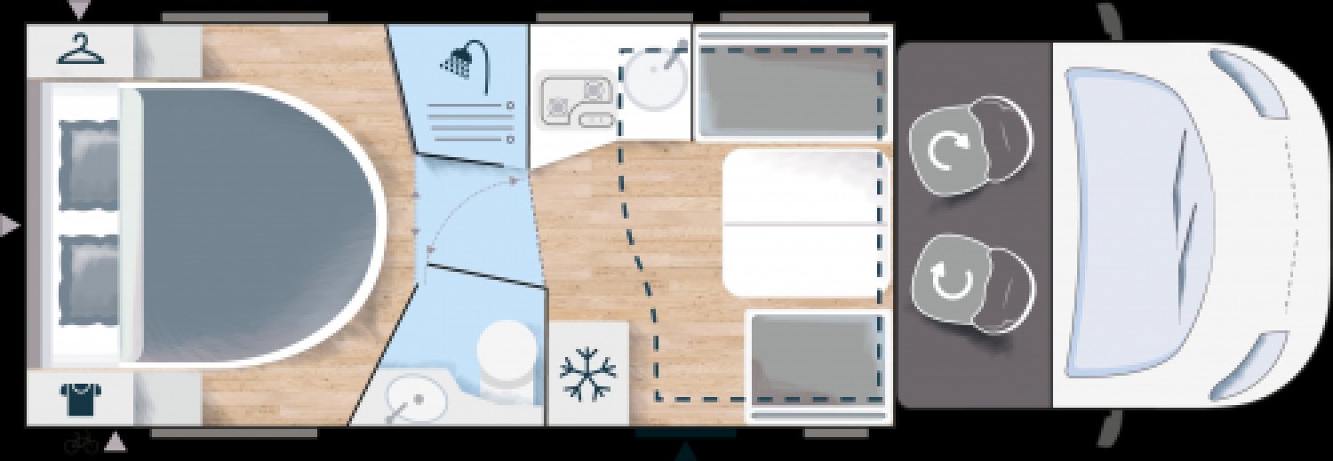 Fixations Isofix, Isolation marche d'entrée, Pare chocs avant peint, Climatisation manuelle cabine, Start & Stop, Eclairage d'auvent, Fenêtre double-vitrage avec combiné stores moustiquaire, Feux anti-brouillard, Fix and go, Housses de sièges cabine assorties à l'ambiance cellule, Hill descent control, Pneus 4 saisons, Traction +, Lanterneau panoramique (ou double lanterneau), Chauffage sur carburant utilisable en roulant, Double airbag, ESP, Pré-disposition panneau solaire, Voilages, Prise USB/USB-C, Pré-équipement TV, Penderie, Porte d'entrée avec fermeture centralisée porteur cellule, Toit panoramique cabine ouvrant, Rideaux de séparation cabine/cellule, Régulateur / limiteur de vitesses, Rétroviseurs élecrtiques dégivrants, Sièges de cabine pivotants réglables en hauteur, Précâblage caméra de recul