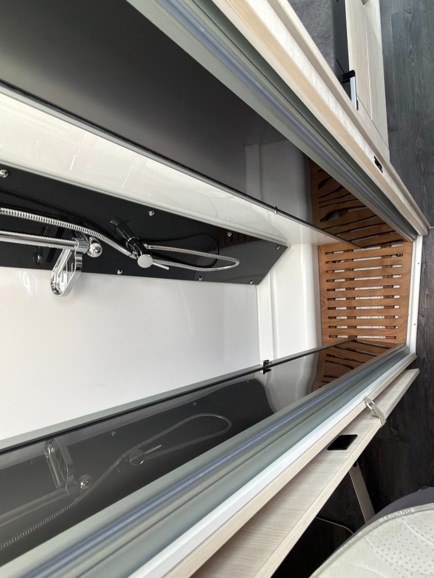 Feux antibrouillards, Panneau solaire, Prise de gaz extérieure, Régulateur / limiteur de vitesse, Store intérieur cabine, Éclairage extérieur porte d'entrée, Rétroviseurs électriques dégivrants, Moustiquaire de porte, Climatisation manuelle de cabine, Double airbag, Douchette extérieure, ESP, Jantes alliage 16’’ noires, kit pose 2ème batterie, Boite automatique 6 rapports, Caillebotis de douche, Chauffage sur carburant utilisable en roulant, Store extérieur